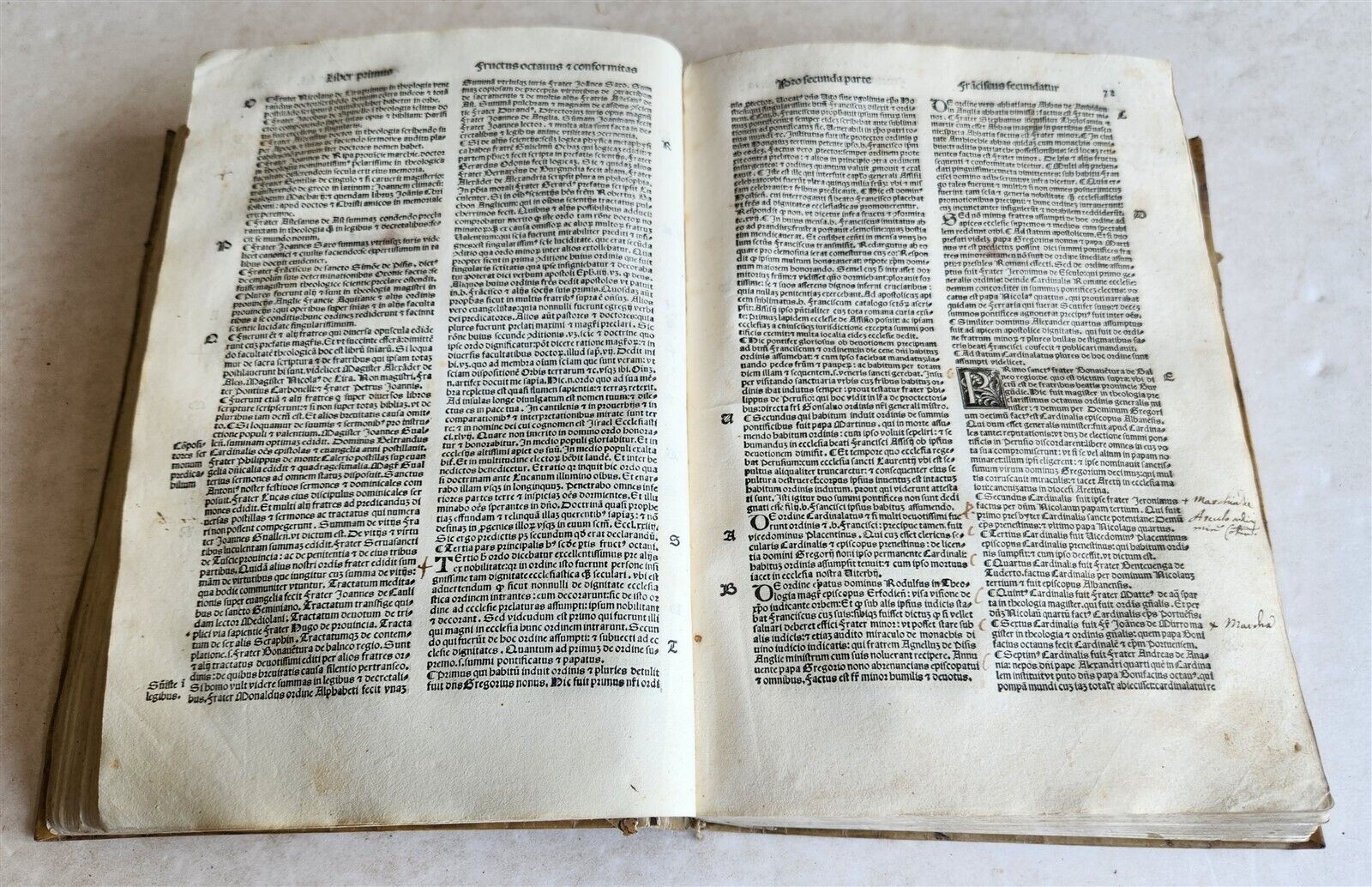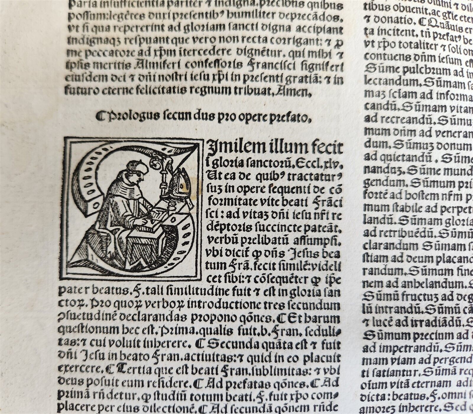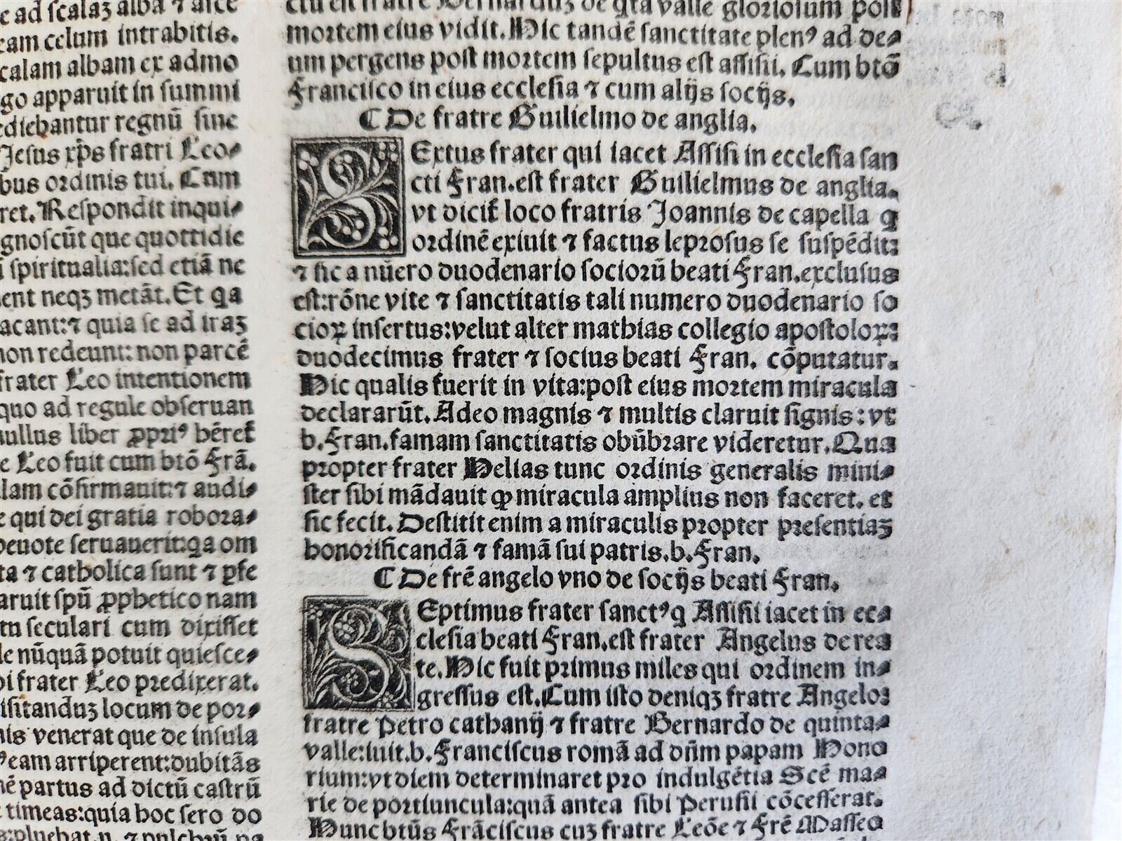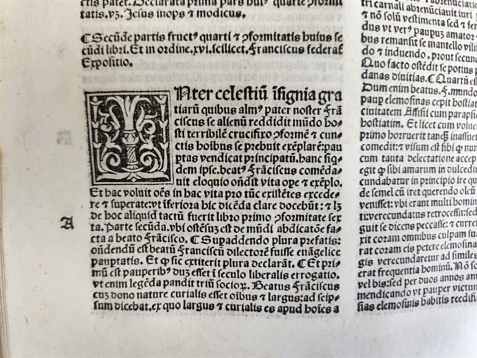 Albizzi (Albicius),B. (Pisanus).Opus aure(a)e et inexplicabilis bonitatis et continentie, conformitatum scilicet vit(a)e B. Fran(ncisci) ad vitam d(omini) n(ostr)i Jesu Christi. Milan, Z. Castilioni; August 18, 1513Size 8.5 by 11.5 inchesWith title woodcut, 1 full-length text woodcut with family tree in red and black, 1 woodcut border,numerous figurative woodcut initials and printer's mark12 lvs., 228 numbered leaves. Lacks leaf 226Full limp vellum bindingGood condition, minor wear, binding is partially detached at the front lower end (with inside repair), margins of title page repaired.Manuscript title to the spine and front coverWetzer/W. I, 441: "For the history of the order (the Franciscans) of that time, this work is the primary source. By listing the provinces and custodies along with the individual monasteries, even in Germany and France, it offers material that can hardly be approximated for other orders through painstaking detailed research in archives." RAREText in Latin===========================