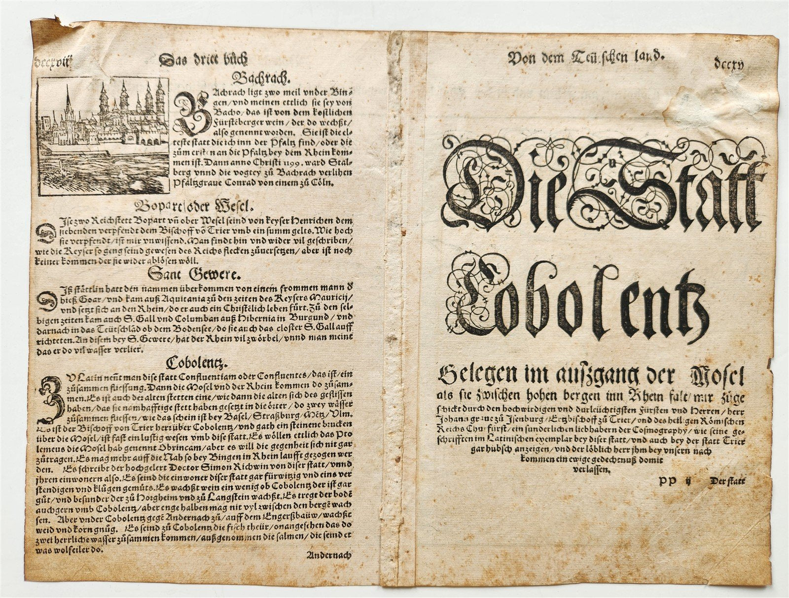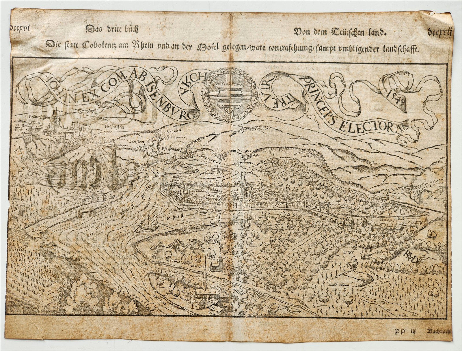 1572 MAP of KOBLENZ GERMANY from SEBASTIAN MUNSTER'S COSMOGRAPHY antique