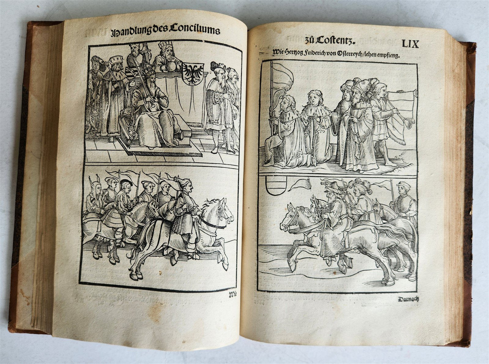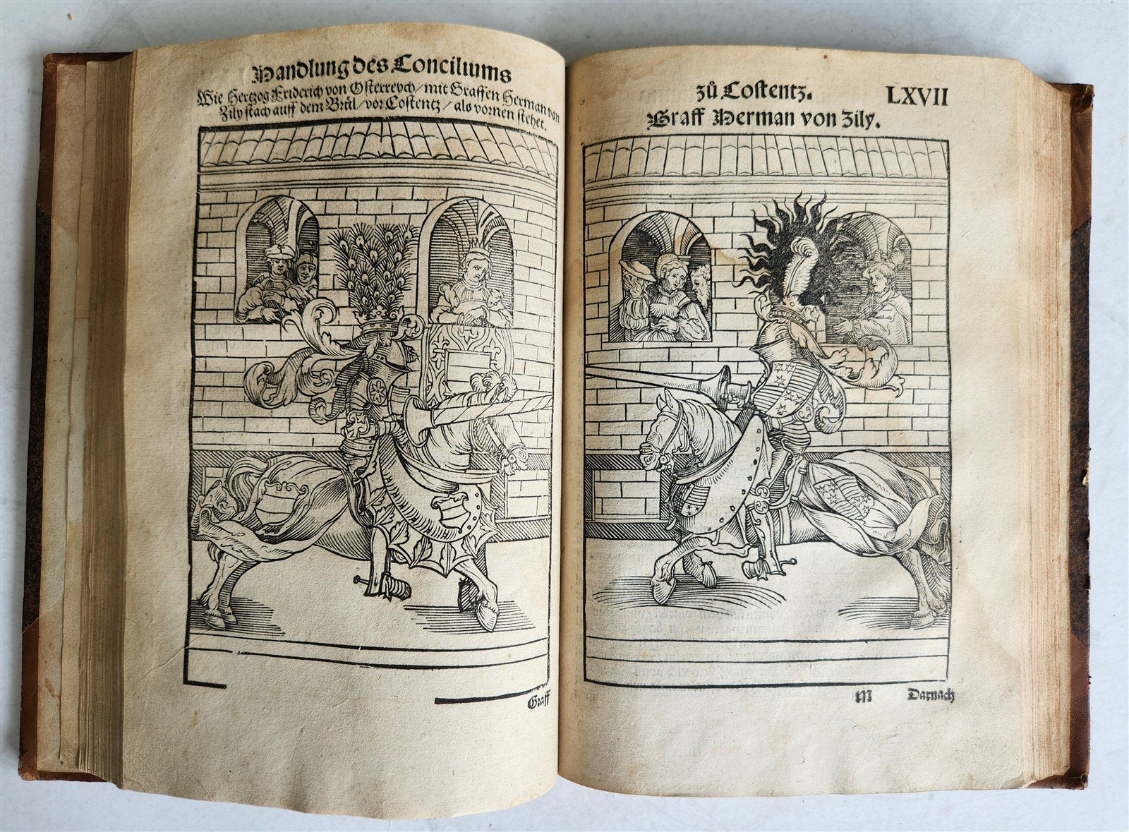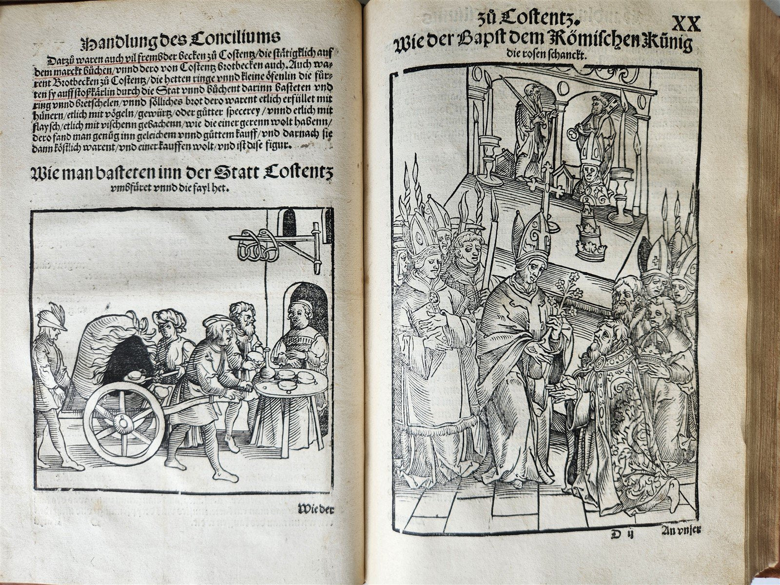 The beautiful large woodcuts depicting events of the Council, the Emperor, Pope, and Cardinals with their entourage, the condemnation and execution of John Hus, tournaments, etc., are contemporary reworkings of those in the first edition (Augsburg, A. Sorg 1483) by Jorg Breu;