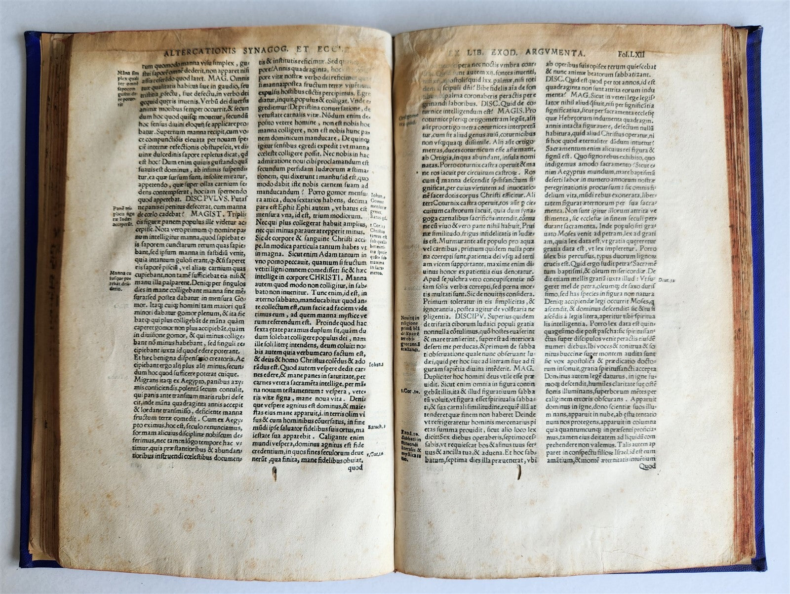 Altercatio Synagogae et Ecclesia[Coloniae: Melchioris Nouesiani, 1537]7 (of 8), 118 leavesmodern leather-backed boards;lacking the titleupper margins of leaves corroded with some repairs, occasional foxing Small folio. Size 8 1/2 by 12 3/4 inchesText in Latin=========================================The Altercatio Ecclesiae et Synagogae is an anonymous Latin dialogue between Ecclesia and Synagoga, personifications of the Church (Christianity) and the Synagogue (Judaism).It was written in the fifth century, probably in Roman Africa.Throughout the Middle Ages, it was falsely attributed to Augustine.The fictional dialogue has a courtroom setting. It is a Christian apologia and a polemic against Judaism.The Altercatio was probably written after 438, when Jews were forbidden by law from holding public office in the Roman Empire. By reference to Christian emperors, it may be argued that the text was written before the fall of the Western Roman Empire in 476. This is not certain, but the text was probably written in the fifth century. The oldest known copy is from the ninth century.The text may have been known in Spain by 673. According to Jocelyn Hillgarth, Julian of Toledo used its criticism of Judaism as a model for his criticism of Gaul when writing the Insultatio in tyrannidem Galliae in the aftermath of the revolt of Paulus.The Altercatio was probably written in Roman Africa, as judged by its author's use of Cyprian of Carthage's Testimonia and by the use of the title Basileion for the Books of Kings, a title favourd by African authors. Biblical quotations, drawn from Cyprian, correspond to the Vetus Latina.The supersessionist theology of the Altercatio is drawn mainly from Cyprian. His view of "the providential role of the Roman Empire in the Christianization of the world" is taken from Ambrose of Milan. A source unique to him is Roman law.Desiderius Erasmus first noted that the author was familiar with the law. He may have been a lawyer.The Altercatio begins with a first-person introduction establishing a courtroom setting where two ladies will dispute the rightful inheritance of God's promises in the Old Testament. The rest of the work consists of the back and forth comments of the litigants, the Church (Ecclesia) and the Synagogue (Synagoga).First, Synagoga argues that the prophets were sent to her, but Ecclesia responds that she killed them.Synagoga then argues that she is the more ancient, but Ecclesia responds that there has been a reversal of roles and the elder now serves the younger, as Esau served Jacob. This leads to a debate about the status of Jews in the Empire, with Synagoga defending her freedom and Ecclesia point to her loss of full civil rights.Synagoga argues that even Jesus was sent to the Jews, but Ecclesia retorts that the Jews are all the more culpable for having rejected him. She does not levy the standard accusation of Jewish deicide. The text then turns to the question of circumcision versus the sign of the cross with reference to the Prophets. At the end, Synagoga admits that she did not heed the Prophets and misinterpreted them.Dorothea Weber describes the Latin of the Altercatio as "bombastic-stilted". At times it is even incomprehensible. It contains a single hapax legomenon in pompatilis at line 64. Certain phrases are also found in the writings of Petrus Chrysologus, Cassiodorus and Ruricius. The highly rhetorical style belongs to the fifth and sixth centuries.The Altercatio's dialogue form was inspired by the contemporary Dialogue of Simon and Theophilus of Evagrius Gallus [ca].It differs from the Dialogue in giving a situation for the debate (a court of law). The anonymous Consultationes Zacchei christiani et Apollonii philosophi also has a first-person introduction, but like the Dialogue it lacks situational context. A context is given in Jerome's Altercatio Luciferiani et orthodoxi and a courtroom setting specifically in the pseudo-Augustinian Collatio Augustini cum Pascentio. The courtroom setting may reflect actual debates that took place between the Nicene Orthodox and Arians in the Vandal Kingdom in Africa in the fifth century, as recorded in the Collatio Augustini cum Maximino.The most unique aspect of the Altercatio Eclesiae et Synagogae is its use of personifications rather than fictitious or fictionalized persons.The nearest text in terms of genre—a "polemical dialogue between" the personifications Church and Synagogue—is the anonymous tenth-century Altercatio Aecclesiae contra Synagogam, possibly written in England and potentially influenced by the Altercatio Ecclesiae et Synagogae.================================Please see my other auctions Thank You