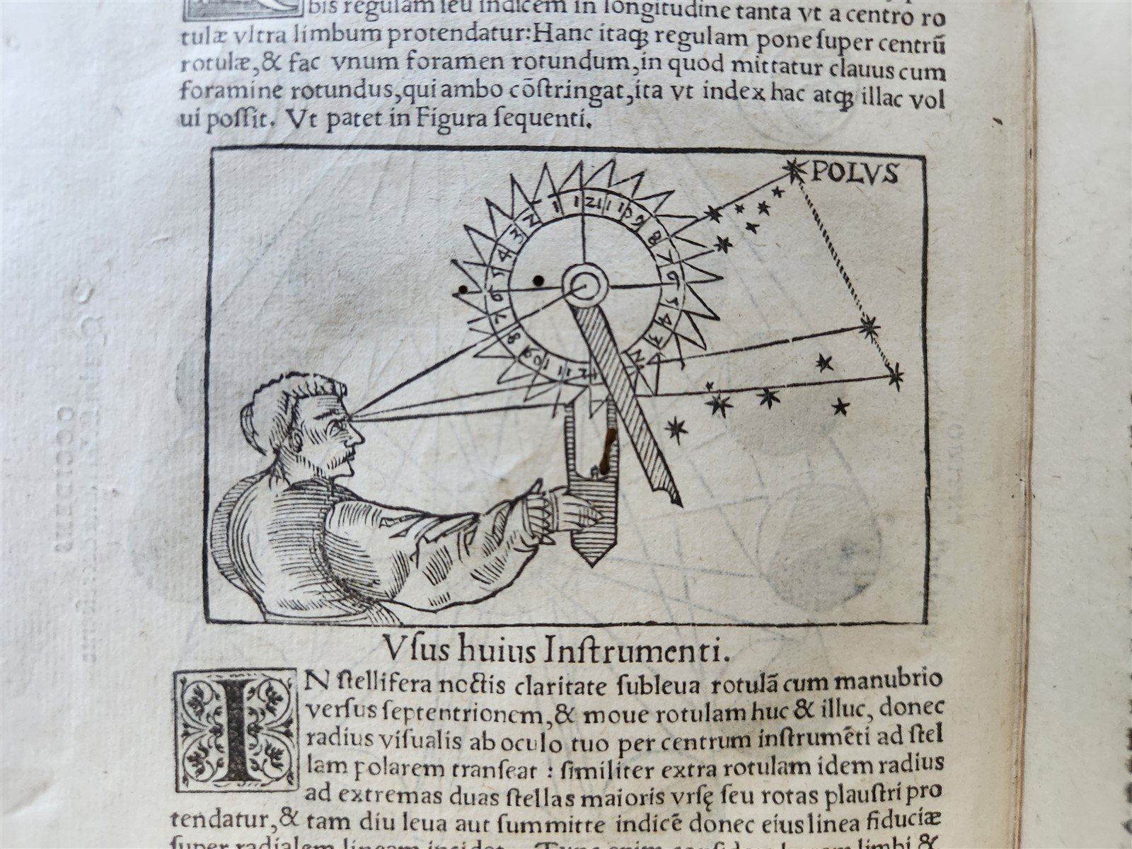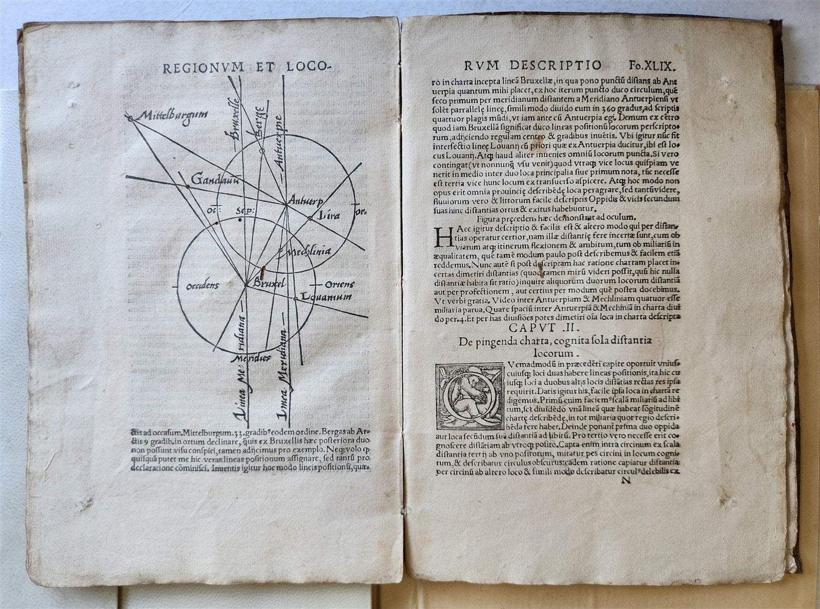 Also contains two contributions by Gemma Frisius, his "Libellus de locorum describendorum ratione" (pp. 47-53), in which he was the first to describe the principle of triangulation for land surveying, and his "Usus annuli astronomici" (pp. 54-60), published here for the first time.