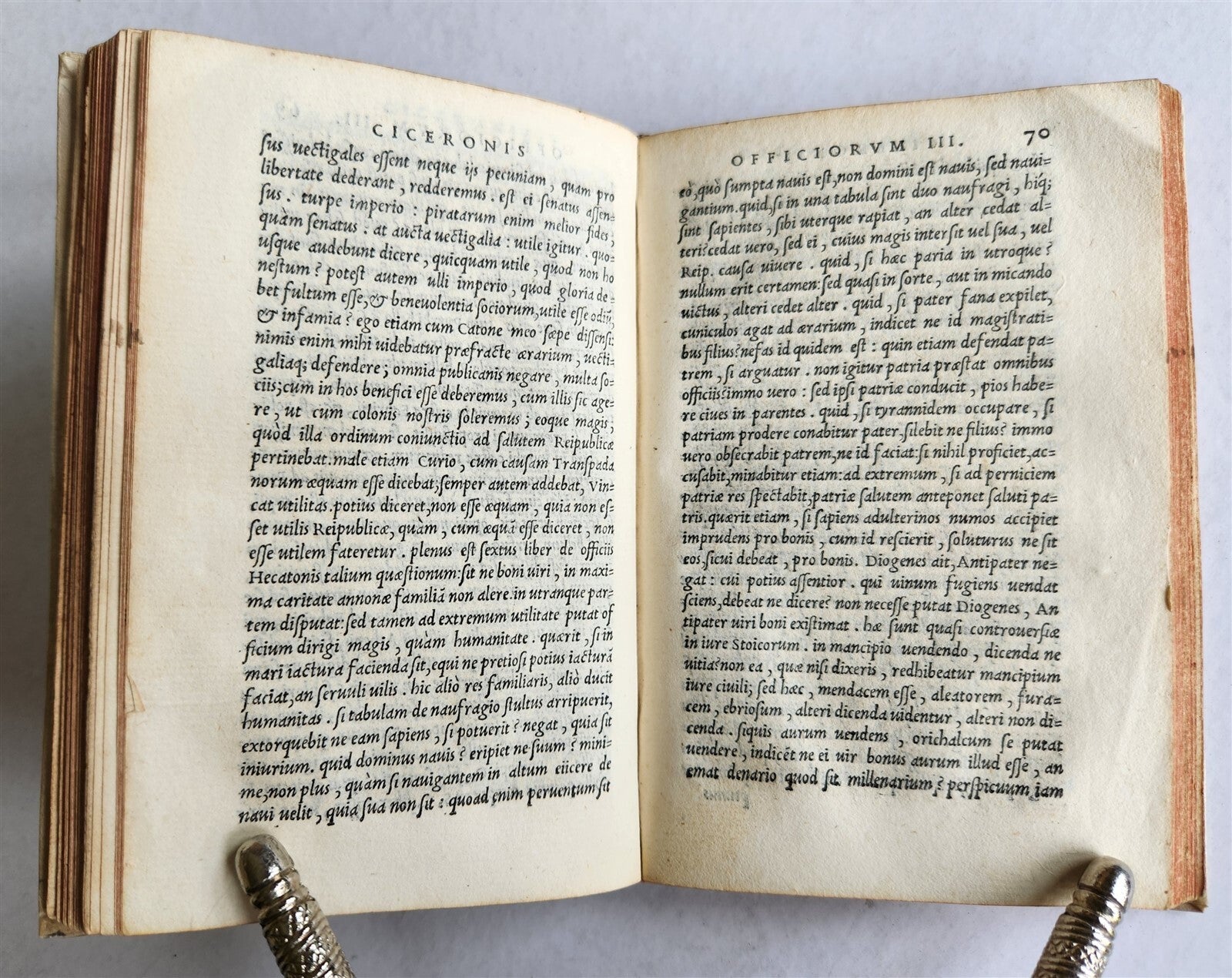 CICERO, Marcus Tullius Officiorum libri tres. Cato Maior. Laelius. Paradoxa stoicorum sex. Somnium Scipionis. Venice: Paolo Manuzio; 1541Printer's mark on the title page and colophon (good condition , some faded occasional stainsLater limp vellum, manuscript title on the spine Provenance:illegible period ownership notes on the colophon - Ex bibliotheca Orengo 1840 (ownership note on the flyleaf) Size 3 3/4 by 5 3/4 inchesText in Latin============================Please see my other auctions Thank You