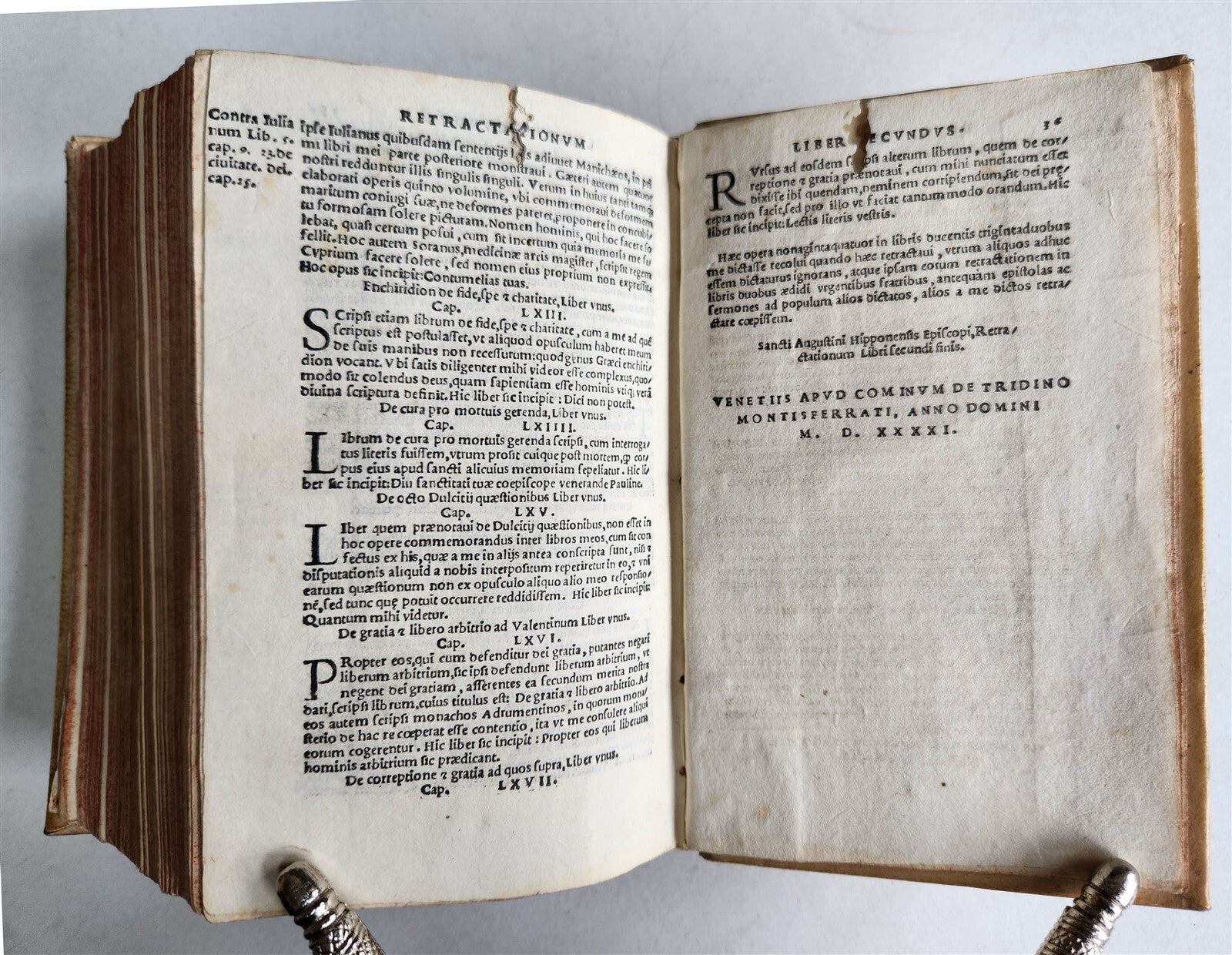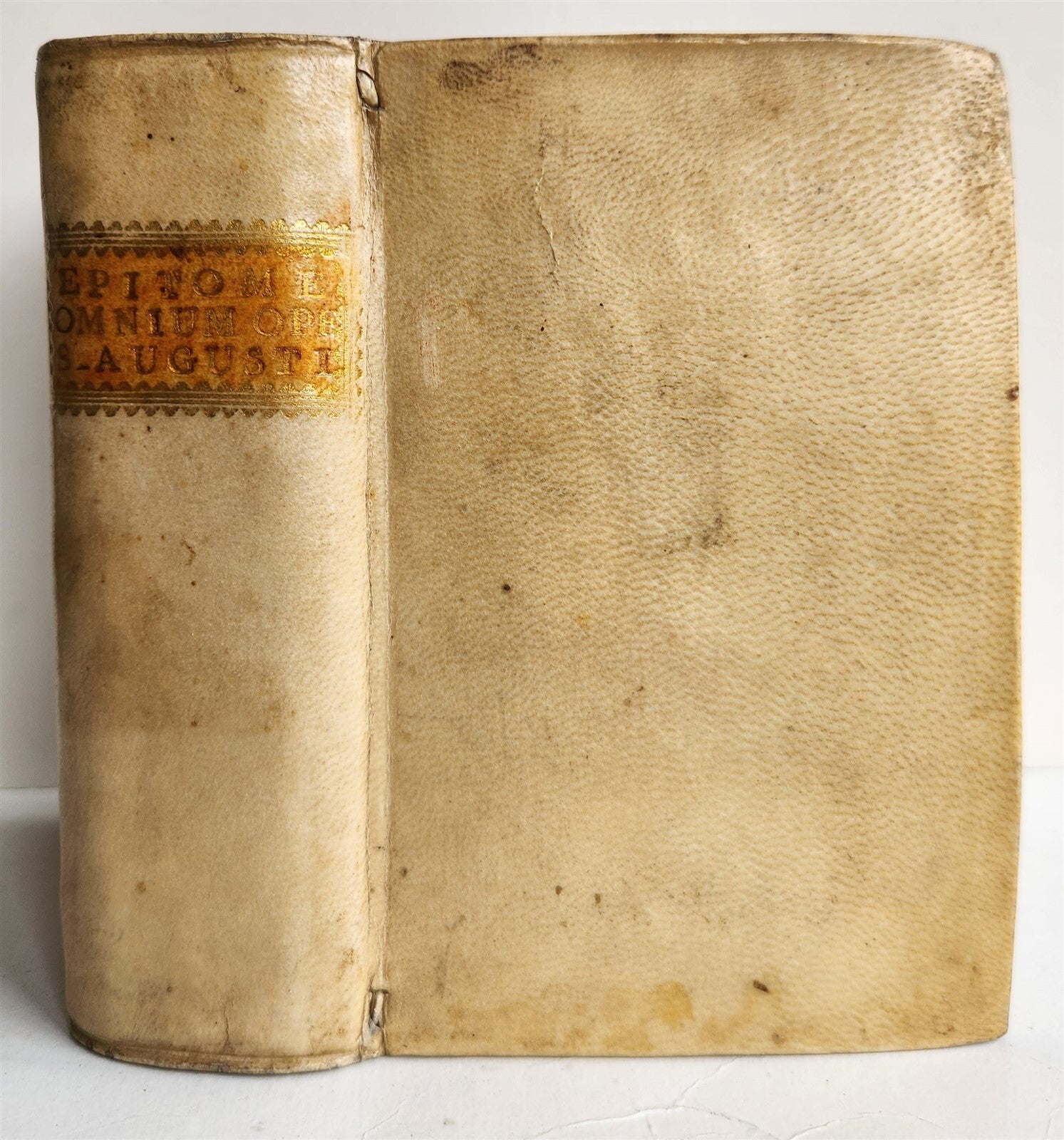 OMNIUM OPERUM DIVIAURELII AUGUSTINI Episcopi Hipponensis, Epitome, primum quidem per Iohannem Piscatorium compendiaria quadam uia collecta : nunc autem diligentius recognita, & multorum adiectione, quae in priori aeditione, non absque magna Augustinianae sententiae iactura desiderabantur, aucta & locupletata per Iohannem Pesselium Tylanum. Per eundem & nunc recens accessit ex eodem Augustino collectus de septem sacrosanctis Sacramentis tomus quartus.AURELIUS AUGUSTINUS [PISCATORIUS Johannes].Venice: Sub signo Sancti Bernardini; 1542 (1541 in colophon)Full vellum binding, title label to the spineVery good condition, some toning of the title page, front hinge broken, worm track to the upper margin of last about 15 leavesSize 4 by 6.5 inchesText in Latin=====================================Please see my other auctions Thank You