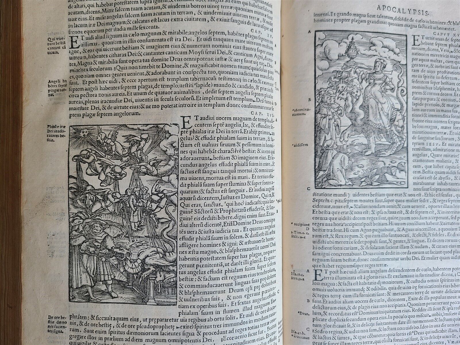 Superb edition of this Latin Bible in two parts, illustrated with numerous woodcut vignettes, initials and ornaments by Hans Holbein, the second part is particularly spectacular with 21 large and amazing woodcuts representing the scenes of the apocalypse first appeared in Zwinglibibel (1531)