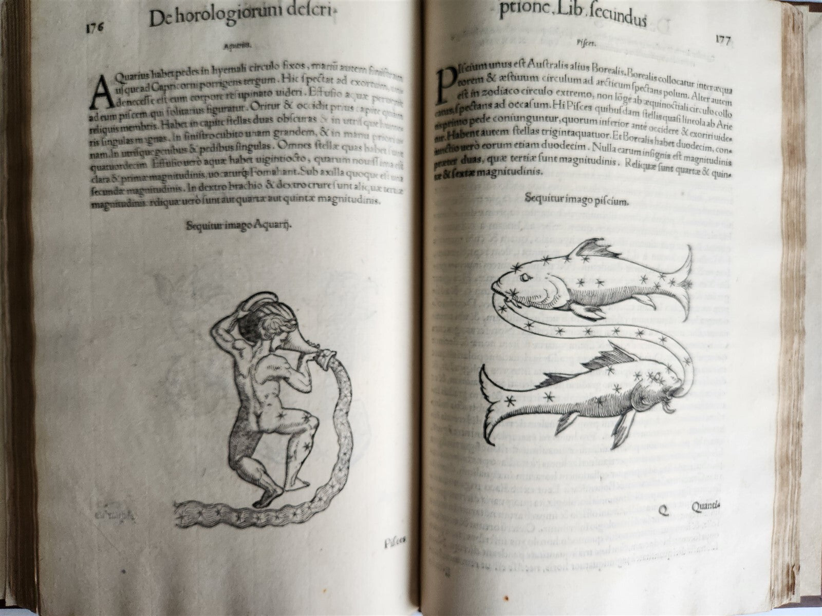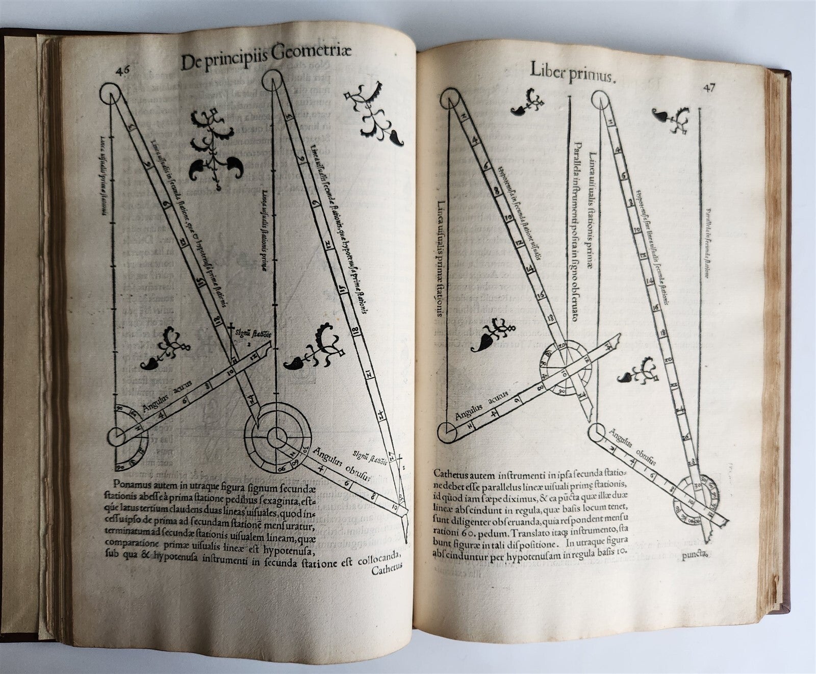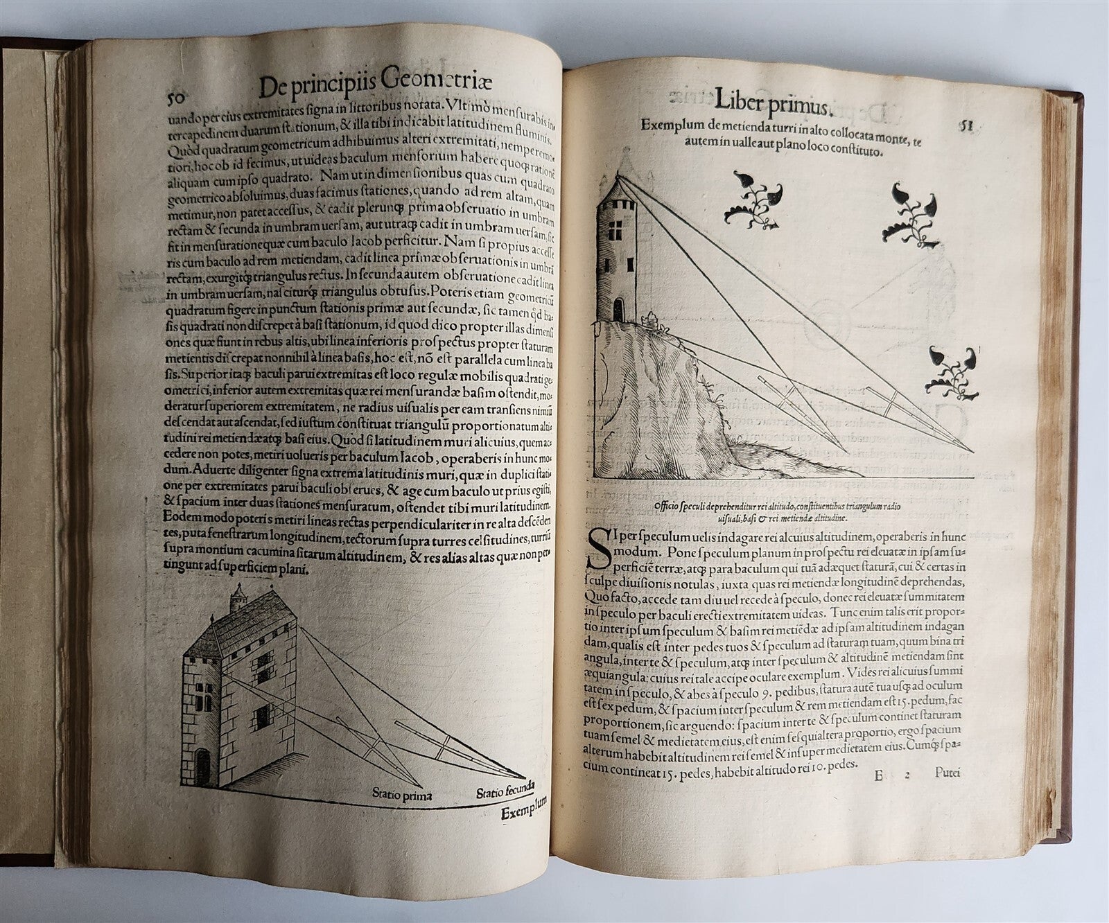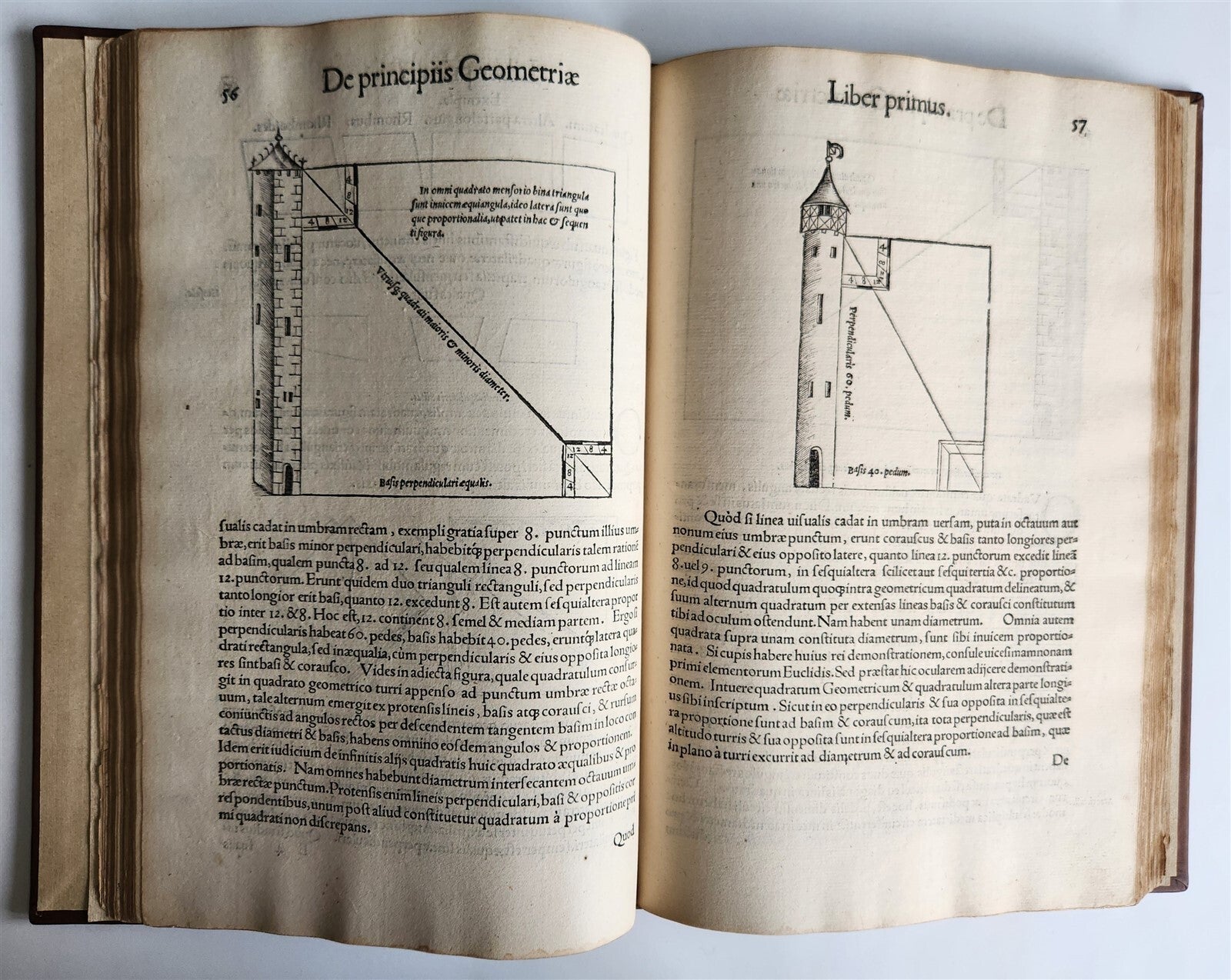 Munster, Sebastian (1488-1552)Rudimenta Mathematica.Basel: Heinrich Petri; 1551.First edition, small folioThis book covered essential geometrical principles for timekeeping, architecture, navigation, measuring barrels, and other practical endeavors, and it provided another guide to the making of sundials. Note the sundials on the side of the tower and the division of the globe into circles and regions.the text in two parts; large woodcut on title page with a large tower and six figures engaged in measuring various objects with different scientific instruments, illustrated with numerous text woodcuts and diagrams;(lacking the double-page plate); bound in full modern calf with blind tooling;title and verso of final leaf with random annotations in English, Latin and Greek, with dates in the late 16th and early 17th century noted; occasional period marginal notes[10], 243 pp.-Adams M-1939; Burmeister 54; Zinner 2022; Houzeau-Lancaster 11364-Ex libris: Professor, Astronomer, Historian & Bibliophile Owen GingerichVery good condition except one missing plateSize 8 by 11 3/4 inchesText in Latin===================Please see my other auctions Thank You