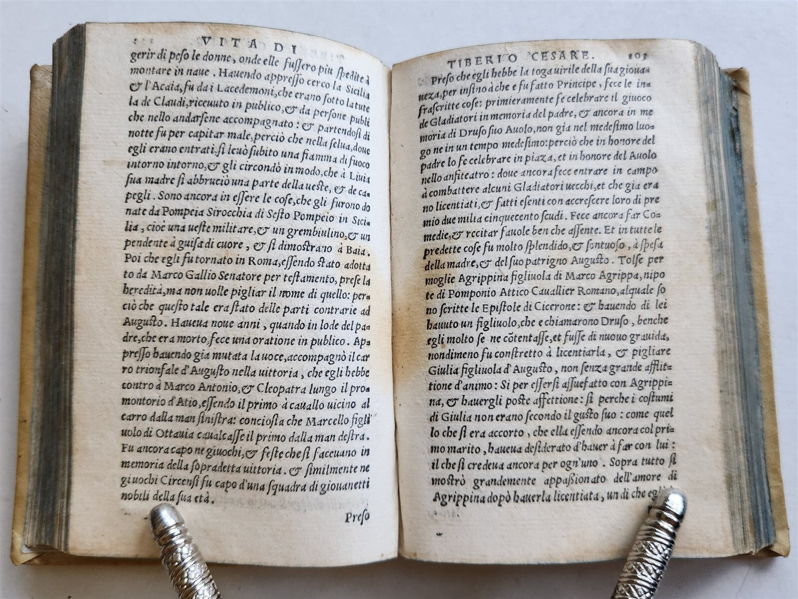 Suetonius Tranquillus, Caius. Le Vite de dodici Cesari ... tradotte in lingua toscana per M. Paolo del Rosso cittadino fiorentino. Venice, Baldassare Constantini, (1554)288 (of 290) pages.Title with printer's mark. - Cf. Graesse VI, 521f. Brunet V, 579ff. – Early Italian print of the biographies of the first twelve Roman emperors. –The last leaf is missing. Front endpaper with cut-out margin and period manuscript annotation, also present on the title page. Slightly foxed in places.Size 4 by 5 3/4 inchesText in Italian==========================Please see my other auctions Thank You
