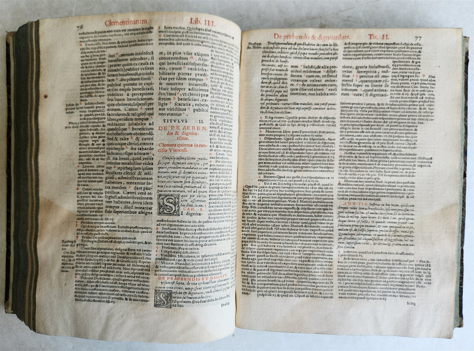 Sextus liber decretaliumLyon, apud Hugonem a Porta & Antonium Vincentium; 1559Woodcut printer's mark on the title page with red and black titles, one woodcut engraving, red and black text with engraved initials, 19th century half-leather and marbled paper binding, blue edgesDampstained, some leaves with wormhole to the lower right cornerSize 7 by 9.5 inchesText in Latin======================================Please see my other auctions Thank You