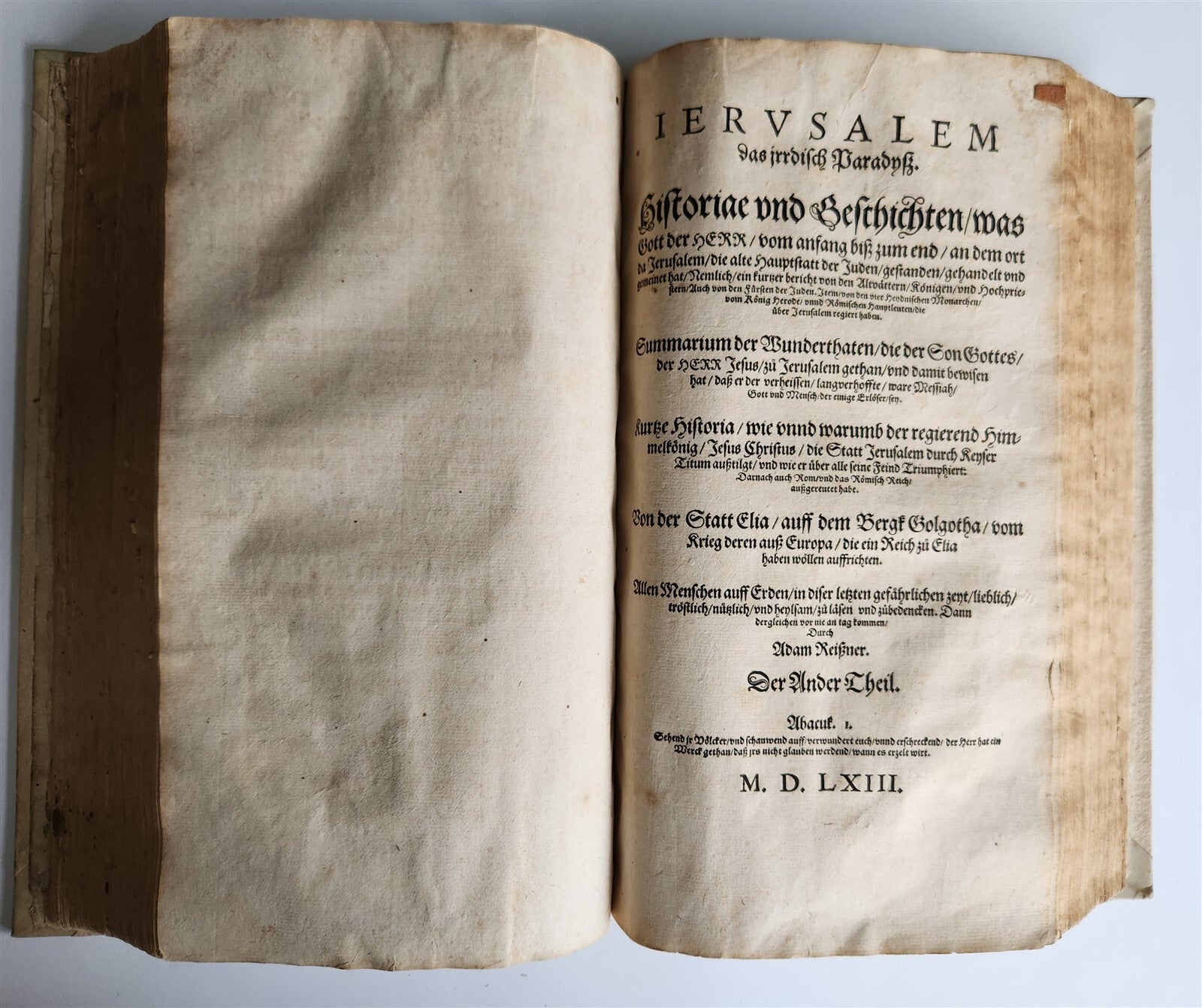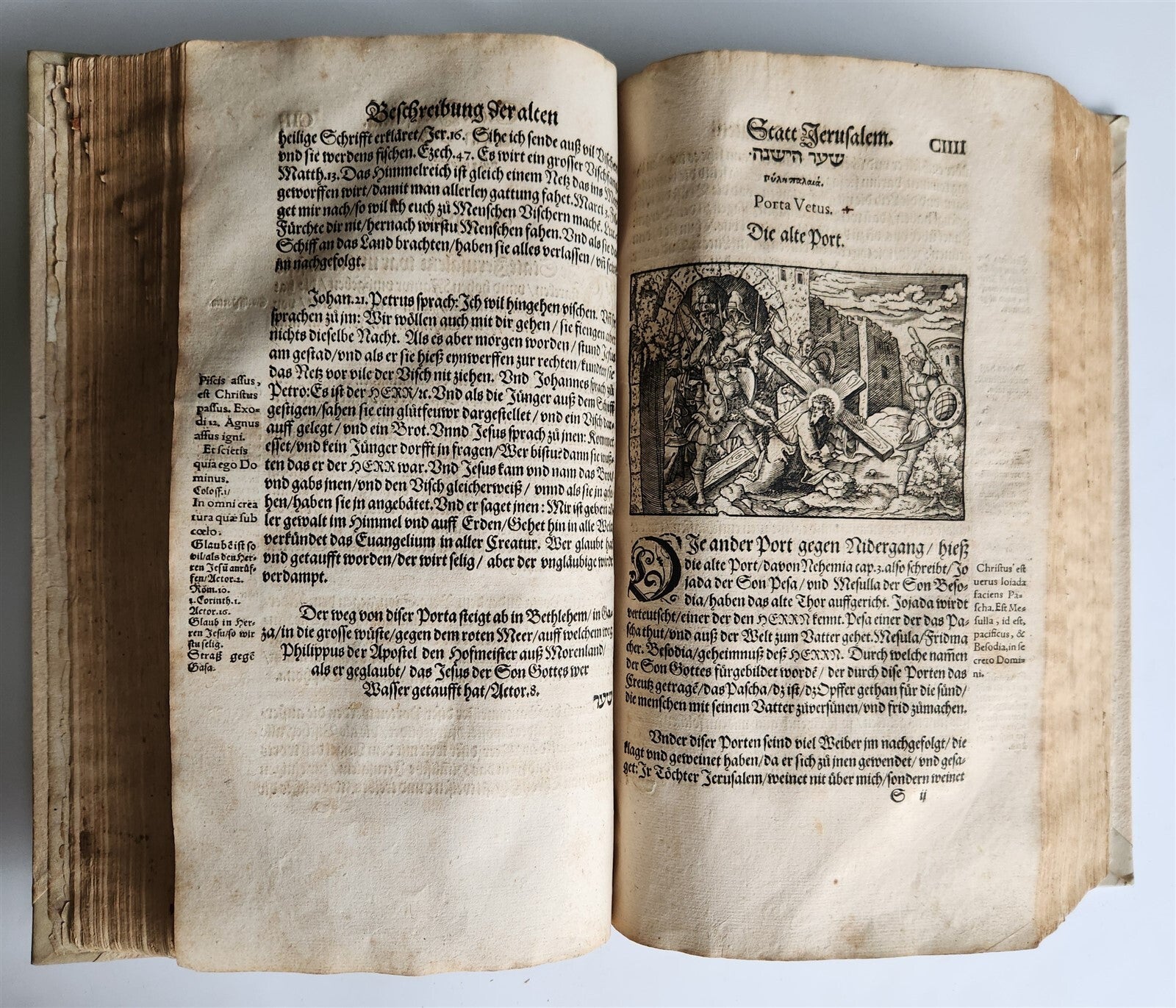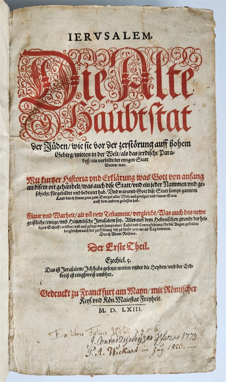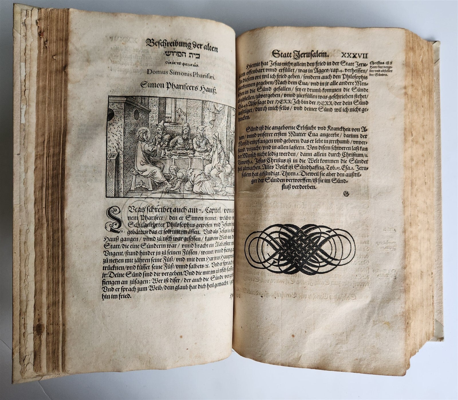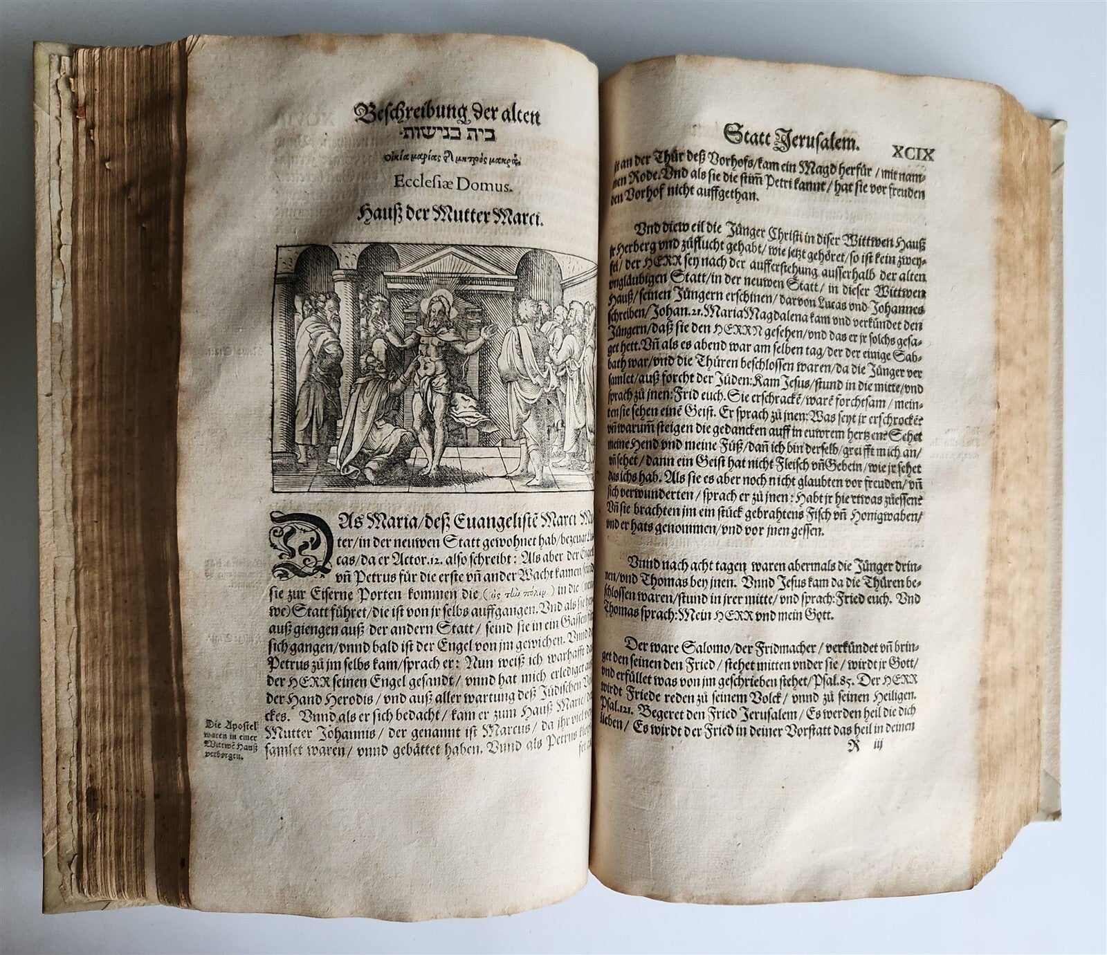 (Jerusalem, the ancient capital of the Jews)Frankfurt am Main: Gedruckt bey Georg Raben, Sigmund Feyrabend & Weygand Hanen Erben; 1563First edition, two parts in one volume; text in black letter; illustrated with 1 double-page woodcut plate and 2 double-page woodcut maps, plus numerous in text woodcuts; early ownership stamp of Joannes Haller dated 1568 appears on B5 recto (the stamp could easily be mistaken for a printed tailpiece or printer's device) likely the Swiss reformation theologian Johann Haller the Younger (1523-1575); with signatures of other Swiss reformers to title page including Felix Wyss (1596-1666); Paul Anton Wickart (1760-1832); and another owner who signed in 1773; bound in later half parchment; tabs on fore-edges throughoutSome dampstains and occasional foxingSmall folio. Size 7 1/4 by 12 1/4 inchesText in German===================Please see my other auctions Thank You