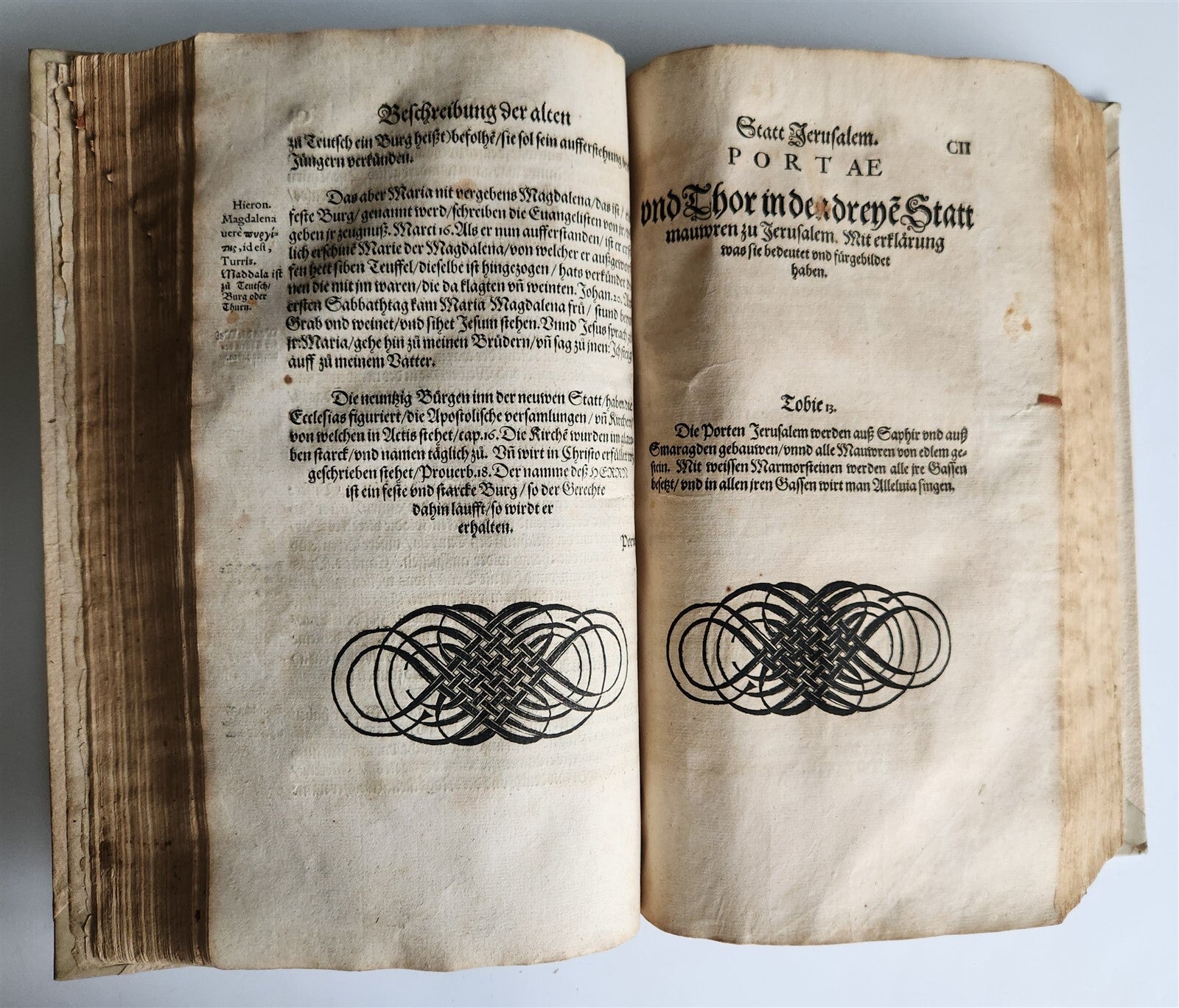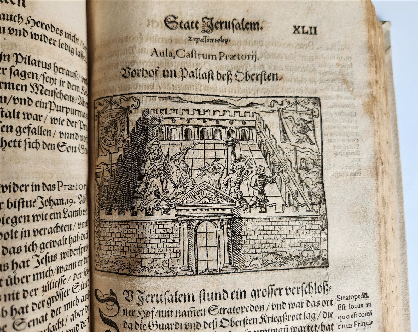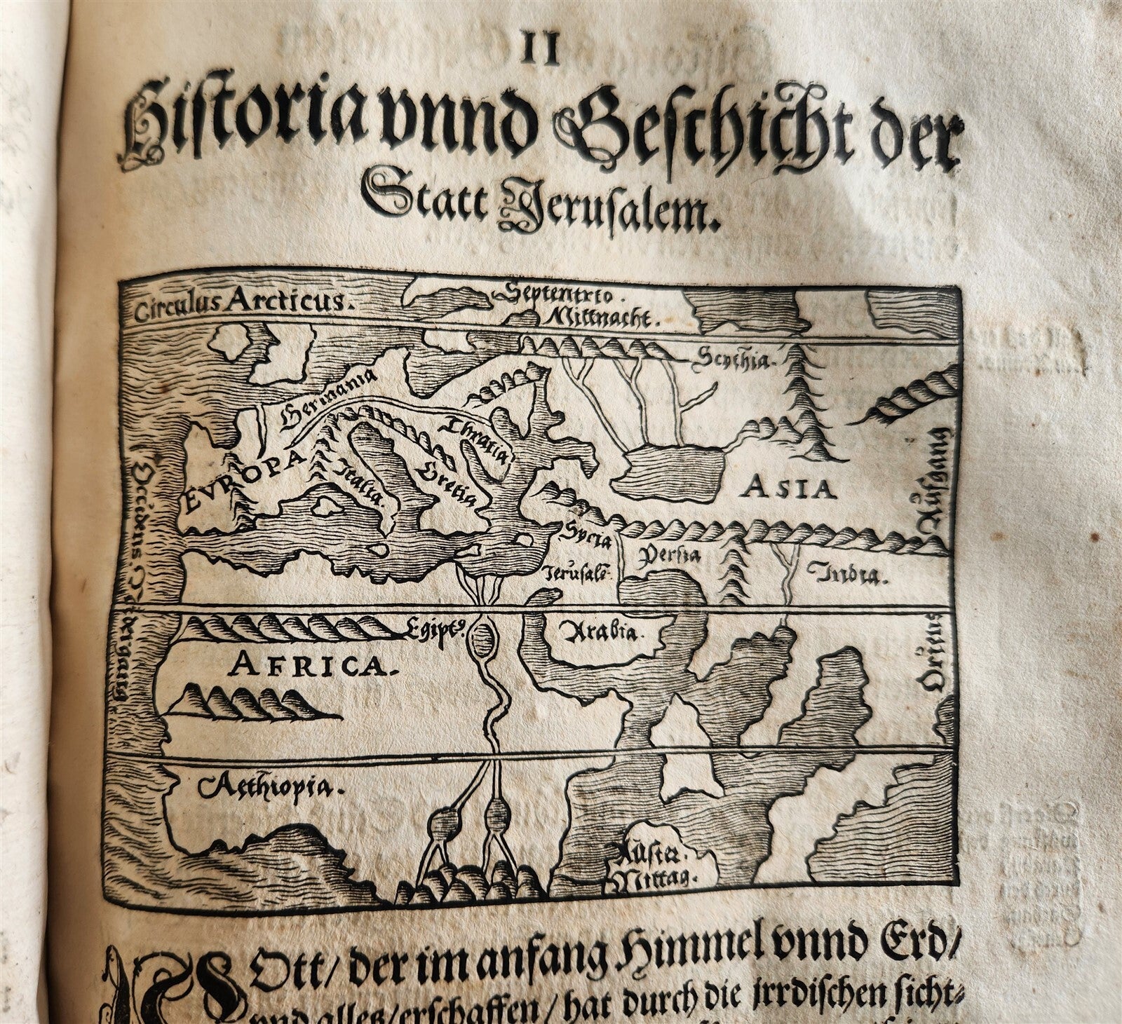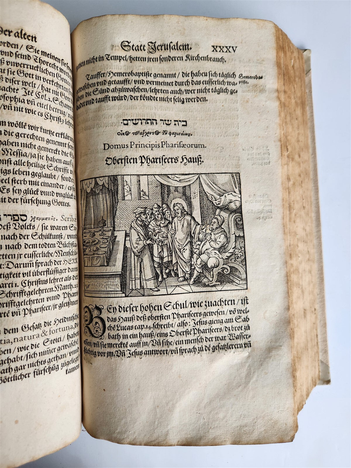 (Jerusalem, the ancient capital of the Jews)Frankfurt am Main: Gedruckt bey Georg Raben, Sigmund Feyrabend & Weygand Hanen Erben; 1563First edition, two parts in one volume; text in black letter; illustrated with 1 double-page woodcut plate and 2 double-page woodcut maps, plus numerous in text woodcuts; early ownership stamp of Joannes Haller dated 1568 appears on B5 recto (the stamp could easily be mistaken for a printed tailpiece or printer's device) likely the Swiss reformation theologian Johann Haller the Younger (1523-1575); with signatures of other Swiss reformers to title page including Felix Wyss (1596-1666); Paul Anton Wickart (1760-1832); and another owner who signed in 1773; bound in later half parchment; tabs on fore-edges throughoutSome dampstains and occasional foxingSmall folio. Size 7 1/4 by 12 1/4 inchesText in German===================Please see my other auctions Thank You