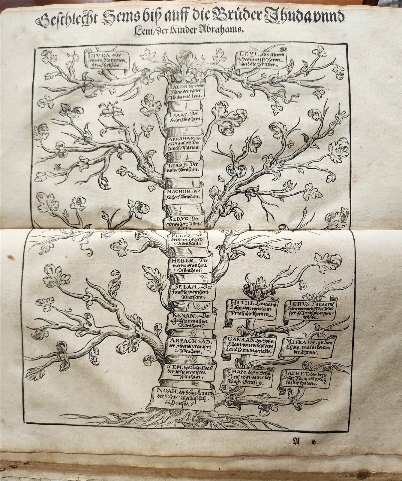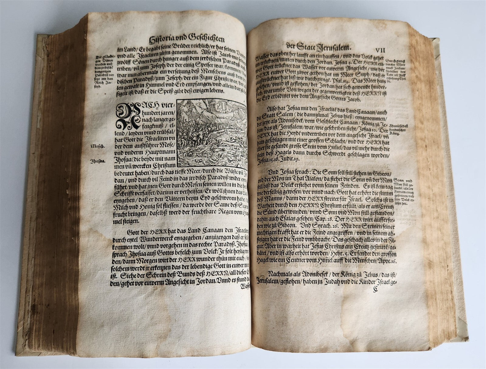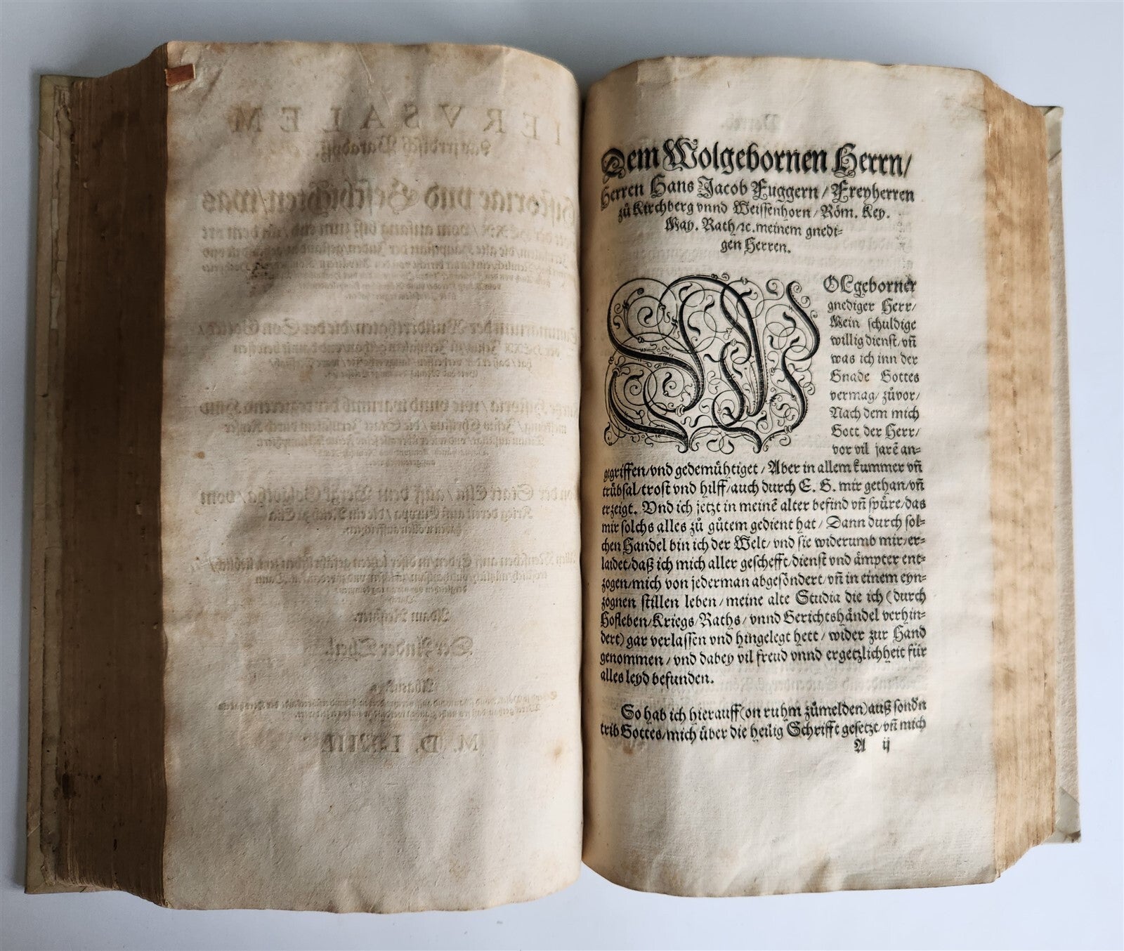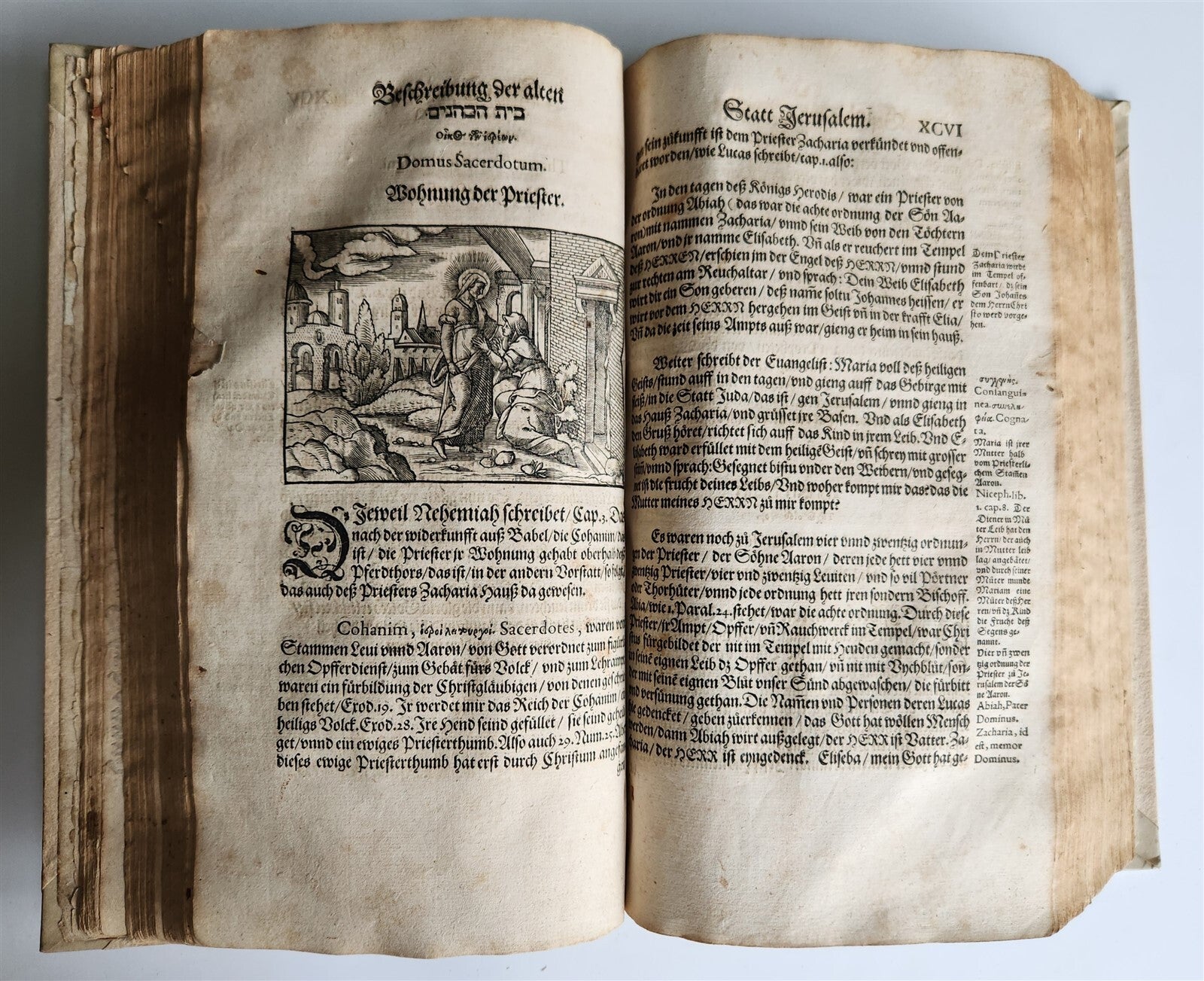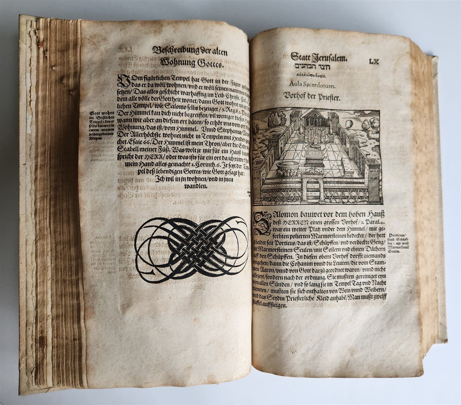 (Jerusalem, the ancient capital of the Jews)Frankfurt am Main: Gedruckt bey Georg Raben, Sigmund Feyrabend & Weygand Hanen Erben; 1563First edition, two parts in one volume; text in black letter; illustrated with 1 double-page woodcut plate and 2 double-page woodcut maps, plus numerous in text woodcuts; early ownership stamp of Joannes Haller dated 1568 appears on B5 recto (the stamp could easily be mistaken for a printed tailpiece or printer's device) likely the Swiss reformation theologian Johann Haller the Younger (1523-1575); with signatures of other Swiss reformers to title page including Felix Wyss (1596-1666); Paul Anton Wickart (1760-1832); and another owner who signed in 1773; bound in later half parchment; tabs on fore-edges throughoutSome dampstains and occasional foxingSmall folio. Size 7 1/4 by 12 1/4 inchesText in German===================Please see my other auctions Thank You