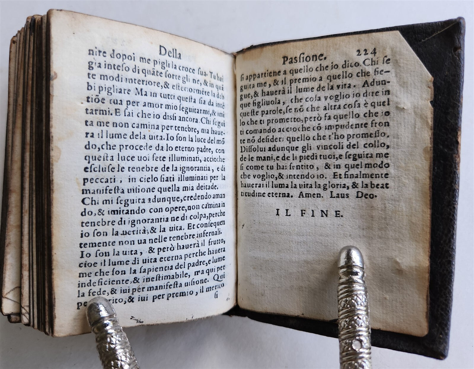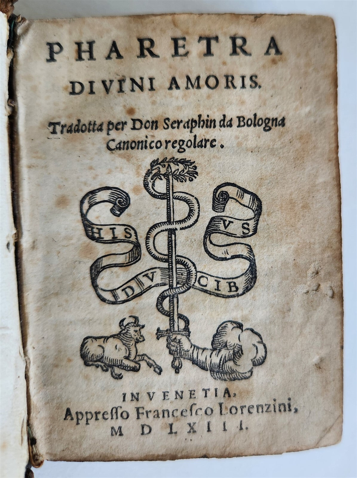 Pharetra Divini Amoris (The Treasury of Divine Love)tradotta da Don Seraphin da Bologna Johann Landsperger (b.1489)Venice, Francesco Lorenzini; 1563Original leather, spine with raised bands 224 leavesgood condition, some wear, a couple of ink stains, occasional foxingSize 2 3/4 by 4 inchesText in Italian===================Please see my other auctions Thank You
