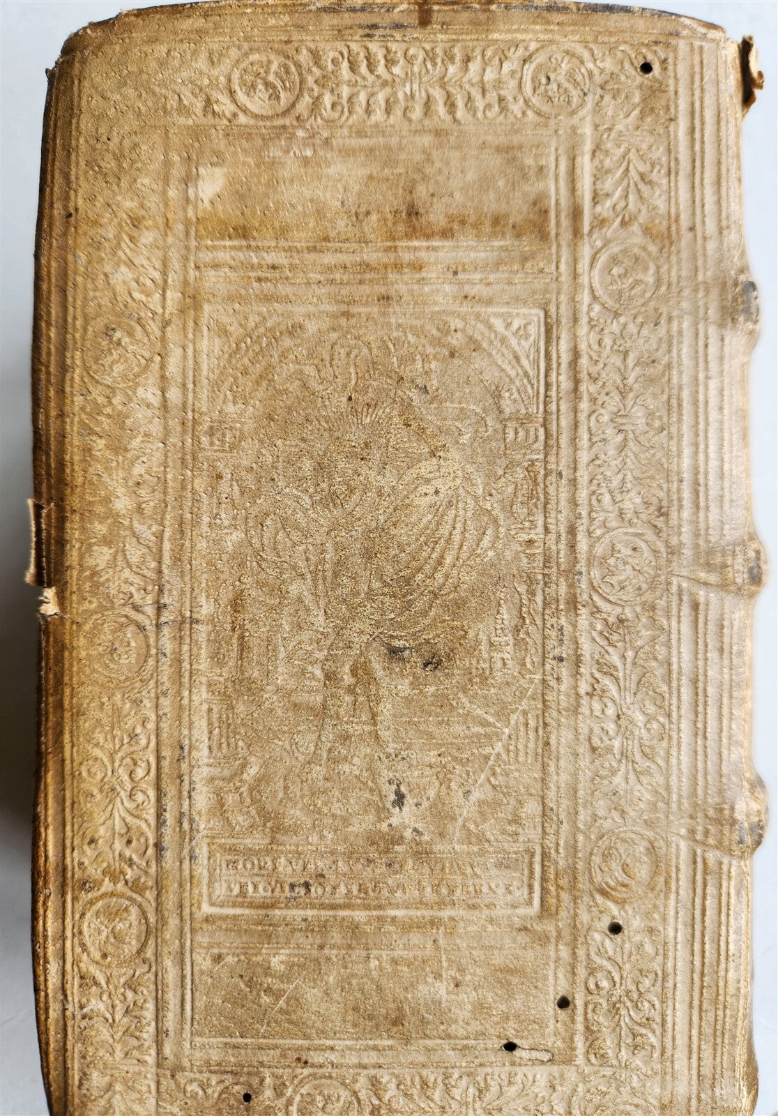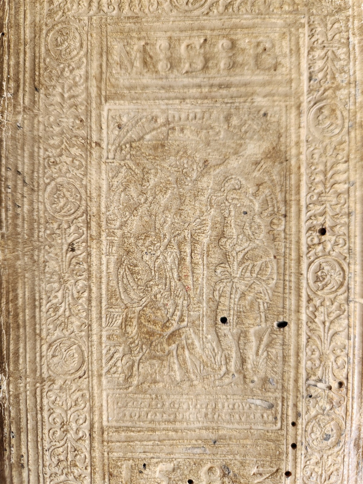 front cover with embossed image of Crucifixion with the initials MSB and the date 1583 on either side – and the Resurrection on the