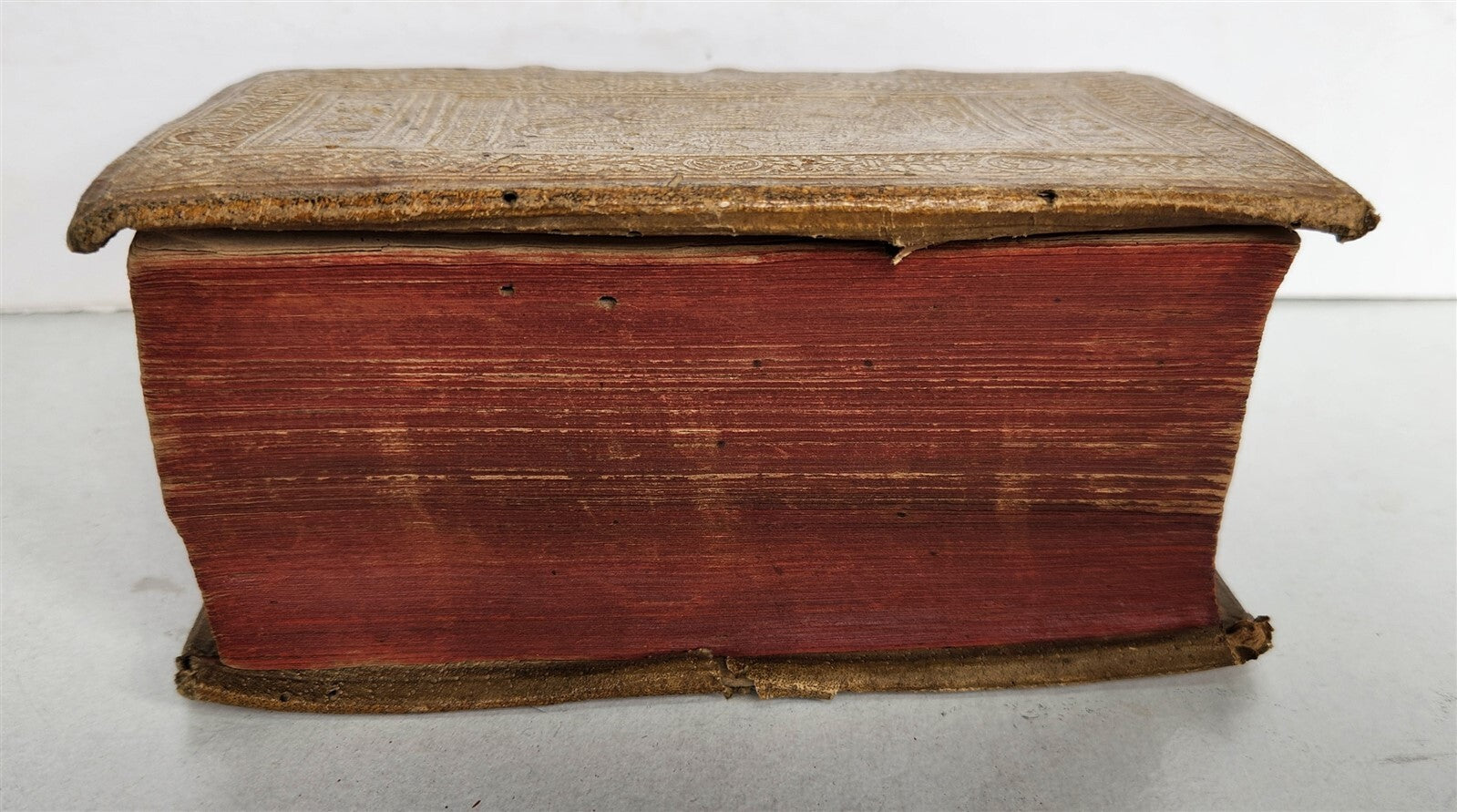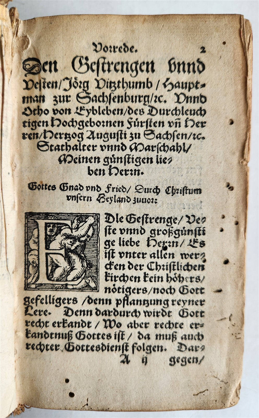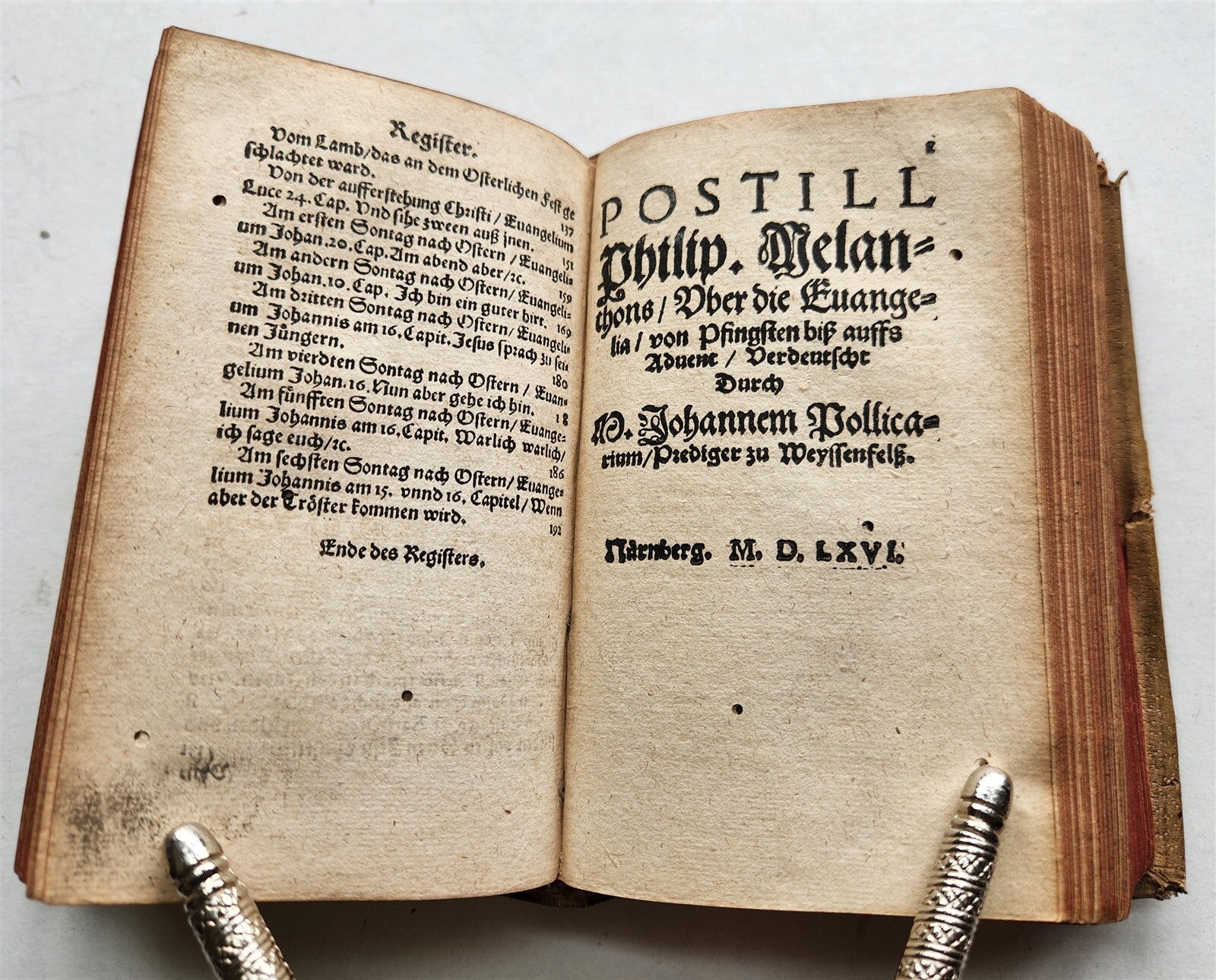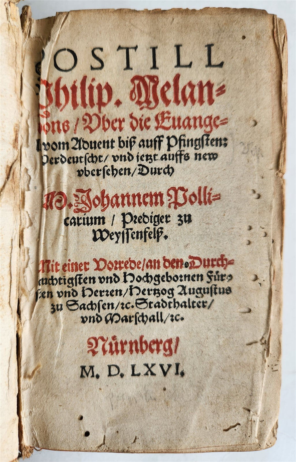 MELANCHTHON (Philippe)Postill uber die Evangelia vom Advent biss auff Pfingsten [–von Pfingsten biss auffs Advent]. Nuremberg, Ulrich Neuber & Dietrich Gerlach; 1566 2 parts in volumeOriginal blind-stamped pigskin German binding front cover with embossed image of Crucifixion with the initials MSB and the date 1583 on either side – and the Resurrection on the spine with three raised bands, red edgesGerman translation by Johannes Pollicarius, illustrated with around sixty woodcuts in the text. With wormholes at the margins and binding, lacks endpapersSize 4 by 6 1/2 inchesText in German============================Philip Melanchthon[a] (1497 – 1560) was a German Lutheran reformer, collaborator with Martin Luther, the first systematic theologian of the Protestant Reformation, an intellectual leader of the Lutheran Reformation, and influential designer of educational systems.He stands next to Luther and John Calvin as a reformer, theologian, and shaper of Protestantism.============================Please see my other auctions Thank You