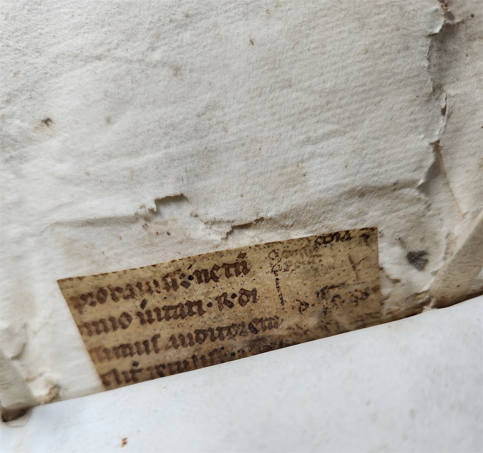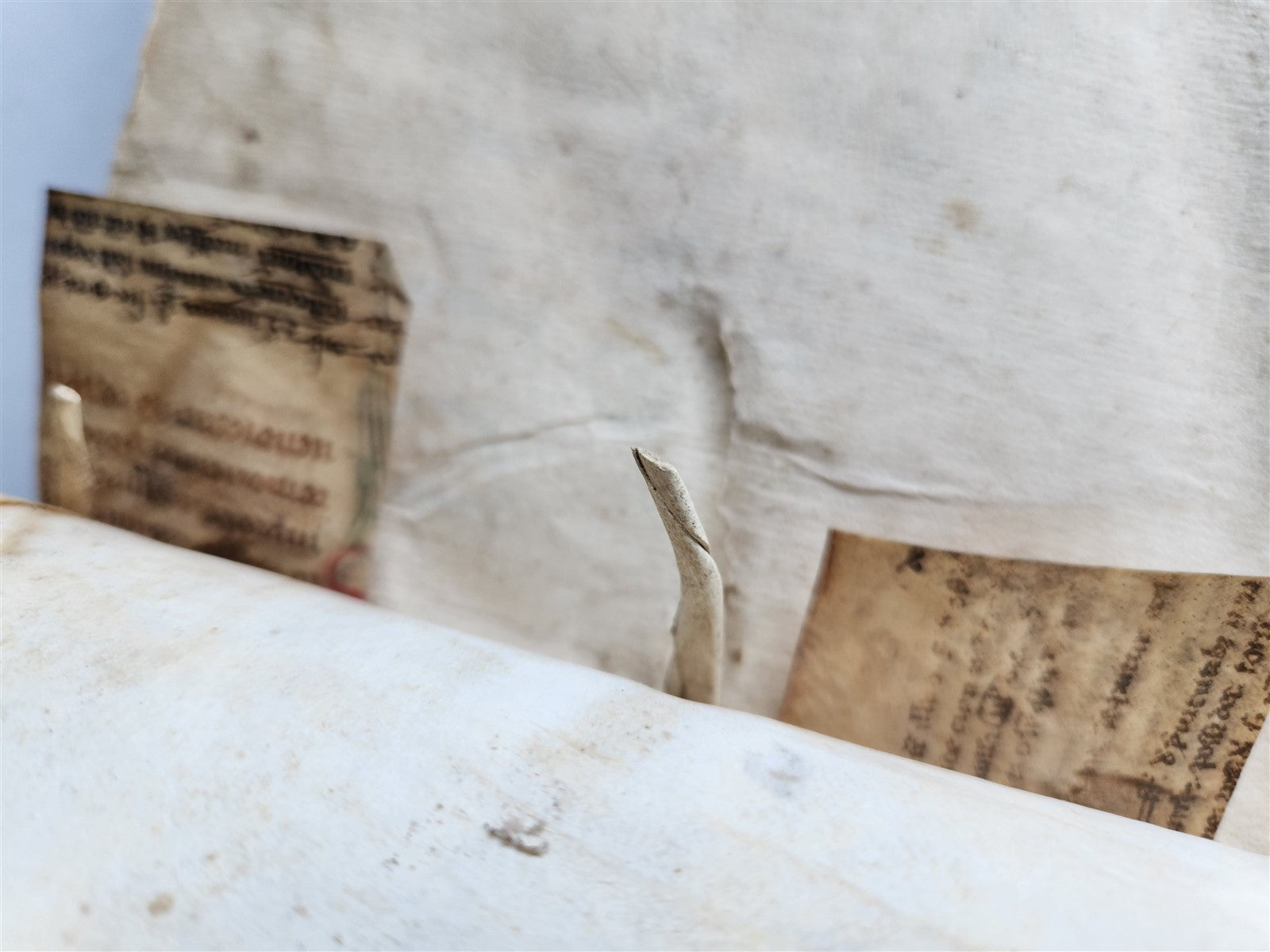 Vellum with some damages, some minor faded dampstains to the margins of part of the leaves, some front and last leaves frayed With exposed medieval vellum manuscript parts used for the binding