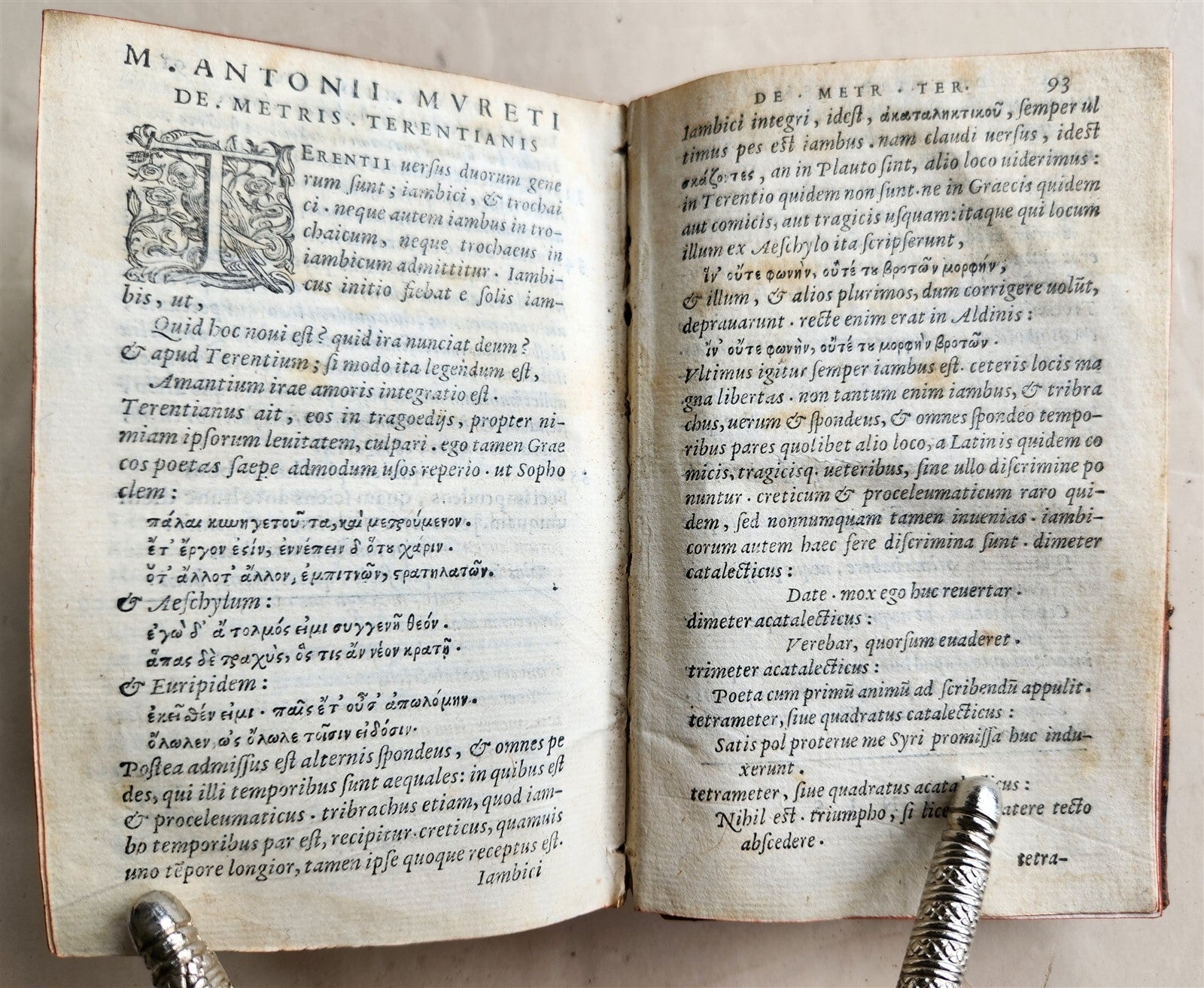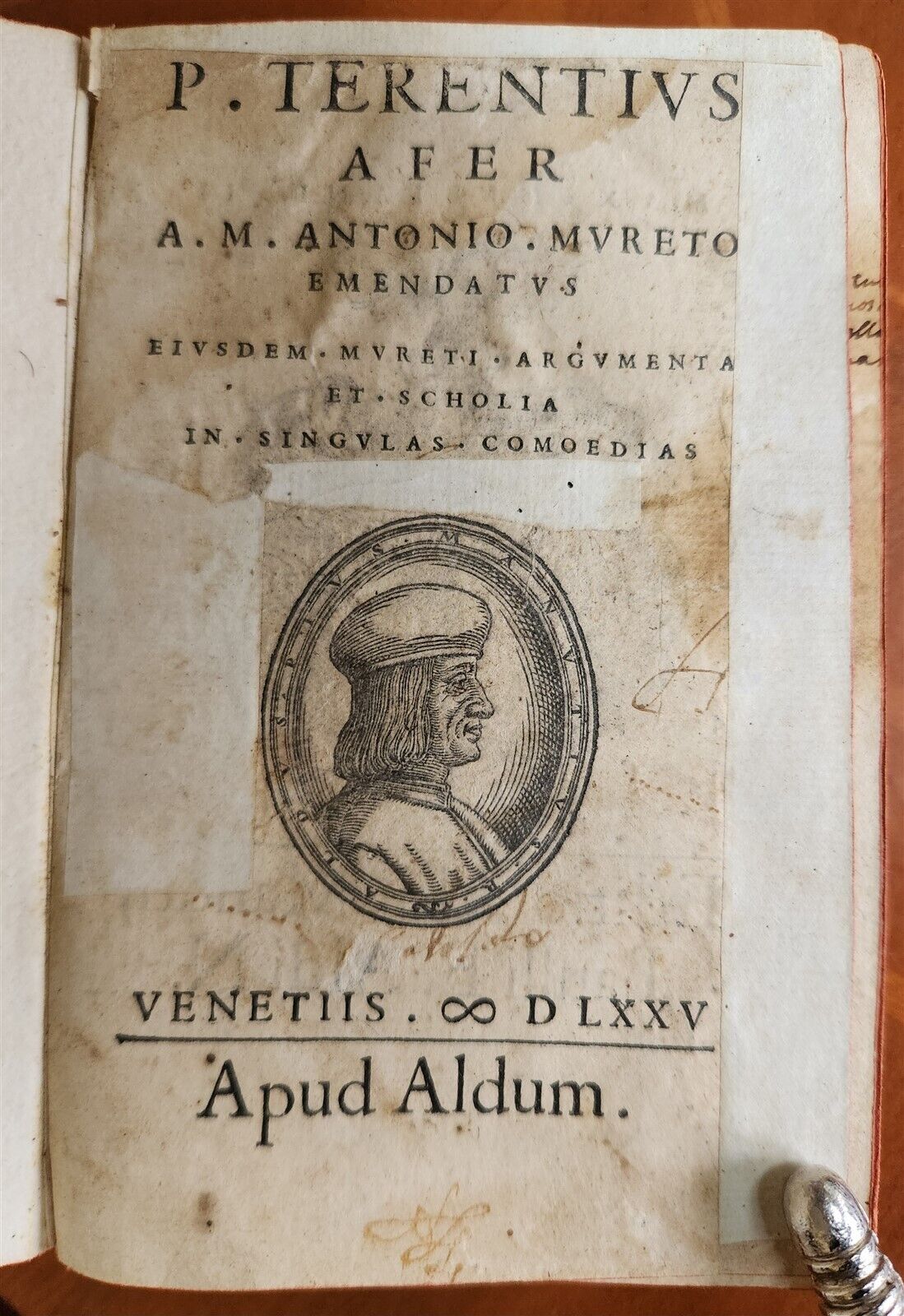 TERENTIUS. Terentius Afer A. M. Antonio Mureto emendatus eiusdem Mureti argumenta et scholia in singulas comoedias. Venice: apud Aldum; 1575Portrait to title page, Aldi Manutij mark on the reverse of the title, reinforcements to the title page, faded dampstain to first few leaves18th century leather binding , spine with raised bands and title label, marbled endpapers, red edgesDamage to the upper end of the spine, new additional endpapers.Size 4 by 5 3/4 inchesText in Latin================Please see my other auctions Thank You
