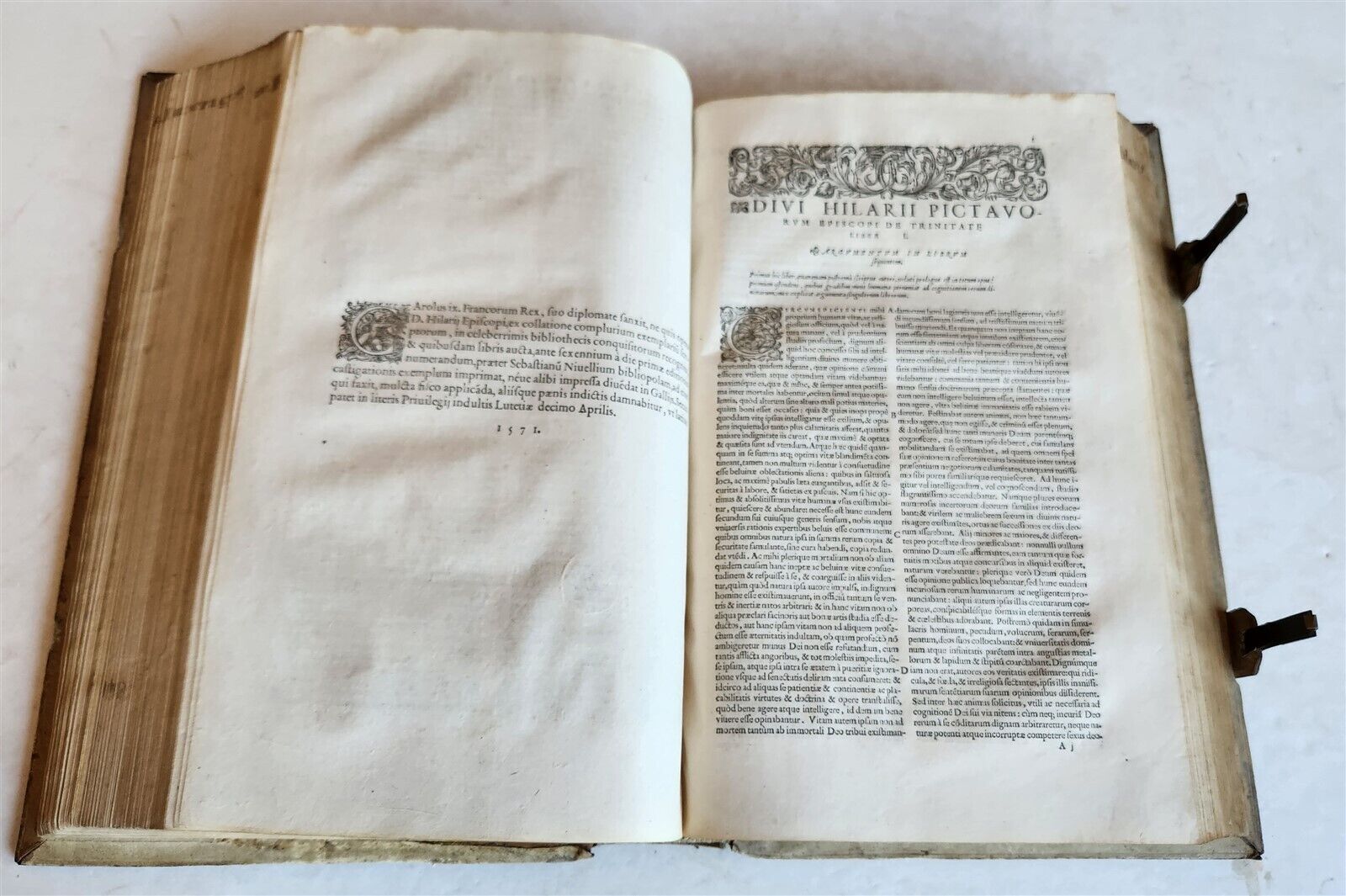 F. Francisci, Divi Irenaei Episcopi Lvgdvnensis, Et Martyris, Adversus Valentini Et similium Gnosticorum Haereses, (Saint Irenaeus, Bishop and Martyr of Lyons, against Valentinus and similar Gnostic heresies) Title page reads:"Divi Irenaei Episcopi Lvgdvnensis, Et Martyris, Adversus Valentini, Et similium Gnosticorum Haereses, Libri quinque: Iam denuo diligenti editorum codicum facta collatione, & vetustissimi praesertim cuiusdam manuscripti, ab innumeris erroribus repurgati, multisque locis & capitibus aucti; Annotationibus preterea in singula capita illustrati, quibus tum emendationum ratio redditur, tum quicquid ad antiquitatem Ecclesiasticam, & recentiorum Haeresewn euersionem maxime pertiner, explicatur. Accessit Praefatio ad Illustris. Cardinalem a Borbonio, qua de Diuina Providentia in tutanda aduersus Tyrannos & Hareticos Ecclesia; de utilitate ac necessitate lectionis Patrum; priorum etiam Gnosticorum cum posterioribus conspiratione atque consensu, copio se disseritus: Vita item D. Irenai, ex eius aliorumque Patrum scriptis collecta: Studio & opera F. Francisci Feu-ardentij, ordinis F. Minorum, in S. facultate Parisiensi Theologi, B. Adiecta est ad finem operis recens interpretatio Latina decem & octo priorum capitum libri primi, cim Scholiis D. Iacobi Billij, S. Michaelis in Eremo Abbatis. Reliqua, Epistola ad Lectorem indicabitParisiis, Apud Sebastianum Niuellium via Iacobaea sub Ciconiis. M. D. LXXV: 1575Full hand tooled pigskin binding, intact claspsManuscript title at the fore edgeSpine with raised bandsVery good interior condition, some spots to the back cover, faded dampstain at the lower inner corner of first few leavesFolio. Size 9 1/2 by 14 1/4"Text in Latin=====================Irenaeus (c.130 – c.202 AD) was a Greek bishop noted for his role in guiding and expanding Christian communities in the southern regions of present-day France and, more widely, for the development of Christian theology by combating heterodox or Gnostic interpretations of Scripture as heresy and defining proto-orthodoxy. Originating from Smyrna, he had seen and heard the preaching of Polycarp, who in turn was said to have heard John the Evangelist.Chosen as bishop of Lugdunum, now Lyon, his best-known work is Against Heresies, often cited as Adversus Haereses, a refutation of gnosticism, in particular that of Valentinus.To counter the doctrines of the gnostic sects claiming secret wisdom, he offered three pillars of orthodoxy: the scriptures, the tradition said to be handed down from the apostles, and the teaching of the apostles' successors.He is the earliest surviving witness to regard all four of the now-canonical gospels as essential.Irenaeus is venerated as a saint in the Catholic Church, Anglican Church, Lutheran Churches, the Eastern Orthodox Church, the Oriental Orthodox Churches, and the Assyrian Church of the East.======================Please see my other auctions Thank You
