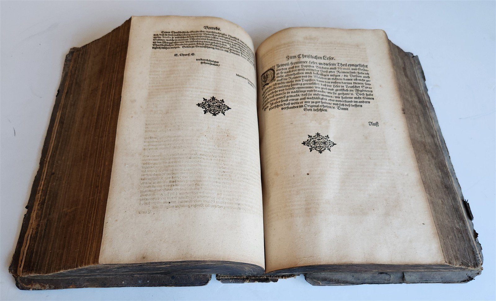 bound in full original German alum-tawed pigskin over wooden boards tooled in blind (lacking clasps, worn, joints cracked, endcaps and corners chipped with loss, surface grime; contents toned)