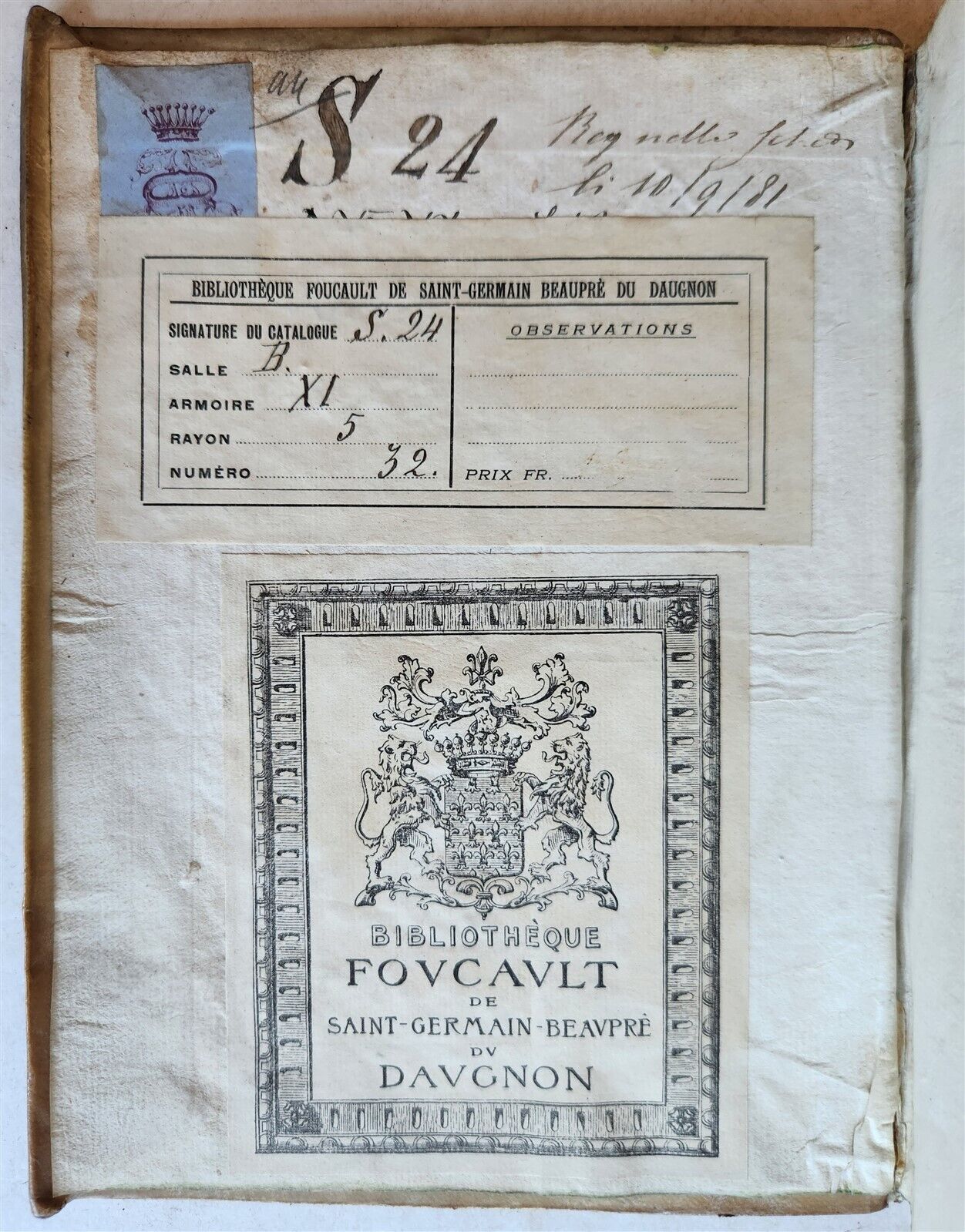 Ex Libris and stamp of the "Bibliotheque Foucault de Saint-Germain-Beaupre du Daugnon" (Raccolta Daugnon) on the front pastedown and title page.