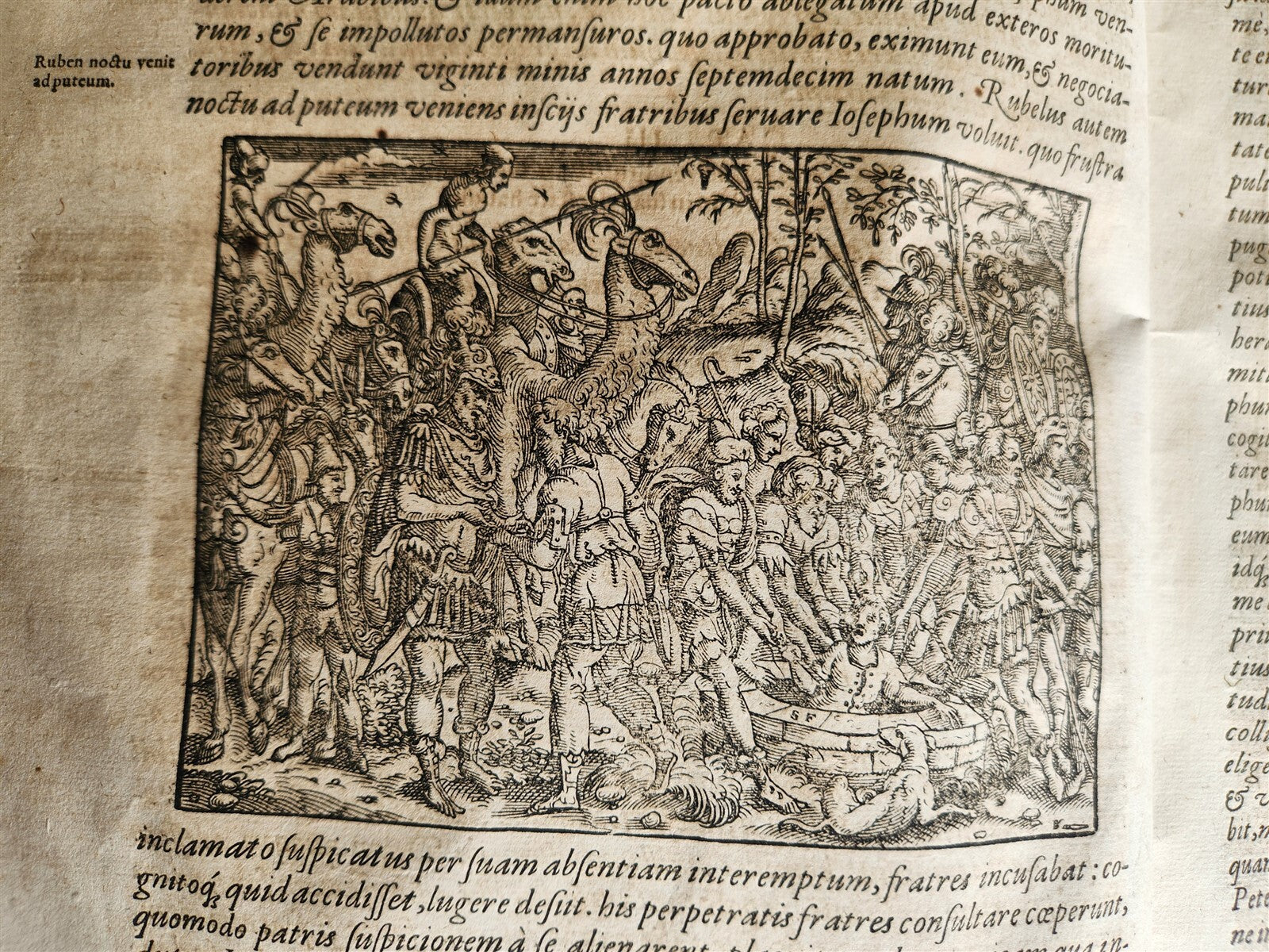 Large engraved allegorical frame on the title page, engraved arms of the Duke of Saxony on the preface, a large full-page woodcut depicting the genesis and 97 large woodcut vignettes in the text, engraved initials and headpieces.