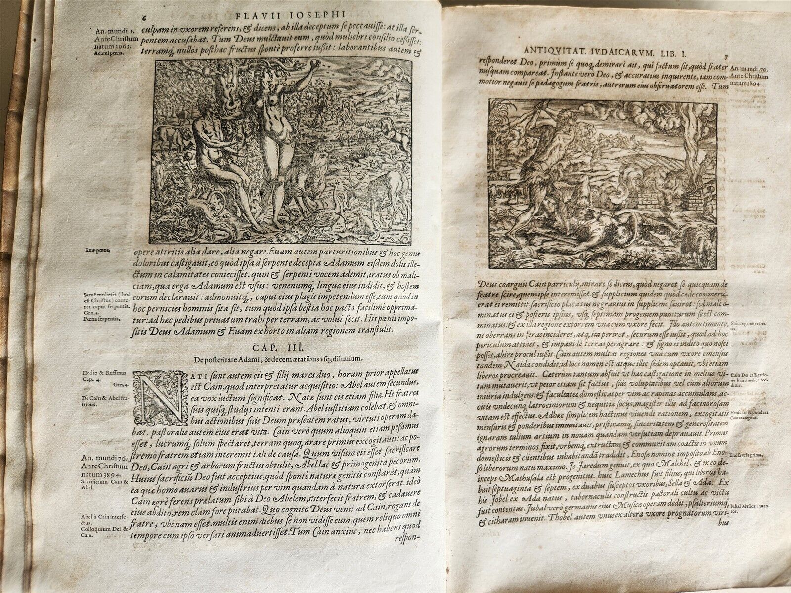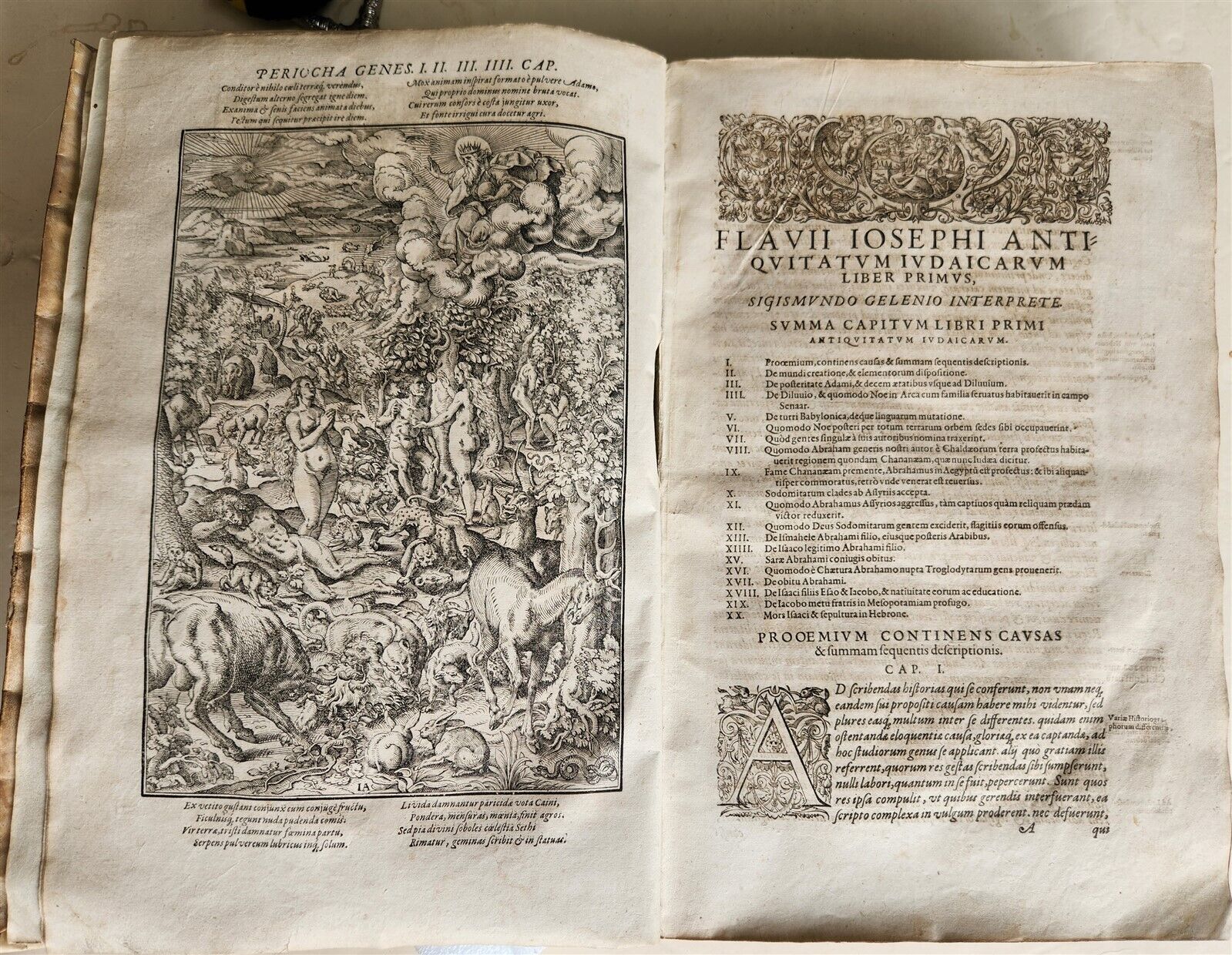 FLAVIUS JOSEPHUS (37-100 AD). Opera...De antiquitatibus Iudaicis...De bello iudaico..Contra Apionem...De imperio rationis, sive de Macchabaeis. Frankfurt: Feyerabend; 1580Monumental illustrated edition of the works of Flavius Josephus,with only two auction records (RBH),in the Latin version by Erasmus, Rufinus Tyrannius and Sigmund Gelen (1497-1554)Large engraved allegorical frame on the title page, engraved arms of the Duke of Saxony on the preface, a large full-page woodcut depicting the genesis and 97 large woodcut vignettes in the text, engraved initials and headpieces.Original vellum binding with manuscript title to the spine Some wear, renewed endpapersFolio. Size 10 by 14.5 inchesText in Latin================Please see my other auctions Thank You