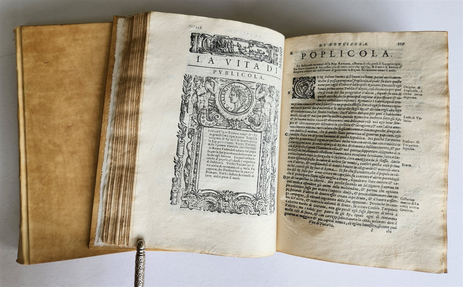 PLUTARCOVite de gli huomini illustri greci et romani.PLUTARCH(Lives of the Illustrious Greek and Roman Men)Venice: Valgrisi; 15822 volumesPrinter's mark on the title pages, woodcut headers and initials, woodcut frames framing the text on the first page of each chapter Later vellum Provenance: ownership note removed from the title page. Good condition, some toning, new endpapers' Size 6 1/2 by 9 1/4 inchesText in Italian================================