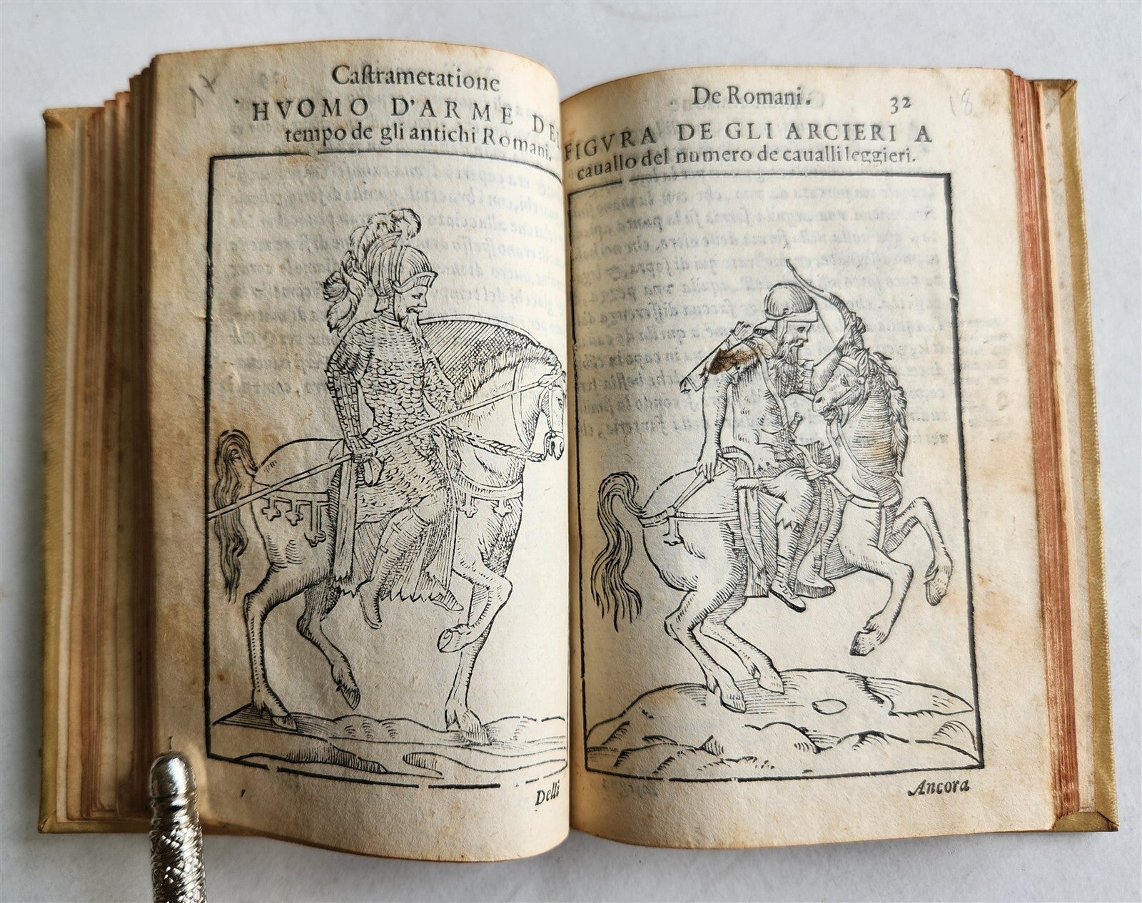 The work, written by the French antiquarian and humanist Guillaume du Choul (1496-1560), represents one of the most important military treatises of the 16th century, accompanied by detailed engravings that illustrate uniforms, armaments, and military techniques of antiquity, with an interesting addition on the Turkish militia by Francesco Sansovino.