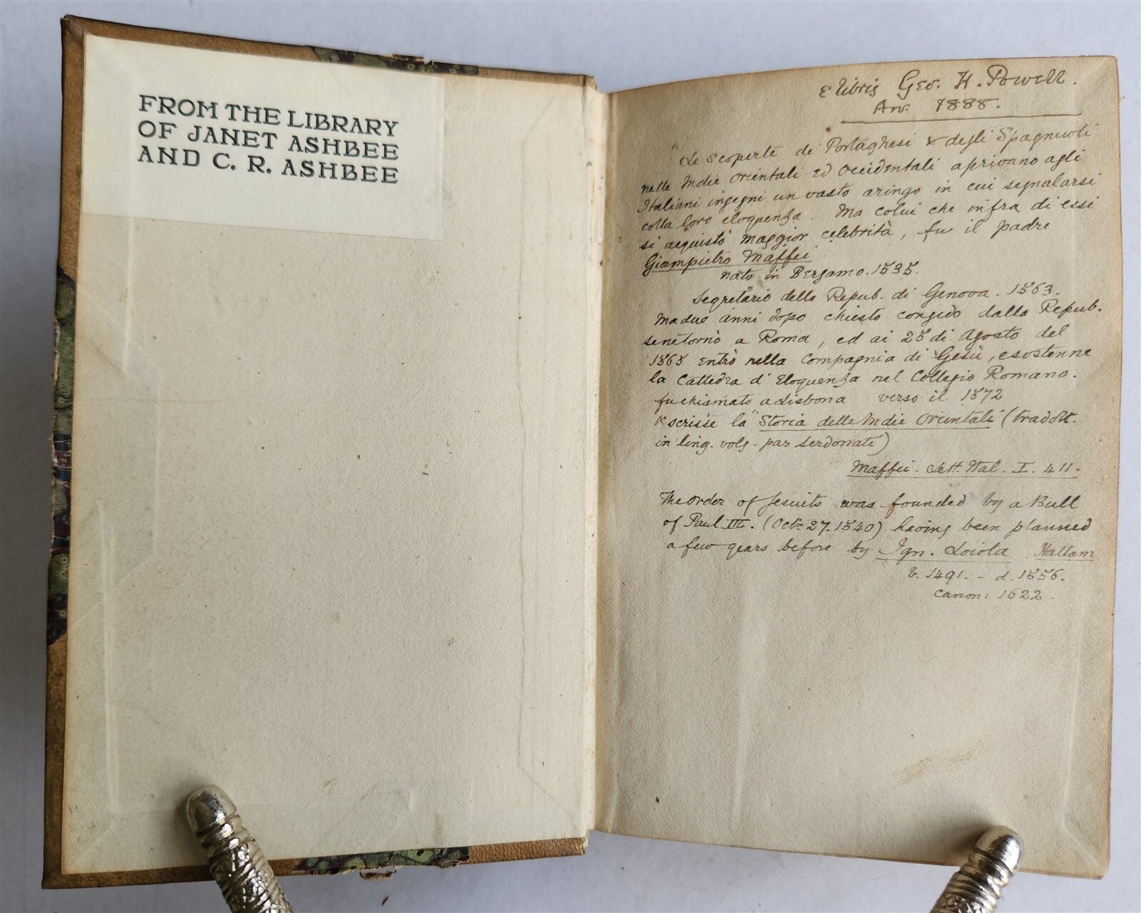 Maffei (Giovanni Pietro).De vita et moribus Ignatii Loiolae, qui Societatem Iesu fundavit, libri III..., Venice; 1585Title page within a woodcut frame, woodcut headpieces, initials and endpieces, printer's device on the colophon(restoration on the verso of the title page, minor browning and occasional foxing, minor woodworm holes in the lower corner of some leaves)19th century half-leather over marbled paper, gilt title label on the spine Provenance: "canonizatus 1622 ab Gregorio XV ai 12 di marzo"(manuscript note on the frontispiece regarding the canonization of Ignatius of Loyola) - George H. Powell (ownership note on the flyleaf)- Janet Ashbee and CR Ashbee (Charles Robert Ashbee 1863-1942, famous architect and decorator, bookplate on the flyleaf) Size 4 1/4 by 6 1/2 inchesText in Latin=============================Please see my other auctions Thank You