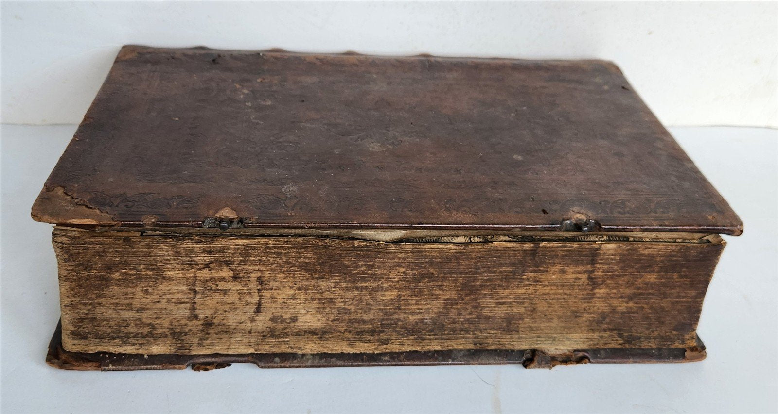 Original blind-tooled leather binding over wooden boards. Rebacked (spine restored in antique style, with raised bands)