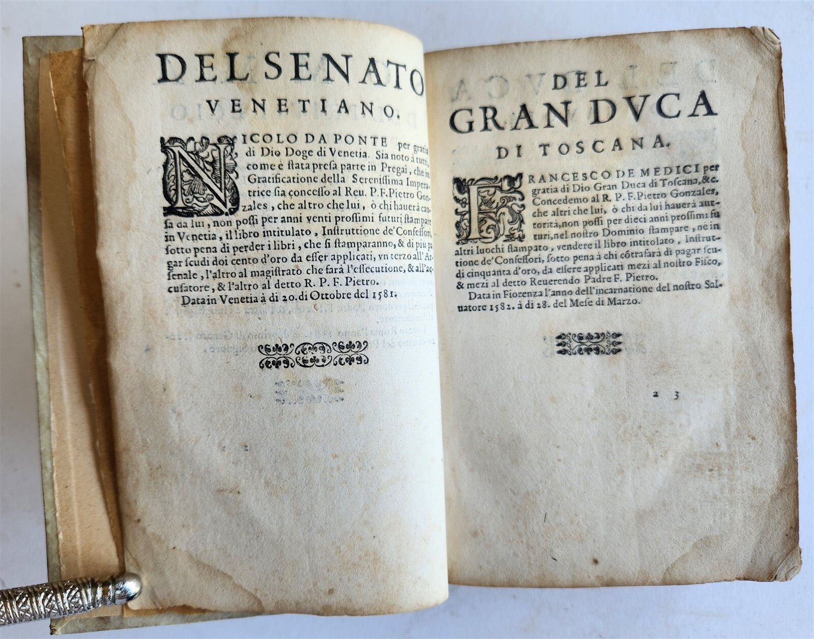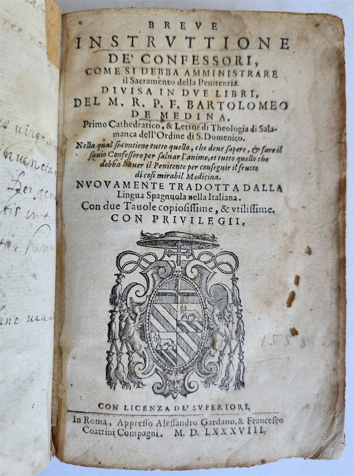 Breue instruttione de' confessori, come si debba amministrare il sacramento della Penitentia. Divisa in due libri, del M.R.P.F. Bartolomeo de Medina, ... Nella qual si contiene tutto quello, che deve sapere, & fare il savio confessore per salvar l'anime, et tutto quello che debba haver il Penitente per conseguir il frutto di cosi mirabil Medicina. Nuovamente tradotta dalla lingua spagnuola nella italiana. Con due tavole copiosissime, & utilissime. by Bartolomeo de MedinaAlessandro Gardano, & Francesco Coattini, Roma; 1588(Brief instruction for confessors, how the sacrament of Penance should be administered. Divided into two books, by MRPF Bartolomeo de Medina, ... In which is contained everything that a wise confessor must know and do to save souls, and everything that the Penitent must have to obtain the fruit of such a wonderful Medicine) (24), 239, (1) lvs.Complete. Later vellum binding (20th century) , with title on the spine. Restoration at the corners of the last 7 leaves, slight stain on the first leaves and light stain on the margins.Minor defects and occasional foxing. Title page with some wormholes.Period manuscript entries to the endpapersNewly translated from the Spanish language into Italian. Typographic device on the title page and colophon. Woodcut capital letters in the text. Size 4 1/4 by 6 1/2 inchesText in Italian===============Work of the Spanish theologian Bartolome de Medina (1527-1580). Translation into Italian by Petrus Gonzales (16th century). ==============Please see my other auctions Thank You