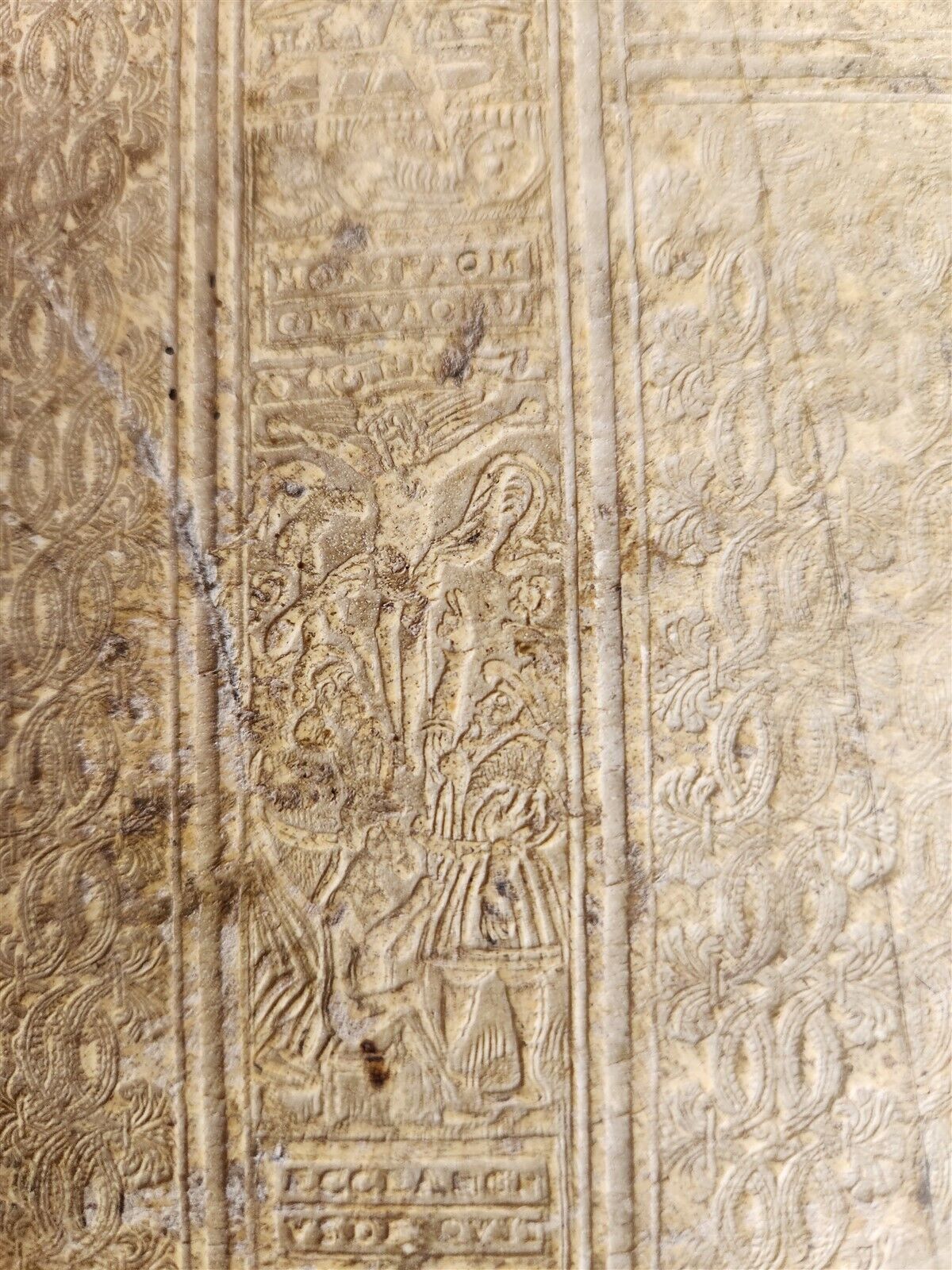 Original blind-stamped pigskin over wooden boards, with clasps ((intact in one volume and damaged in another)