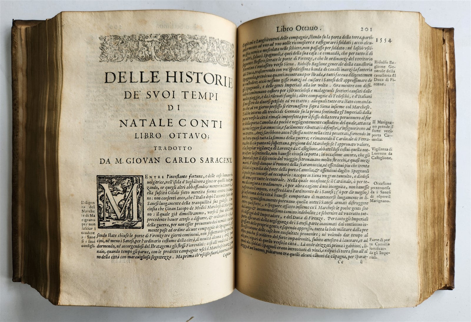 Conti (Natale) Delle historie de' suoi tempi2 volumesVenice, Damian Zenaro; 1589woodcut printer's device to title, woodcut initials and head-pieces, some light browning and foxing, original vellum over wooden boardsdouble morocco spine labels but lower lackingFront cover of the Vol.I detached. Very good interior, minor foxing[EDIT16 CNCE13170]First edition in Italian of this history of Italy, particularly renowned for its description of the Venetian area.Size 7 by 9 1/4 inchesText in ItalianEx-library==========================Natale Conti or Latin Natalis Comes, also Natalis de Comitibus and French Noel le Comte (1520 – 1582), was an Italian mythographer, poet, humanist and historian. Conti, whose family (according to his own statement) originated in Rome, was born in Milan.He described himself as "Venetian" because his working life was spent in Venice.==================================================Please see my other auctions Thank You