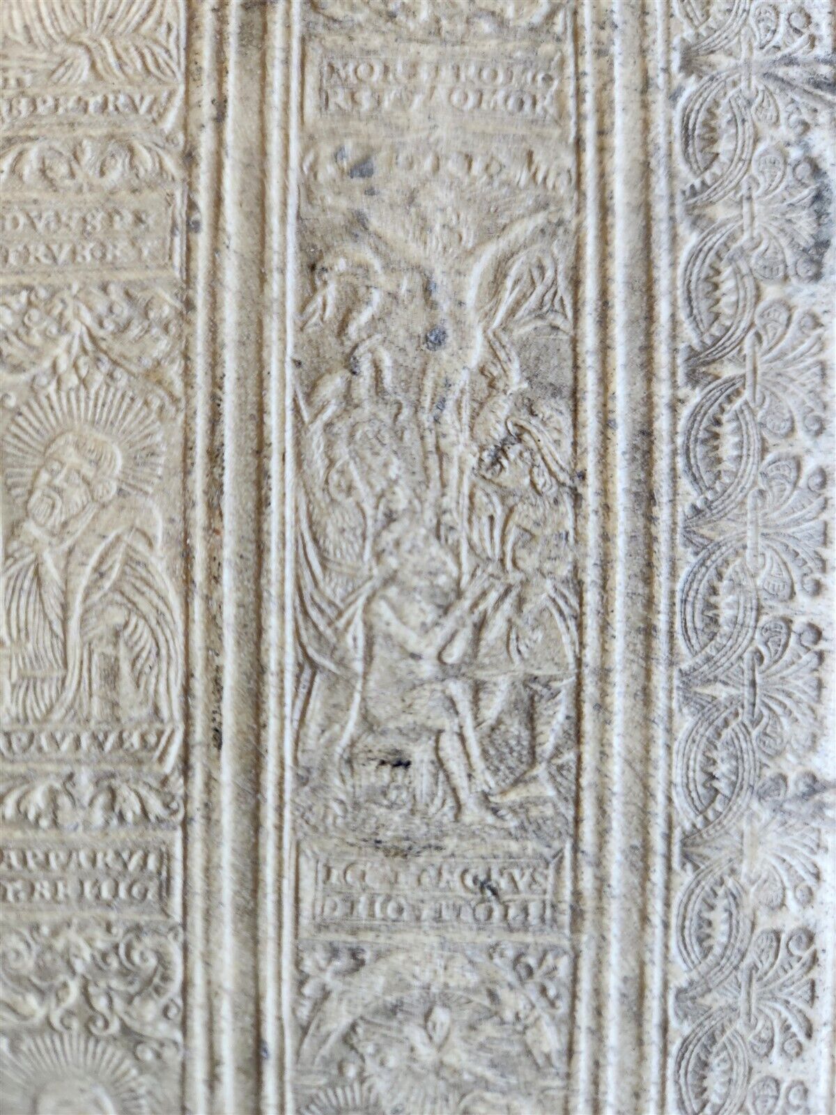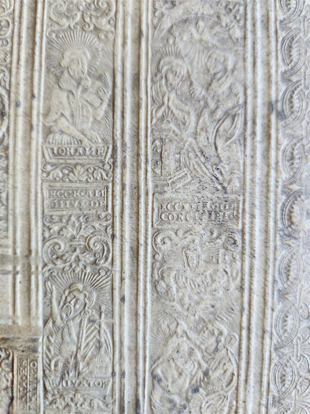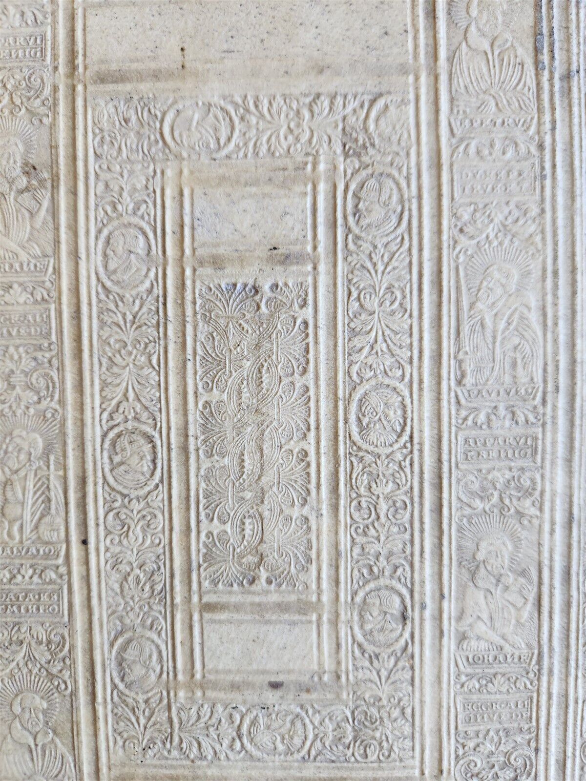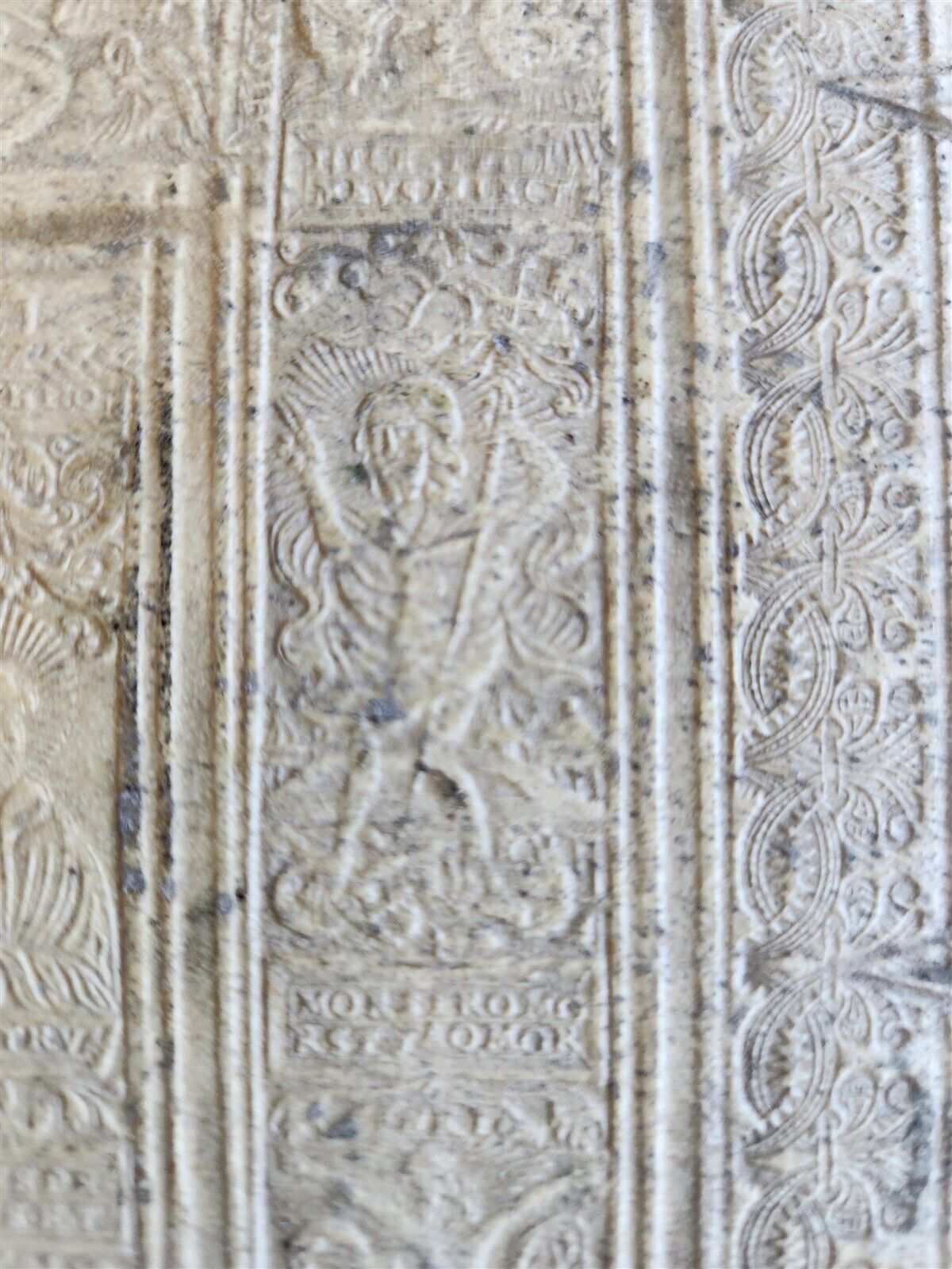 Original hand tooled pigskin over wooden boards, 1 (of 2) clasp