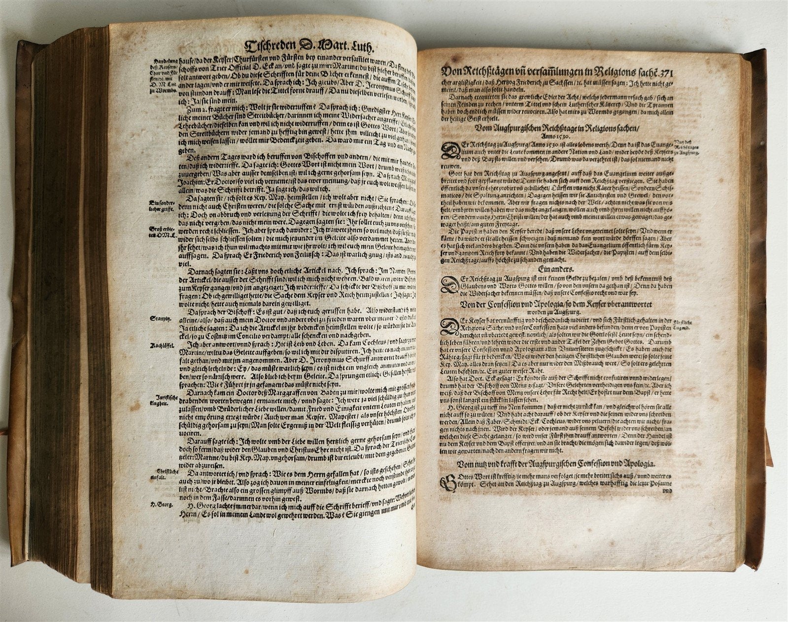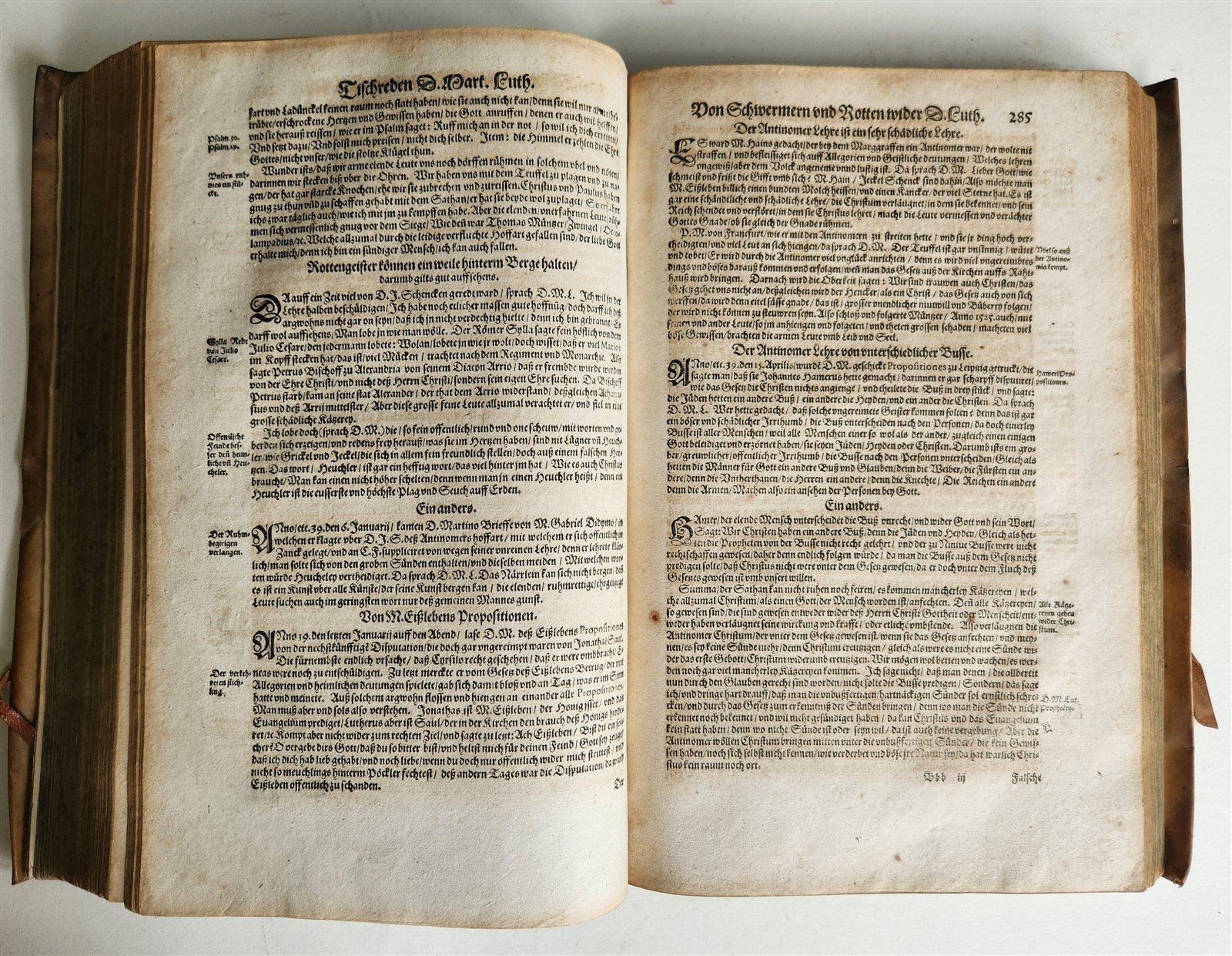 Later edition of Luther's Table Talks published by J. Aurifaber (first published in 1566), supplemented by Luther's "Prophecy" edited by Georg Walther, with a title in a beautiful figurative woodcut frame.