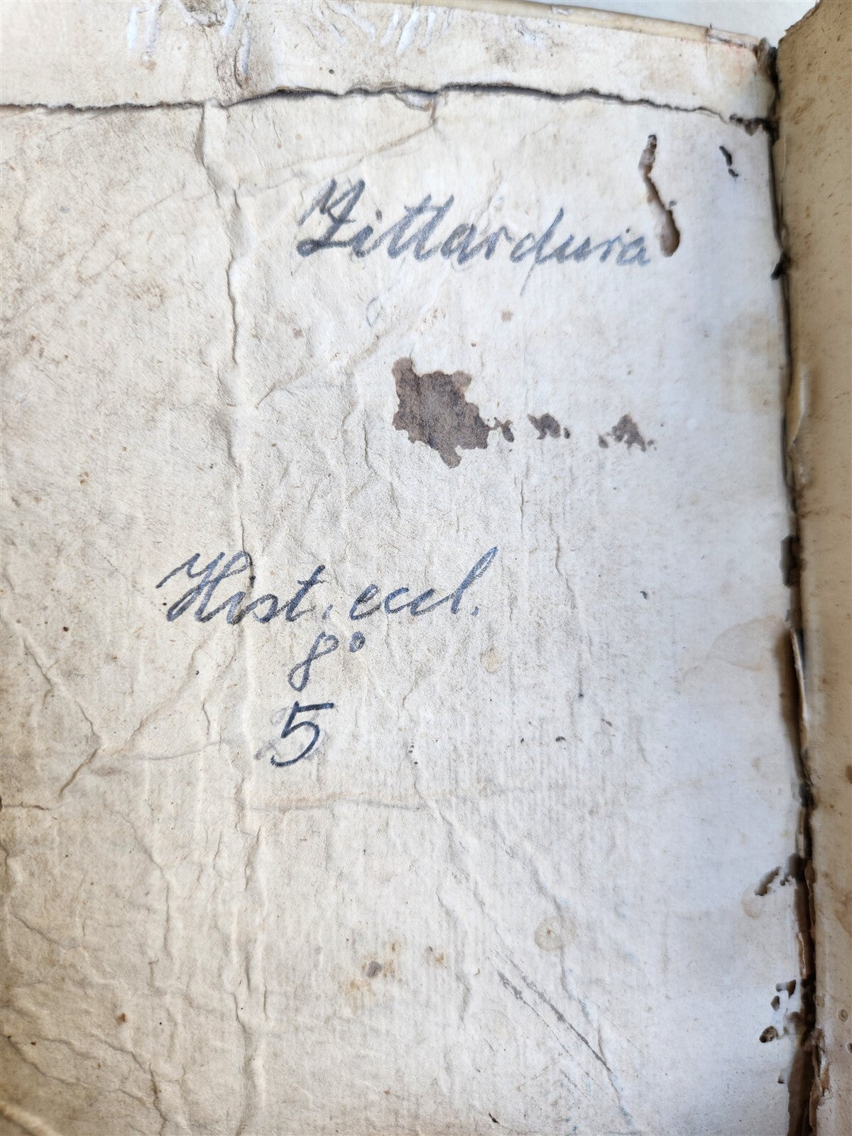 Kurtze Chronica. Das ist, historische beschreibung (neben andern mercklichen Puncten) der General Maister Prediger Ordens, und was zu eines jeden zeit fur Furnehme, Hochgelehrte auch Heylige Bruder und Schwestern im Prediger Orden gelebt haben. (Short chronicle. This is a historical description (among other notable points) of the General Master Preachers' Order, and which distinguished, highly learned, and holy brothers and sisters lived in the Preachers' Order at any given time)Dillingen, Johannes Mayer; 1596by Sittard, K.Dillingen, Johannes Mayer; 1596[3] pages, 175 pages, [1] page- VD16 S 6603. - Rare chronicle of the Dominican Order from the late 16th century. The author, Konrad Sittard (d. 1606), was a Dominican provincial in Upper Germany and Austria. Original vellum leather ties ( preserved only in fragments )The title page with tear repaired with archival tape, spots to the second leaf and last couple of leavesOtherwise good interior condition. Ex- monastery library.Size 6 by 7 3/4 inchesText in German===================Please see my other auctions Thank You