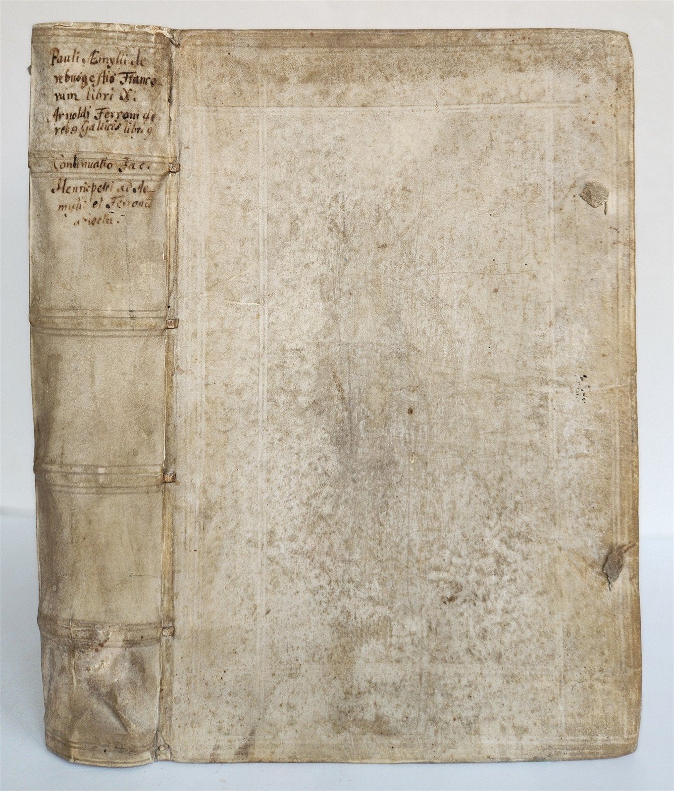 Original vellum binding, spine with raised bands and manuscript title, lacks ties