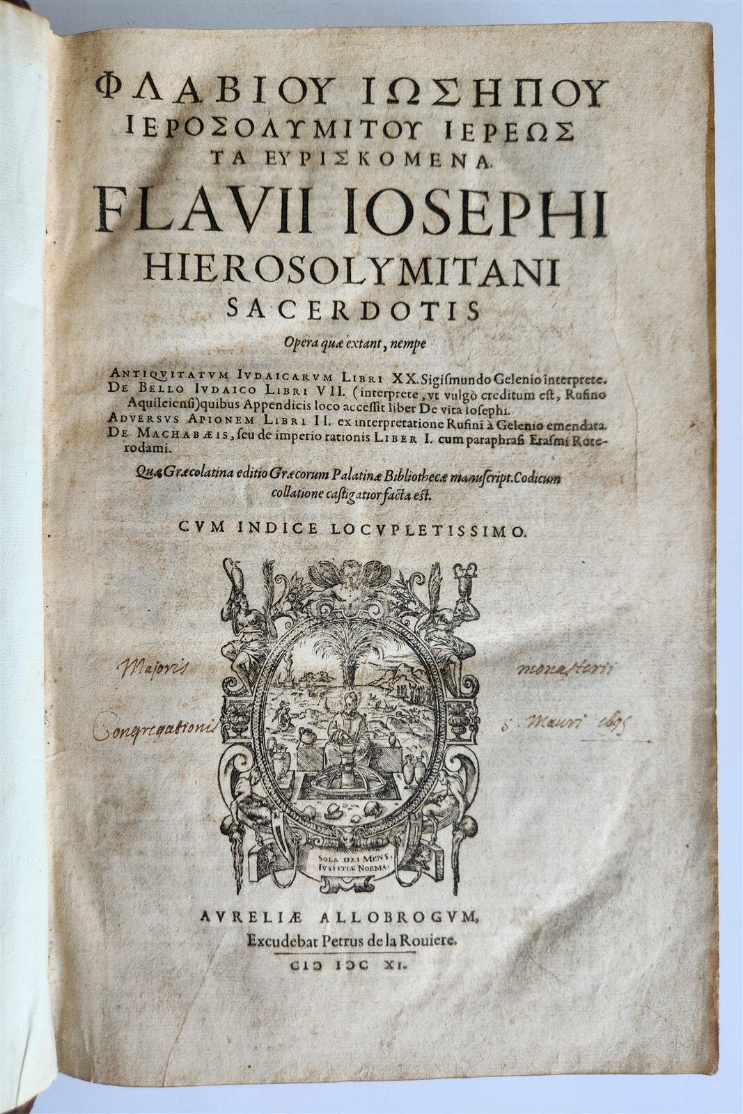 FLAVIUS JOSEPHUSOpera quae extant [...].Aureliae Allobrogum (Geneva); 1611 [8]-1102-[28] pp. Some foxing, minor wear- First Greek-Latin parallel edition, and second edition of the Greek text after the 1544-ed. of Basel. In a translation of Rufinus Aquileiensis. Woodcut printer's mark on title, ornamental head- and tailpieces, and some initials. - Ref. Hoffmann II:444. - Provenance: "Majoris monasterii Congregationis S. Mauri", i.e. Abbey of Marmoutier (manuscript entry dated 1695).Early 19th-century half marbled sheep over modern paper boards, gilt-ornamental flat spine (head and tail strengthened, endpapers renewed).Folio. Size 8 3/4 by 13 1/2 inchesText in Greek and Latin==============Please see my other auctions Thank You
