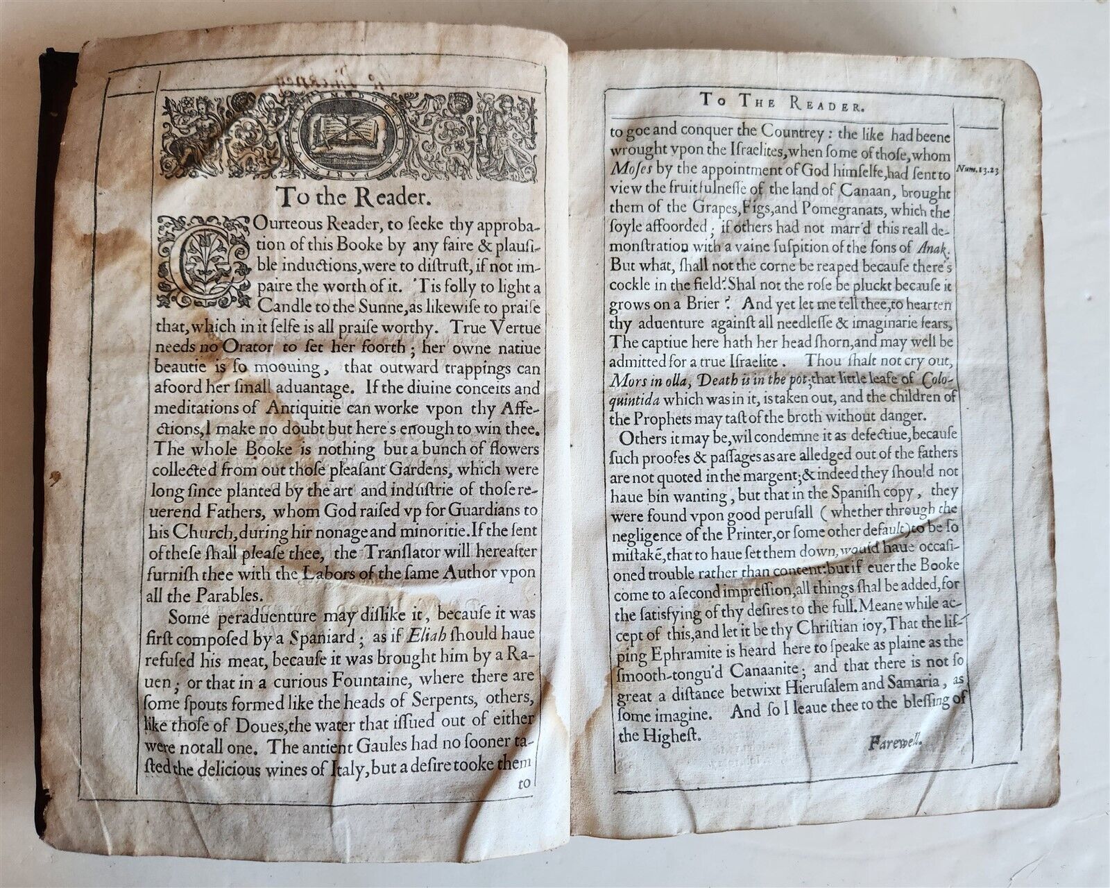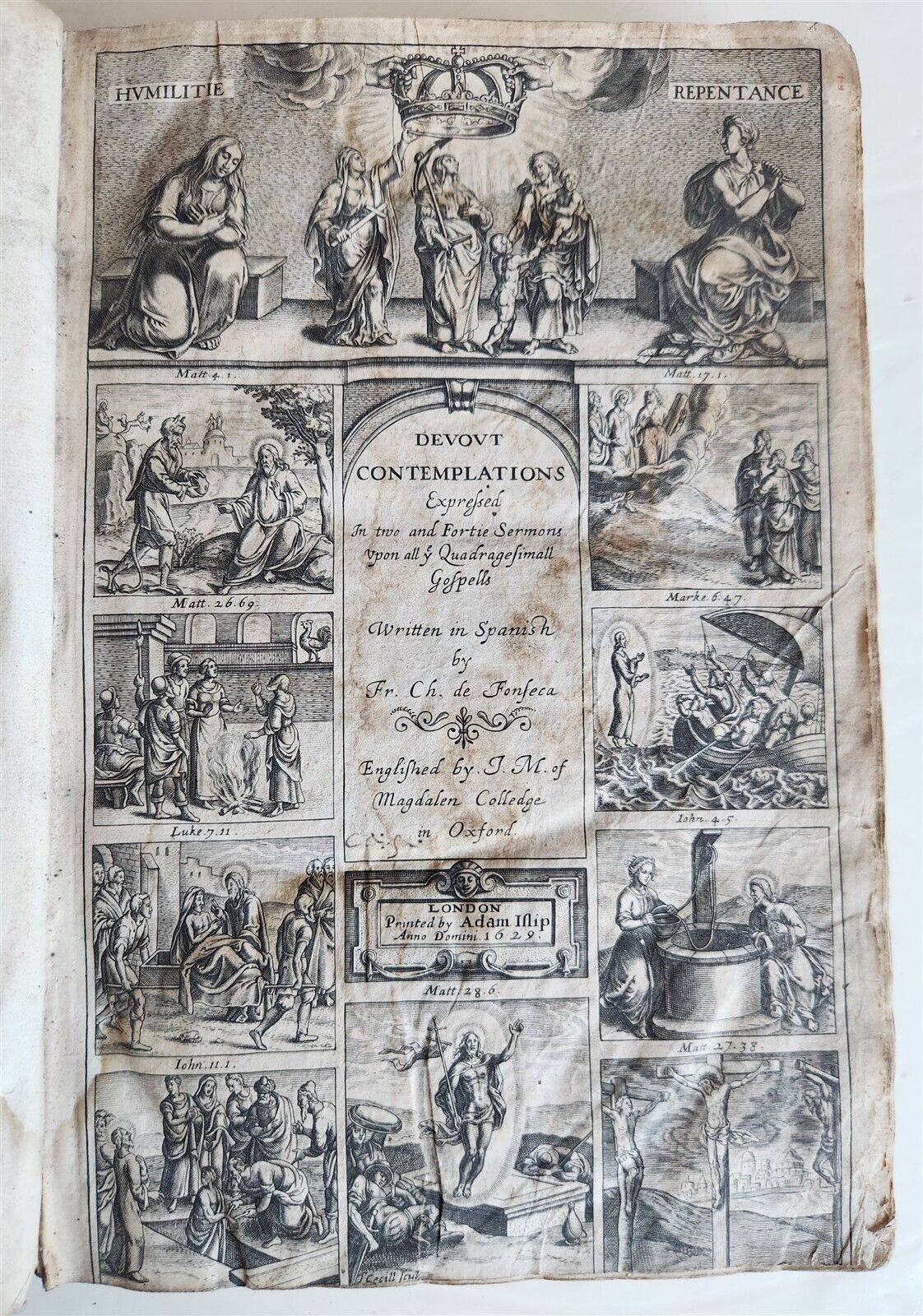 Devout contemplations expressed in two and fortie sermons upon all quadragesimall gospells, written in Spanishby Fr. Ch. de FonsecaLondon, Adam Islip; 1629Size 7.5 by 11.5"Original blind ruled leather.With copper title showing ten scenes from the life of Christ2 leaves, 648 pages, 9 leaves. - STC 11126. - Some wear, occasional dampstainsText in English==================================================Please see my other auctions Thank You