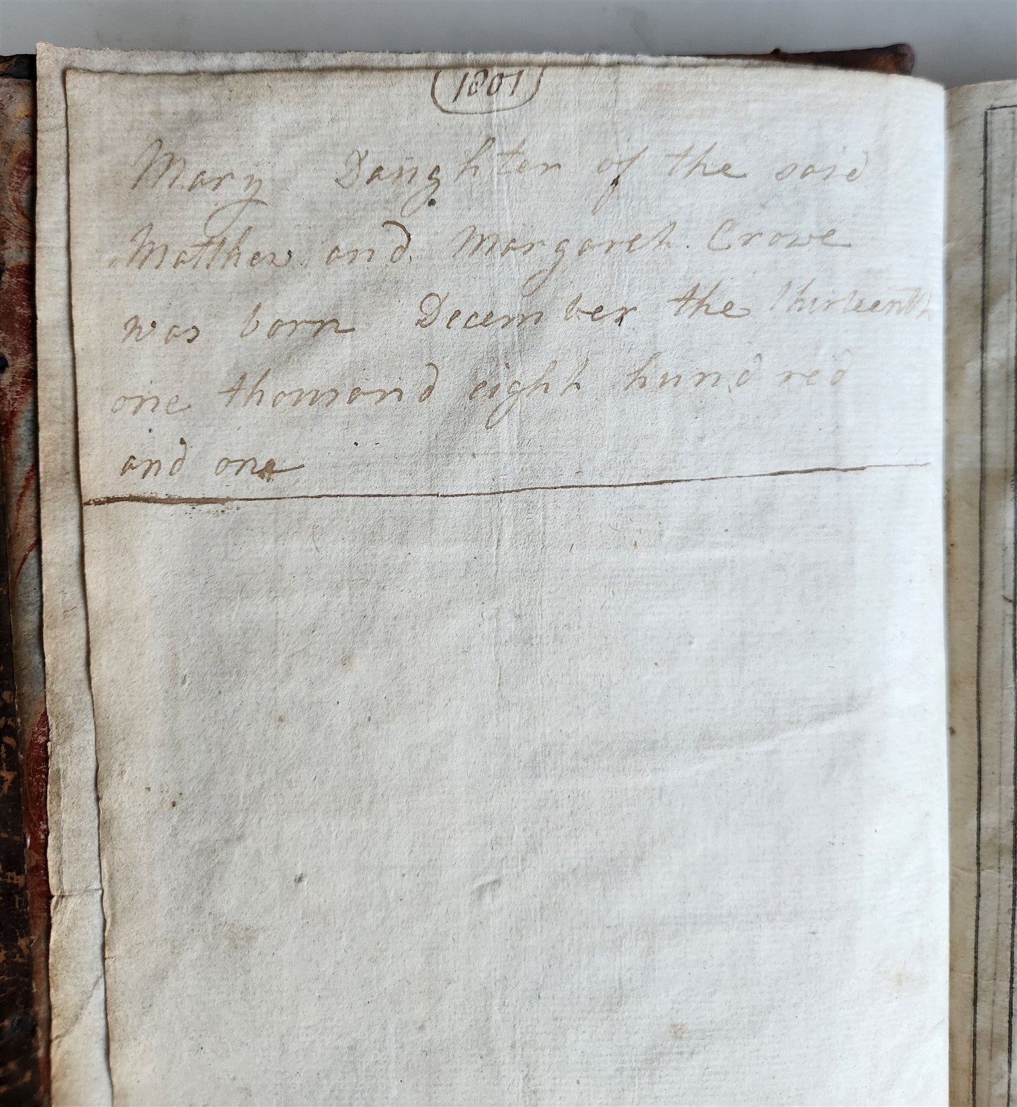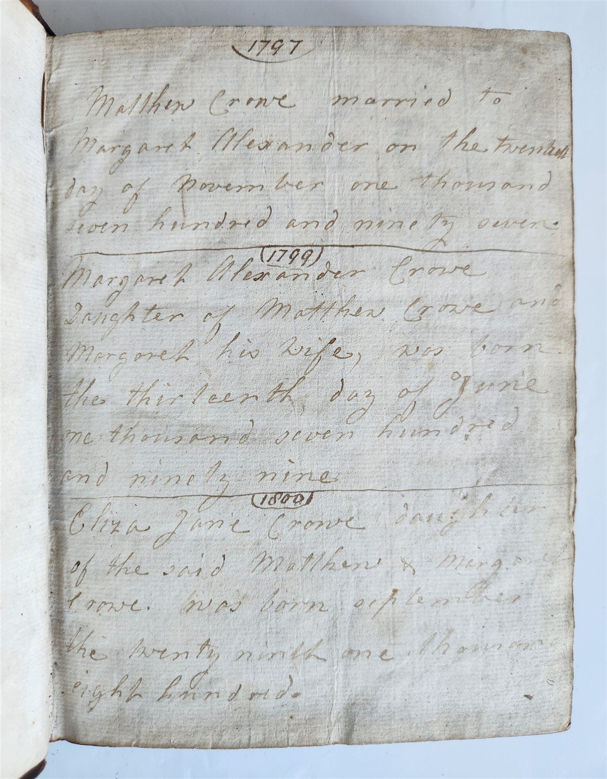 initial flyleaf with various manuscript genealogical entries such as recording the marriage of Matthew Crowe to Margaret Alexander on 20th November 1797, the birth of Margaret Alexander Crowe daughter of Matthew Crowe and Margaret 13th June 1799, also their two other daughters Eliza June Crowe on 29th Sept. 1800 and Mary on 13th December 1801