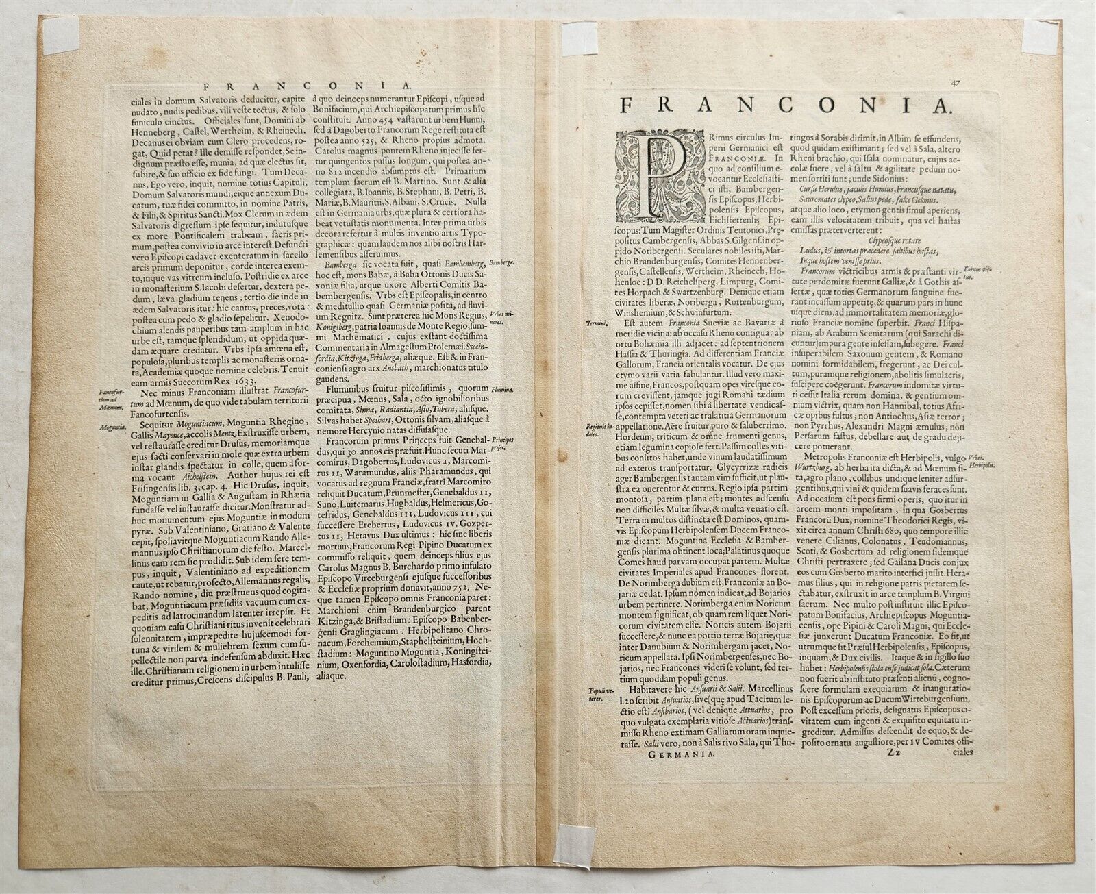MAP FRANCONIA VULGO FRANCKENLANDTAmsterdam: Willem Blaeu; 1640. (from : Theatrum orbis terrarum, sive Atlas novus)Map of Germany:Franconia regionHand coloredSize of the plate 15 by 19 inchesOverall 18 1/4 by 22 1/2 inchesVery good condition100% authentic