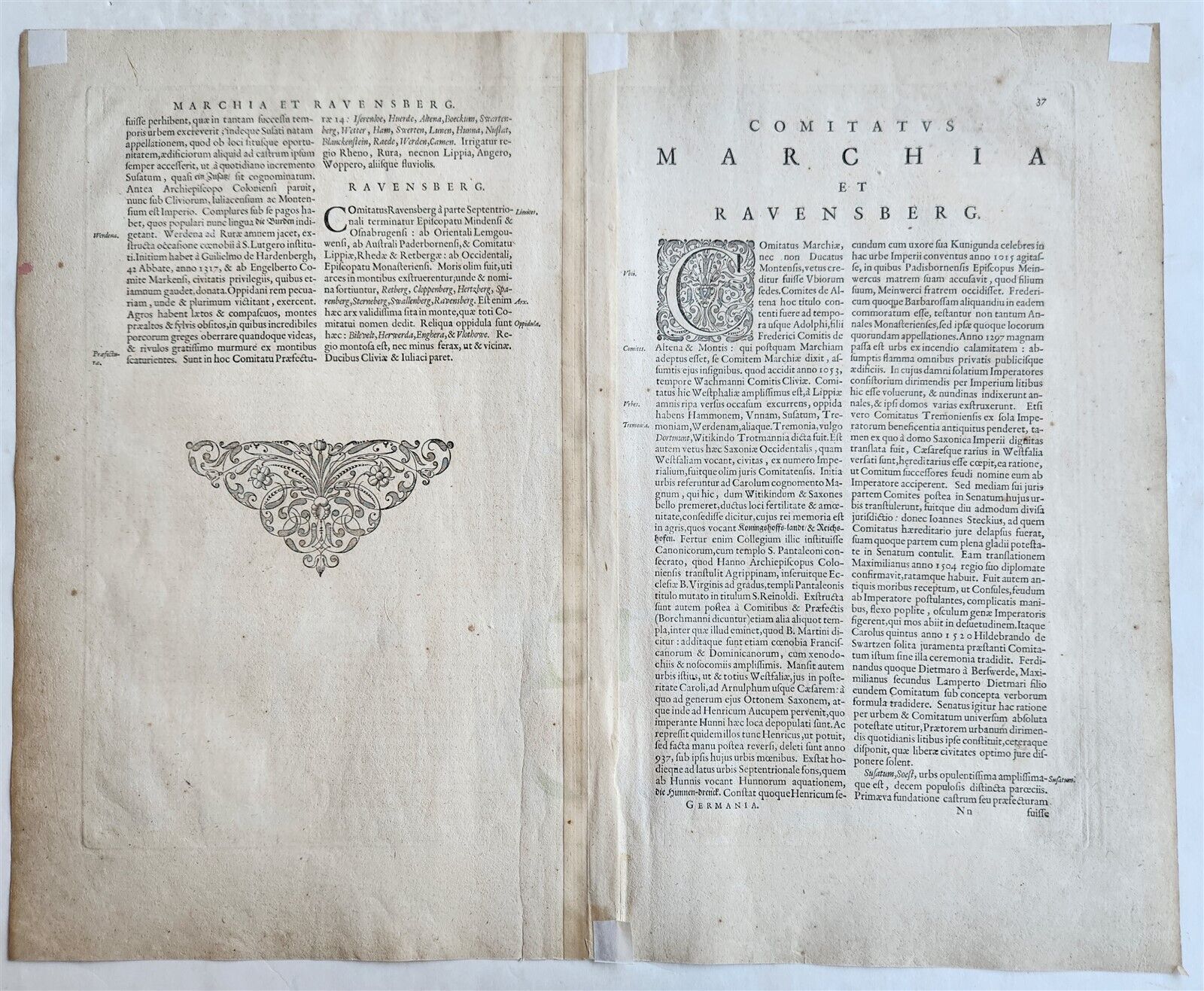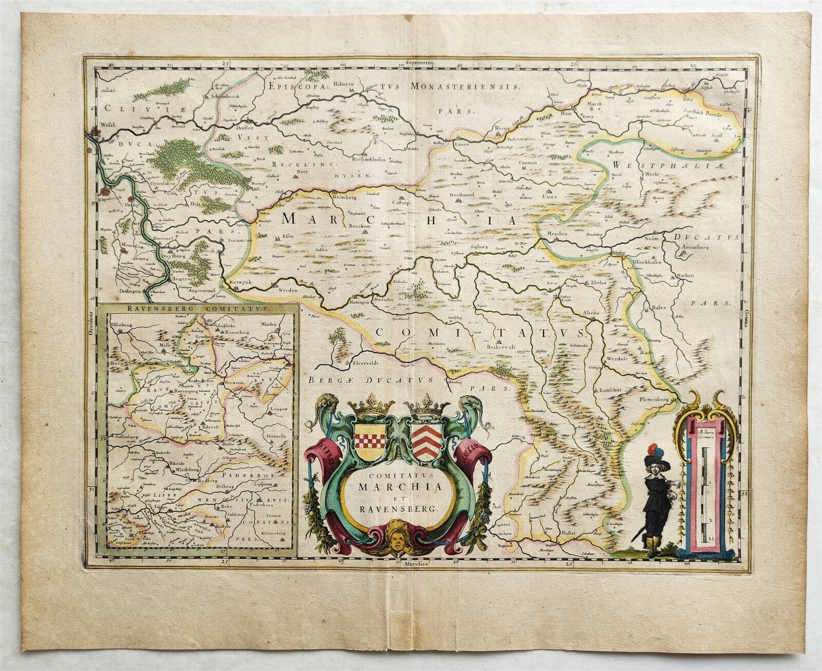 MAP COMITATUS MARCHIA et RAVENSBERGAmsterdam: Willem Blaeu; 1640. (from : Theatrum orbis terrarum, sive Atlas novus)Map of Germany :MARK & RAVENSBERGPlate size 14 3/4 by 19 1/2 inches (overall 18 1/2 by 22 1/2 inches)Hand coloredVery good condition100% authentic