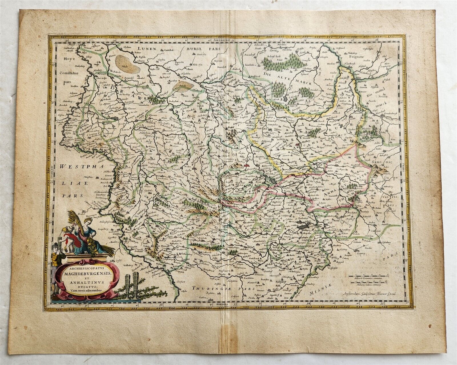 MAP ARCHIEPISCOPATUS MAGHDEBURGENSIS et ANHALTINUSAmsterdam: Willem Blaeu; 1640. (from : Theatrum orbis terrarum, sive Atlas novus)Map of Germany:Lower-Saxony and Saxony-Anhalt Hand coloredSize of the plate 14 1/2 by 19 inchesOverall 18 1/2 by 22 1/2 inchesVery good condition100% authentic=========================================Please see my other auctions Thank You