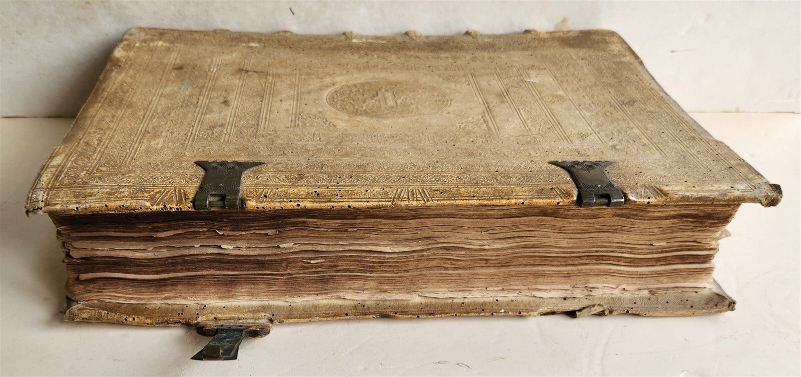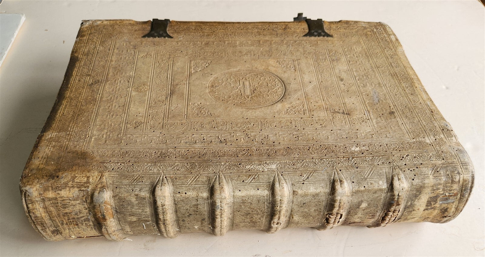16th or 17th century hand tooled pigskin over wooden boards binding (not original to the book, just a replacement used from another folio)