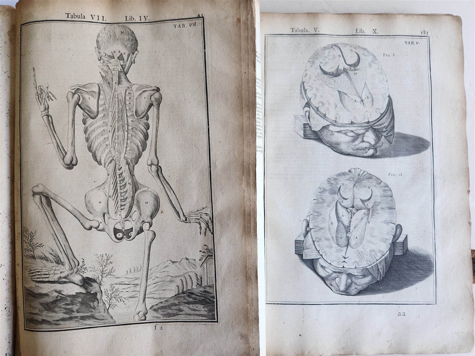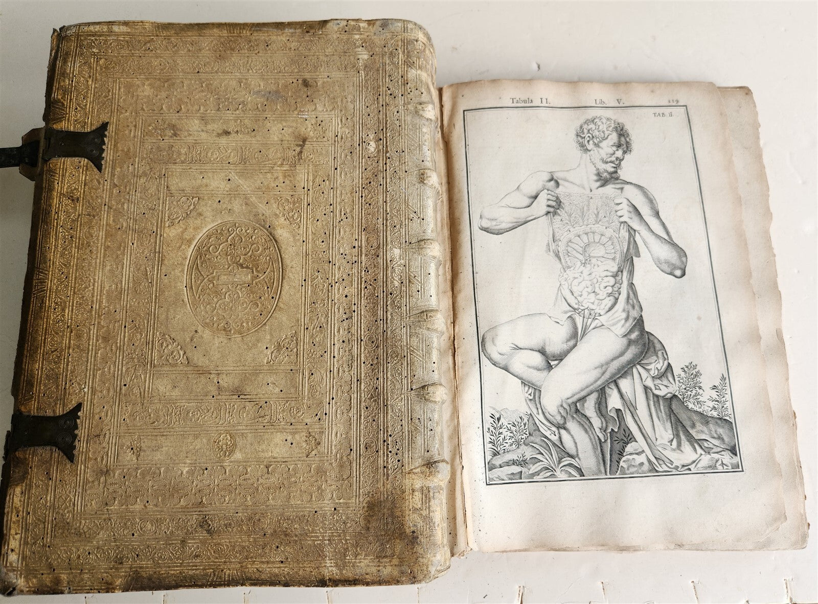 ADRIANI SPIGELII BRUXELLENSIS Opera Quae Extant OmniaDE FABRICA HUMANI CORPORIS2 parts in one volumeAmsterdam; 1645[Bound as issued with:]IULII CASSERII PLACENTINI(CASSERIO, Giulio (ca 1561-1616))Tabulae anatomicae LXXIIX ... cum supplemento XX Tabularum Danielis BucretiiLarge folio: 12 by 17"With 176 (of 177) full-page anatomical engravings. 16th or 17th century hand tooled pigskin over wooden boards binding (not original to the book, just a replacement used from another folio)Binding is worn, with wormholes, lacks one clasp.The bookblock broken into few parts, some leaves are detached.The bookblock is loosely inserted into binding, not actually bound in.One leaf is missing (pp. 31-32)Paper fragile.A few occasional spots, otherwise good.Text in Latin=====================Adriaan van den Spiegel (or Spieghel), name sometimes written as Adrianus Spigelius (1578 – 7 April 1625), was a Flemish anatomist born in Brussels. For much of his career he practiced medicine in Padua, and is considered one of the great physicians associated with the city. At Padua he studied anatomy under Girolamo Fabrici.His best written work on anatomy is De humani corporis fabrica libri X tabulis aere icisis exornati, published posthumously in 1627. He borrowed the title from De humani corporis fabrica, written by his fellow countryman, Vesalius, who had also studied in Padua. The book was intended as an update in medical thinking (a century later) about anatomy. In his 1624 treatise De semitertiana libri quatuor, he gave the first comprehensive description of malaria.======================Please see my other auctions Thank You