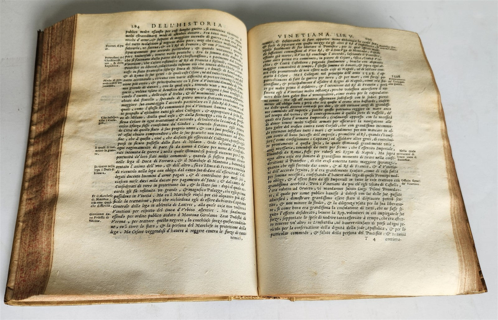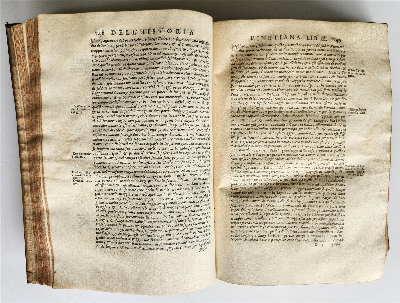 Paruta (Paolo) Historia Vinetiana Venice, heirs of Tomaso Giunti, 16452 parts in 1 volume general title with engraved portrait vignette and divisional with ornamental device, damp-staining to general title and elsewhere occasionally, some light and generally marginal foxing and spotting, spot to the lower part of the spineoriginal vellum with manuscript title to the spineSize 7 1/4 by 10 1/4 inchesText in ItalianEx-library==========================Paolo Paruta (14 May 1540 – 6 December 1598) was a Venetian historian and statesman.He was born at Venice of a Luccan family. After studying at Padua he served the Republic of Venice in various political capacities, including that of secretary to one of the Venetian delegates at the Council of Ten.In 1562 he accompanied the ambassador Michele Suriano to the Court of Emperor Maximilian II and acted as official historiographer of the Republic; during which office he delivered the funeral oration for those killed at the naval battle of Lepanto (1571). After the change of government he was made savio di Terraferma (minister for the administration of the Terraferma), and became a senator.In 1579 he was appointed official historian to the republic, in succession to Luigi Contarini. He took up the narrative from where Cardinal Bembo had left it, in 1513, and brought it down to 1551. He was made provveditore to the Chamber of Loans in 1580, Commisario del Cadore (1589), savio del consiglio in 1590, ambassador to the pope in Rome (1592–95) and governor of Brescia (1590–92).In 1596 he was appointed procurator of St. Mark's (1596, next in dignity to the doge), and provveditore delle fortezze (superintendent of fortifications) in 1597. He died in Venice.==================================================Please see my other auctions Thank You