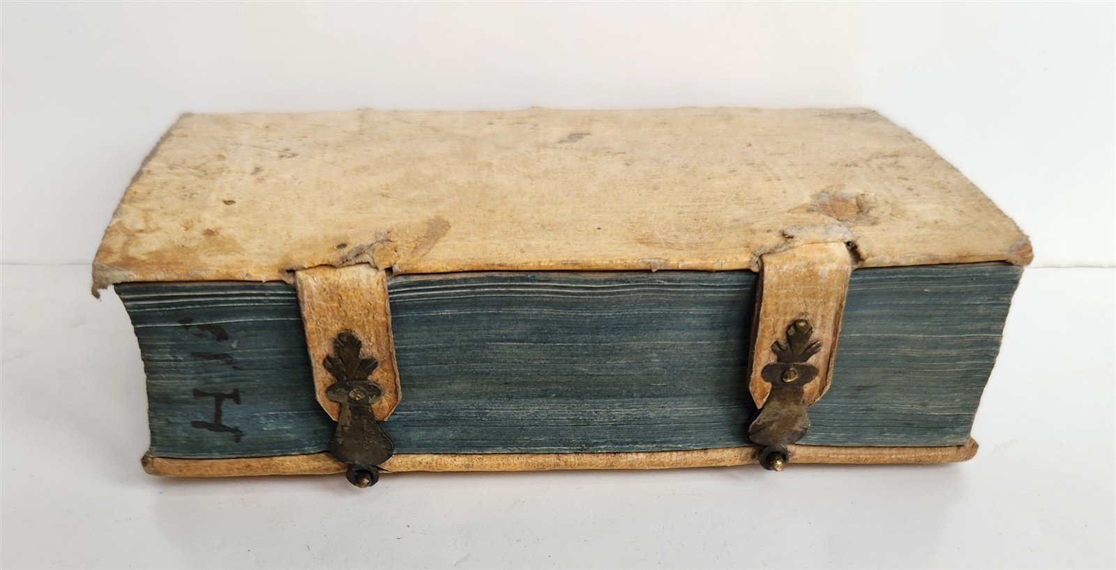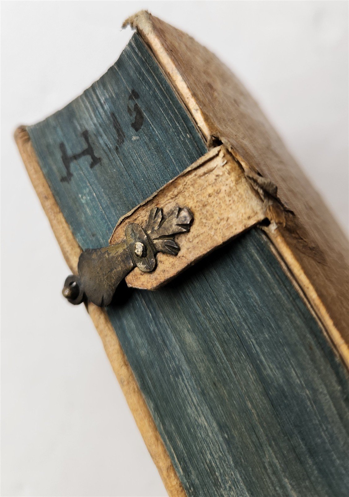 Original blind-tooled pigskin binding over wooden boards with manuscript title at the ribbed spine, two intact clasps.
