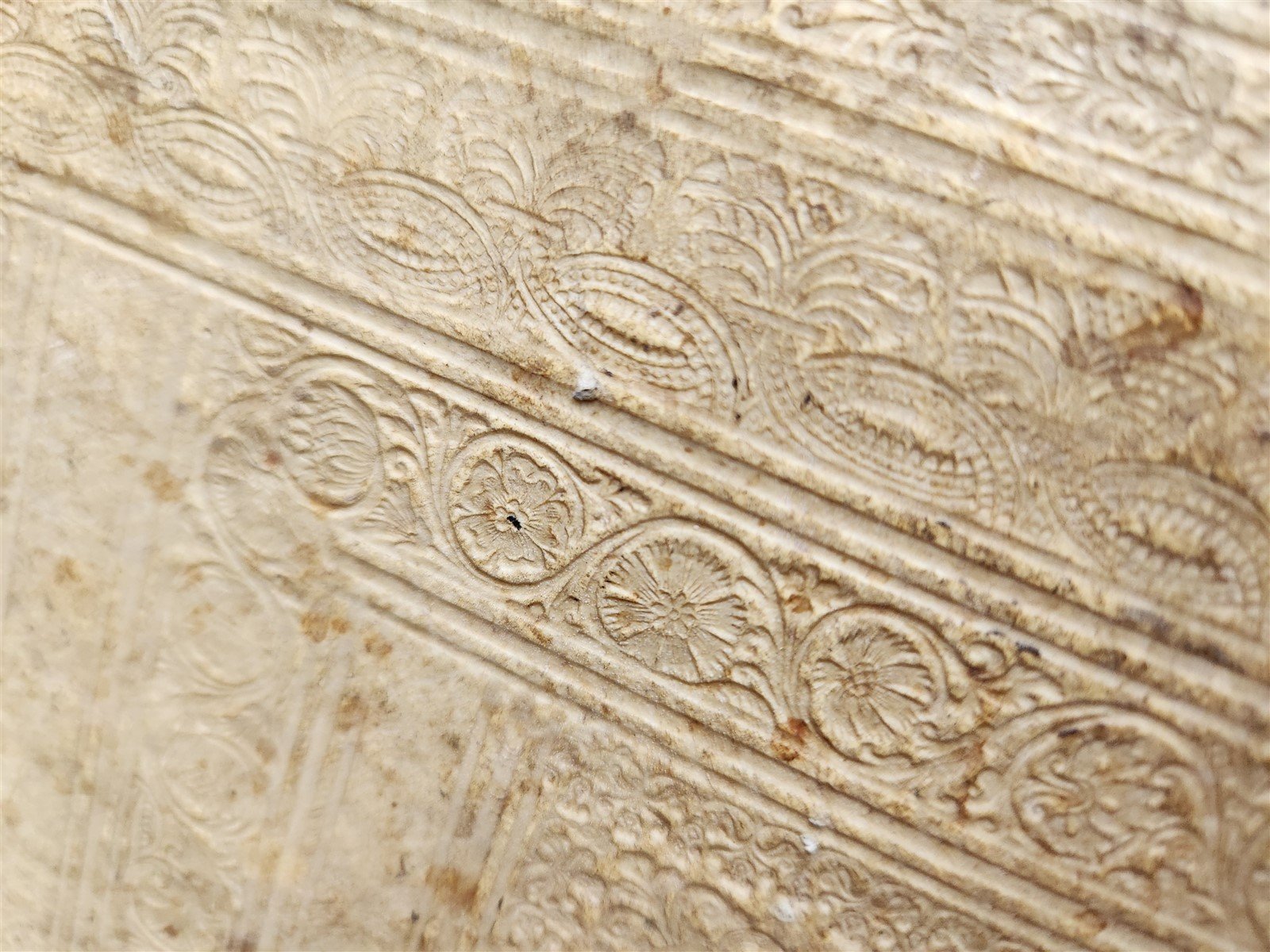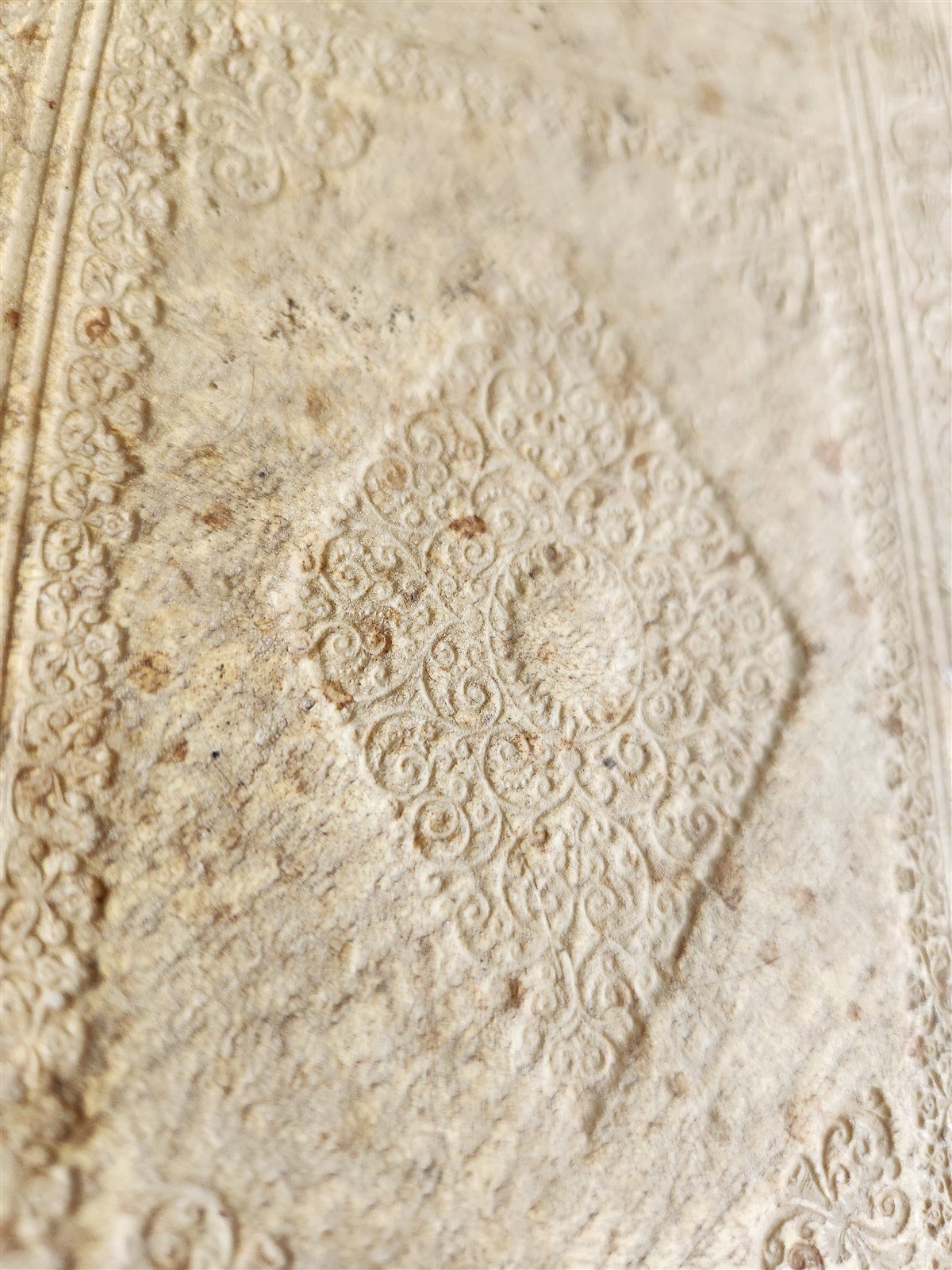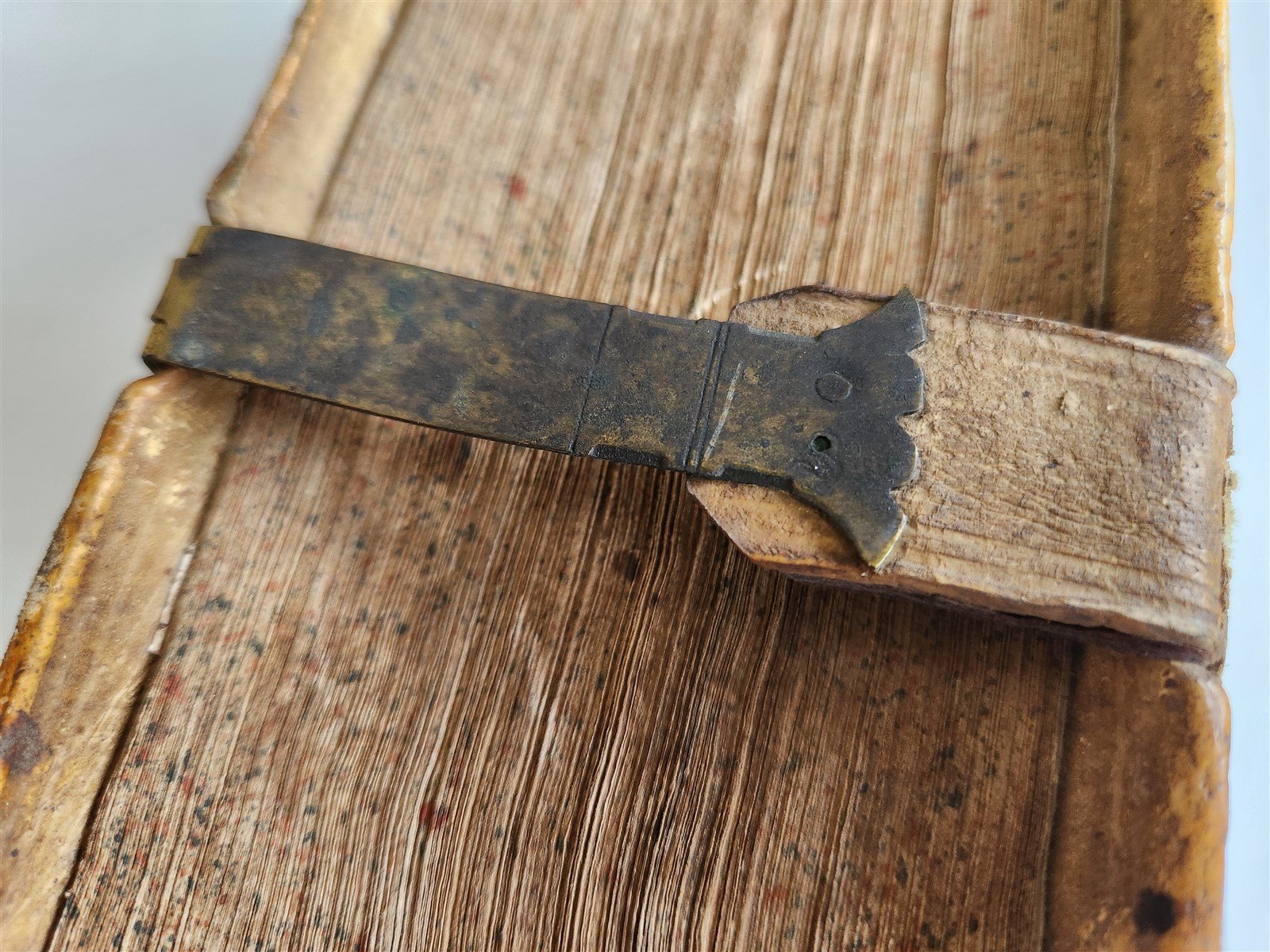Original hand tooled pigskin over wooden boards, spine with raised bands and manuscript title, intact clasps.