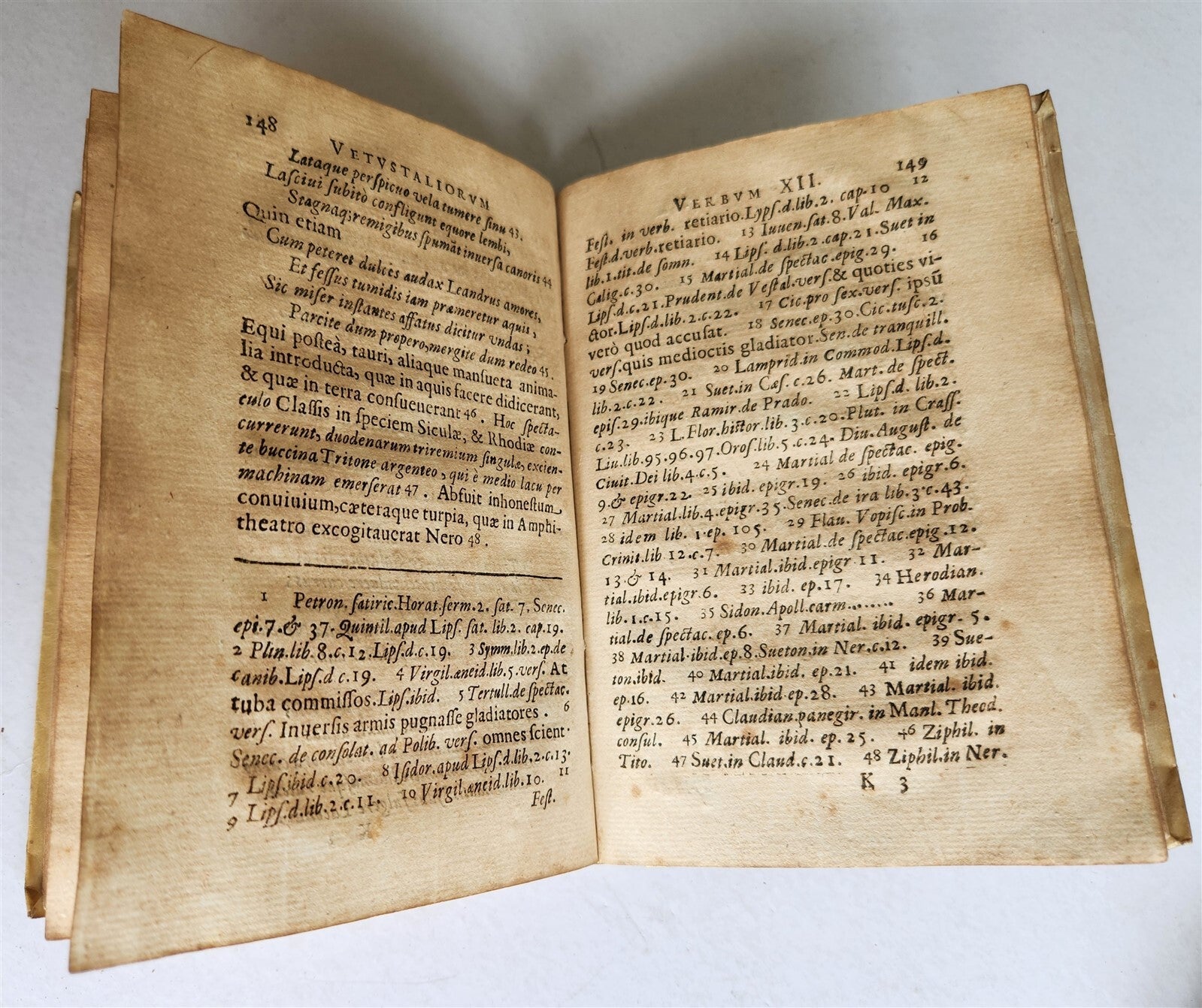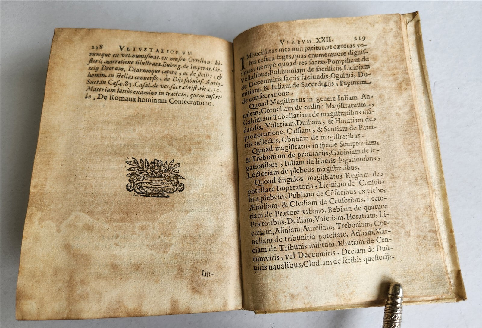 TOLOMEI, FrancescoFRANCISCUS PTOLEMAEUSVetustalia seu vetustatis admiranda quibus Franciscus Ptolomaeus Patric. Sen. In almae urbis Archigymn. Pandect. Interpres.Plurium varietate verborum Lusit. Idibus Novemb. MDCLXIIRome: De Lazzari, 1664Calcographic frontispiece and headpieces, woodcut initials and tailpieces.ToningOriginal vellum, manuscript title on the spine and manuscript on the back of the front cover (with date - 1664)Provenance: Gustavo Camillo Galletti (stamp on the frontispiece)- Horace de Landau (ex libris on the flyleaf)First edition of this study on Roman customs such as theatrical and circus performances, weddings, triumphs, funerals. Size 5 by 7 inchesText in Latin============================Please see my other auctions Thank You