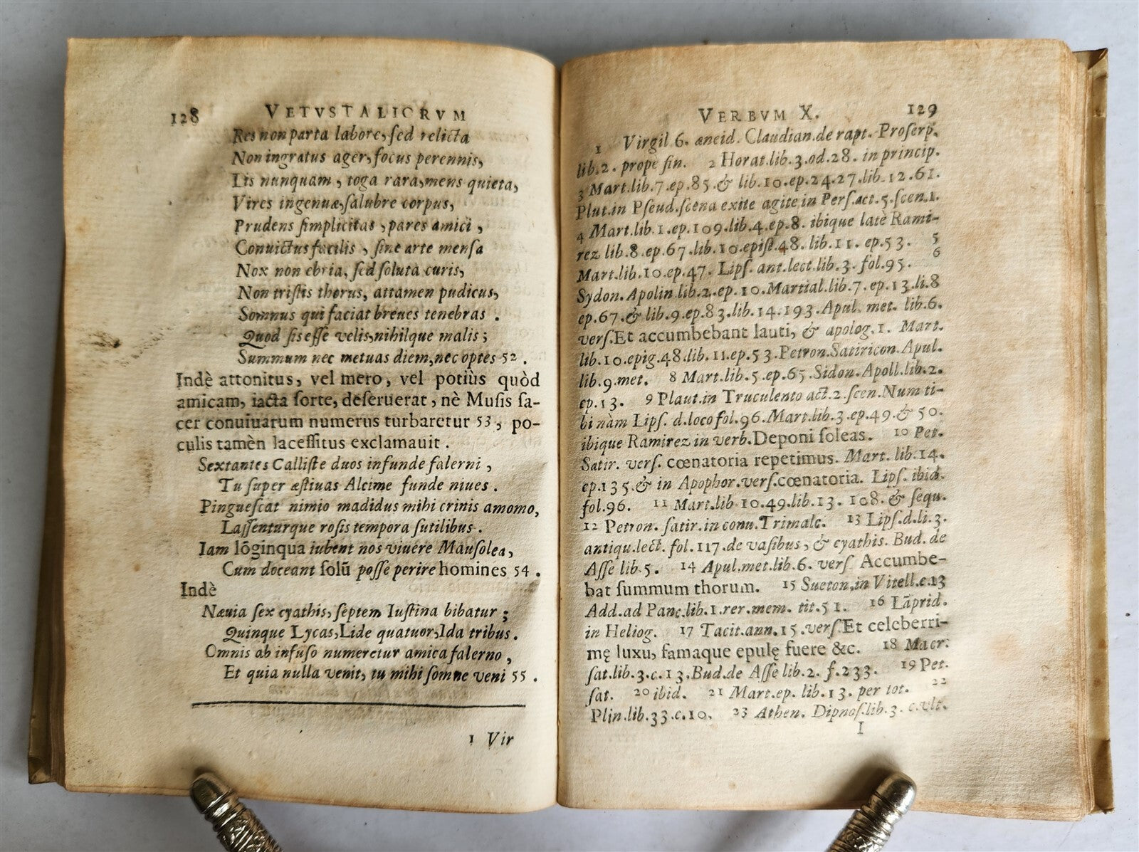 TOLOMEI, FrancescoFRANCISCUS PTOLEMAEUSVetustalia seu vetustatis admiranda quibus Franciscus Ptolomaeus Patric. Sen. In almae urbis Archigymn. Pandect. Interpres.Plurium varietate verborum Lusit. Idibus Novemb. MDCLXIIRome: De Lazzari, 1664Calcographic frontispiece and headpieces, woodcut initials and tailpieces.ToningOriginal vellum, manuscript title on the spine and manuscript on the back of the front cover (with date - 1664)Provenance: Gustavo Camillo Galletti (stamp on the frontispiece)- Horace de Landau (ex libris on the flyleaf)First edition of this study on Roman customs such as theatrical and circus performances, weddings, triumphs, funerals. Size 5 by 7 inchesText in Latin============================