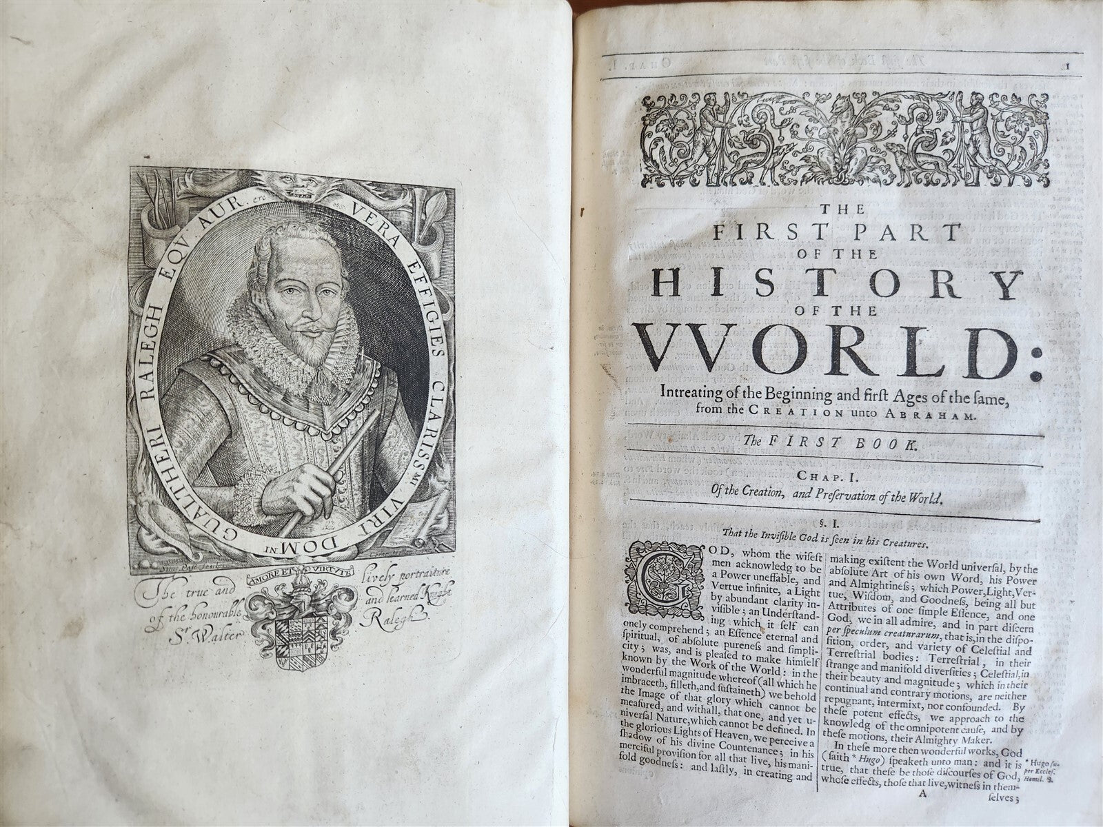 The History of the World In Five Books RALEIGH, Sir Walter.London: Robert White, 1666Present copy without most maps and plates excepting the allegorical title page, and 2 folding battle plans, and author's portrait [61], 1143, [54] pp.Numerous pagination errors. With engraved allegorical title page, 2 folding battle plans, portrait of author, head-pieces,title page in red and black. Paneled cat's paw calf boards rebacked in later sheep, morocco lettering piece on spine, raised bands.Sir Walter Raleigh's renowned unfinished world history, first published in 1614, beginning with the Creation ending at the time of Roman ascendancy, written while he was imprisoned in the Tower of London. Ownership marks on title page.Binding worn, joints cracked or starting, corners bumped; one repaired leaf in table of contents, repaired tear to frontispiece (not affecting image),a few chips and tears to leaves, binding cracked internally with all thongs split but two, textblock broken Folio: 9 by 14"Text in English======================================="The success of Raleigh’s History can perhaps be explained by the very fact that it is not a work of history in the academic sense but a political tract of immediate applicability. Its author embodied all the glories of the reign of Elizabeth I, which at the time of publication had already begun to be transfigured into a golden age Raleigh can be taken as the epitome of the Elizabethan idea of courtier and politician, sailor and explorer, writer and poet He was among the first Englishmen to envisage clearly that the Americas should be the principal goal of English overseas expansion The reversal of Elizabeth’s policy by James I encompassed Raleigh’s ruin He finally fell a victim to James’s pro-Spanish inclinations, and the last Elizabethan died by the executioner’s axe" (PMM 117).=======================================Please see my other auctions Thank You