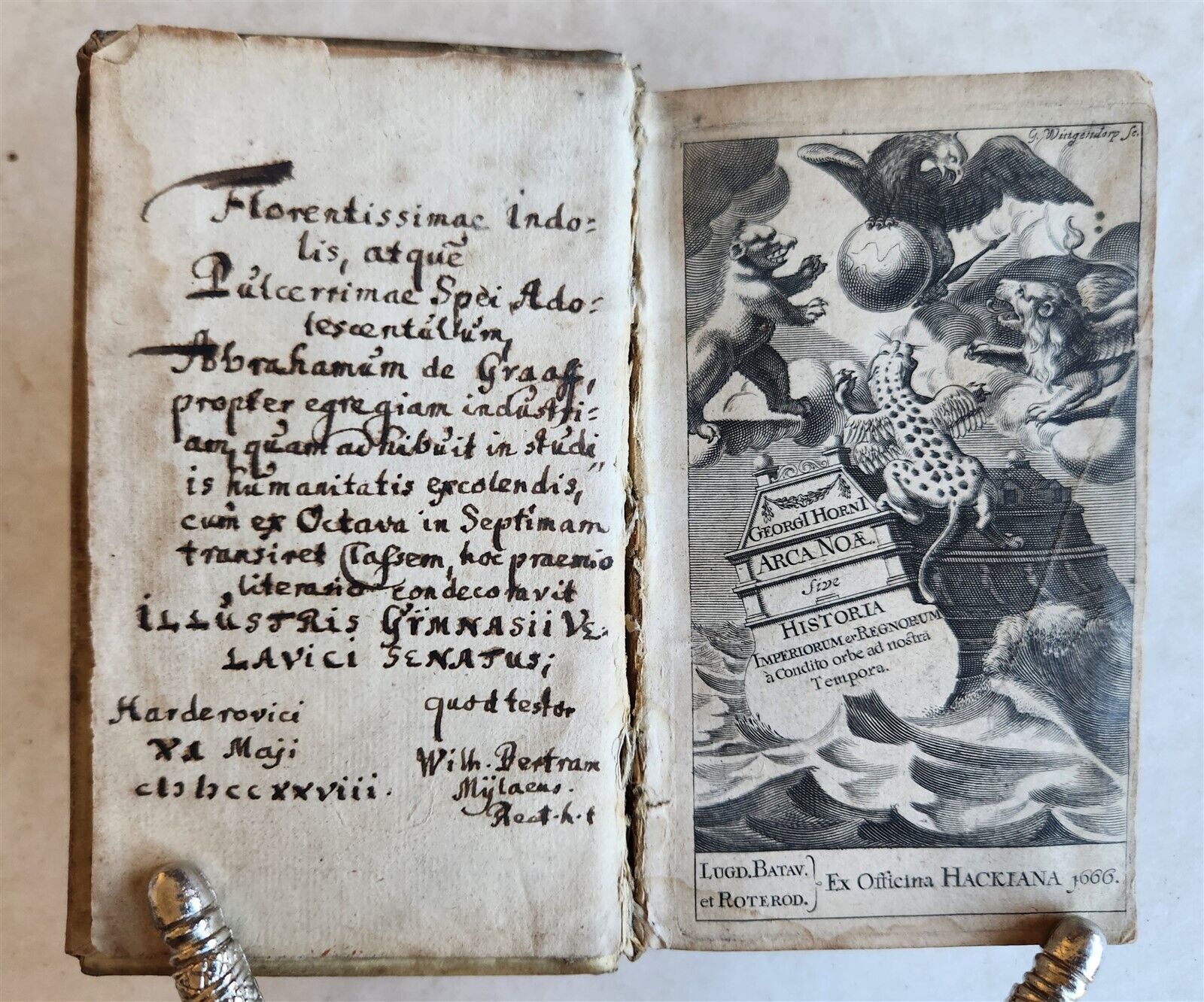 Georg Horn (1620-1670)Arca Noae sive Historia Imperiorum et Regnorum... (Noah's Ark or the History of Empires and Kingdoms...)Lyon and Rotterdam; 1666History of the empires and kingdoms from the beginning of the world to the author's timeFull vellum binding with blind-stamped coat of arms of Haderwijk (Netherlands) on both covers.Size 3 by 5 1/4"Preface, 548 pp., extensive IndexGood condition, a few leaves with marginal dampstainText in Latin=====================Please see my other auctions Thank You